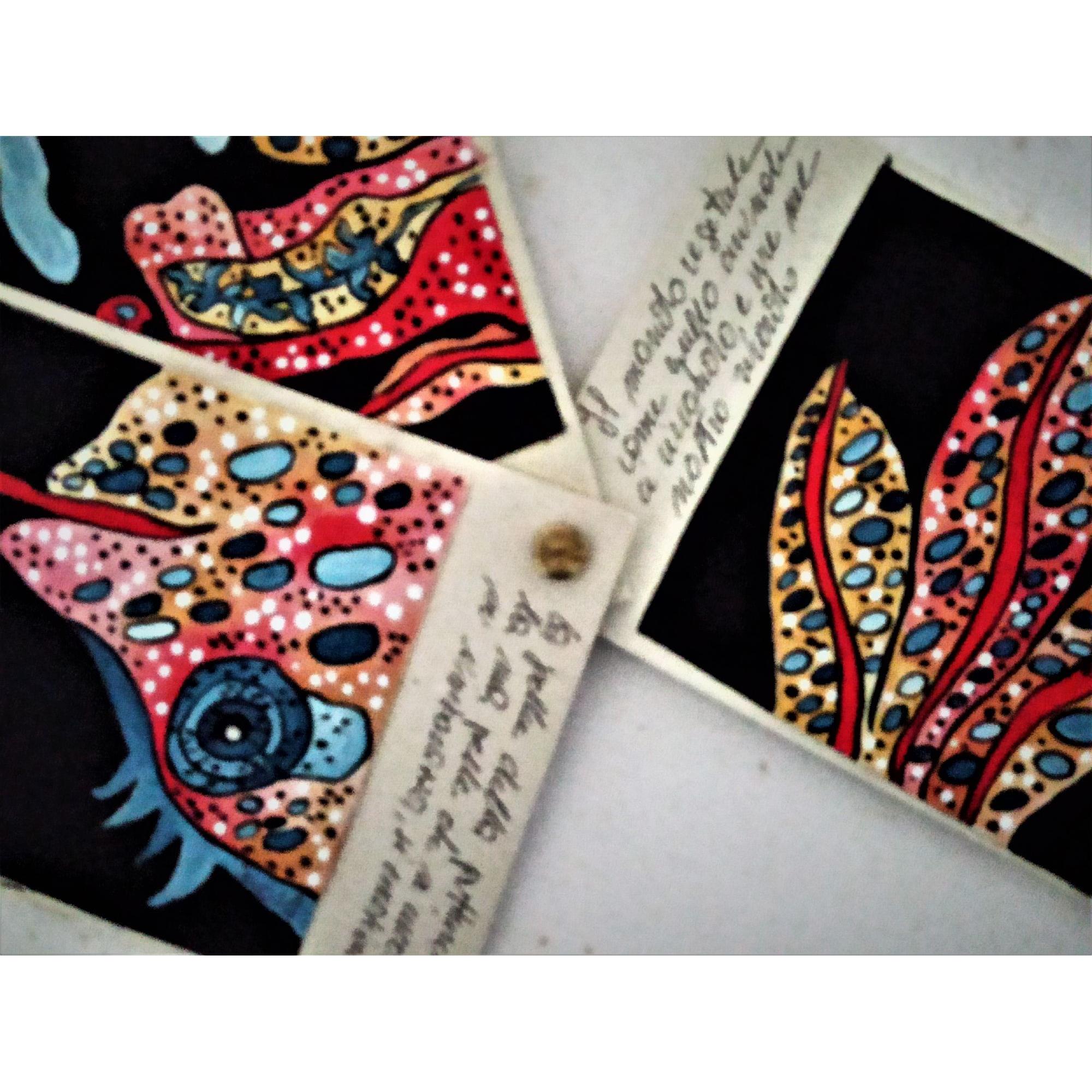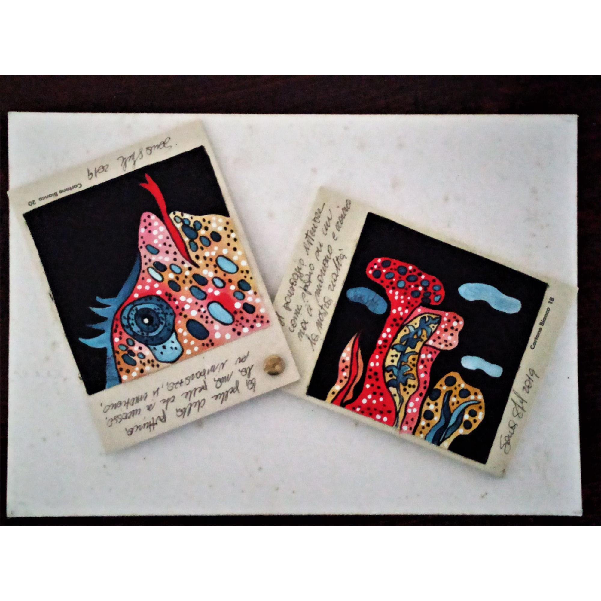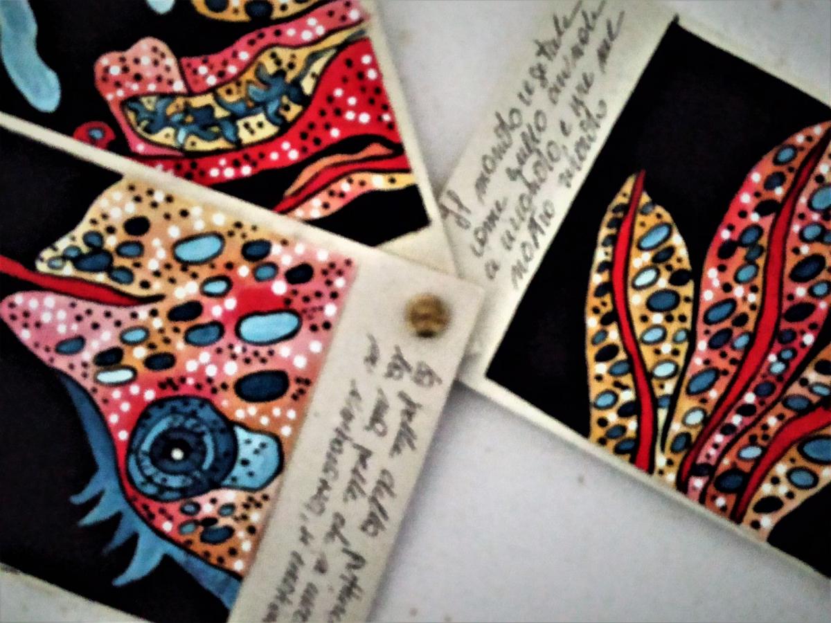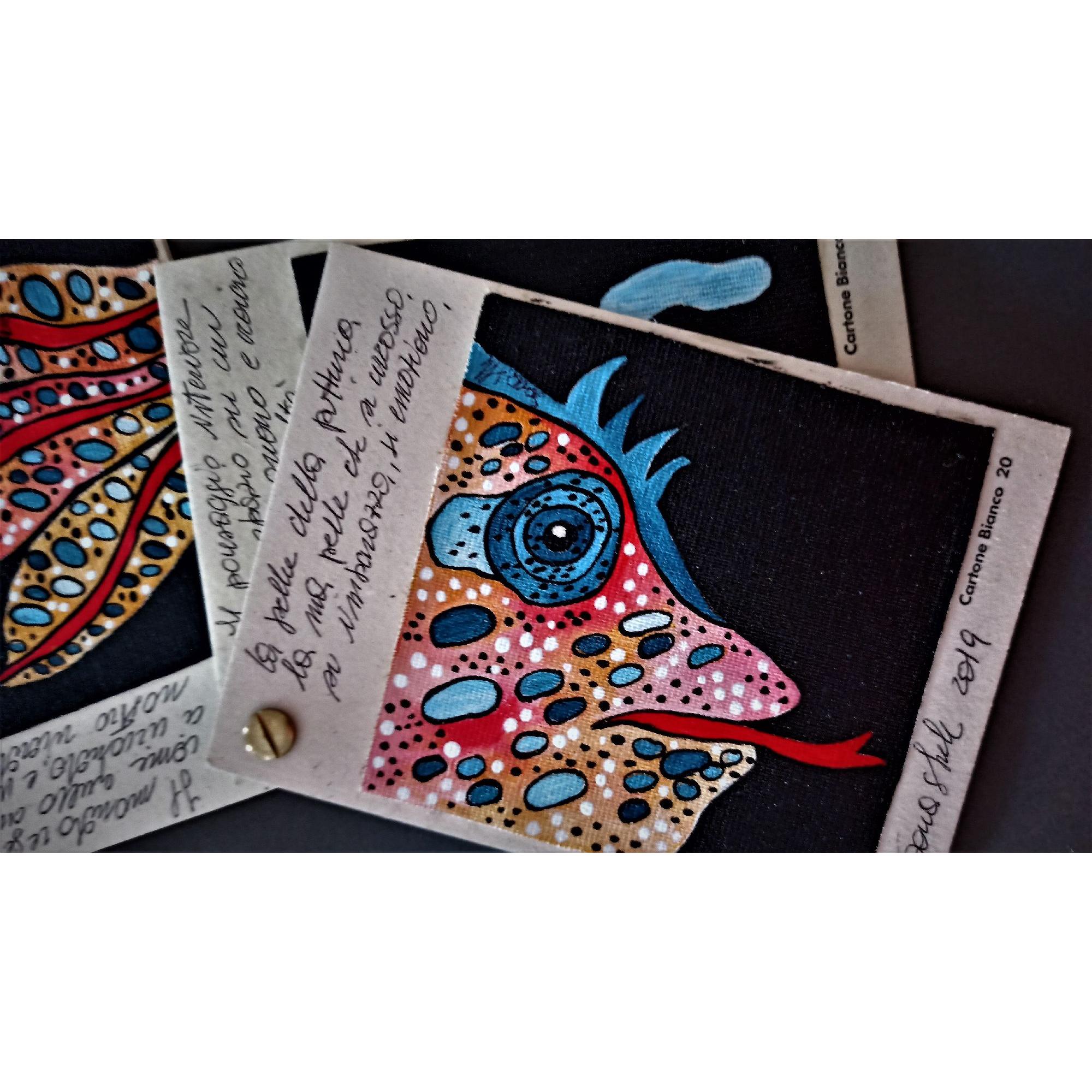 Questo piccolo libricino è stato realizzato dipingendo su piccoli pezzi di tela , applicati poi su del cartone molto rigido e spesso che ruotano attorno ad un perno, che permette di sfogliare le immagini , è costituito da tre pagine con anche delle frasi che sono delle riflessioni dell' artista.