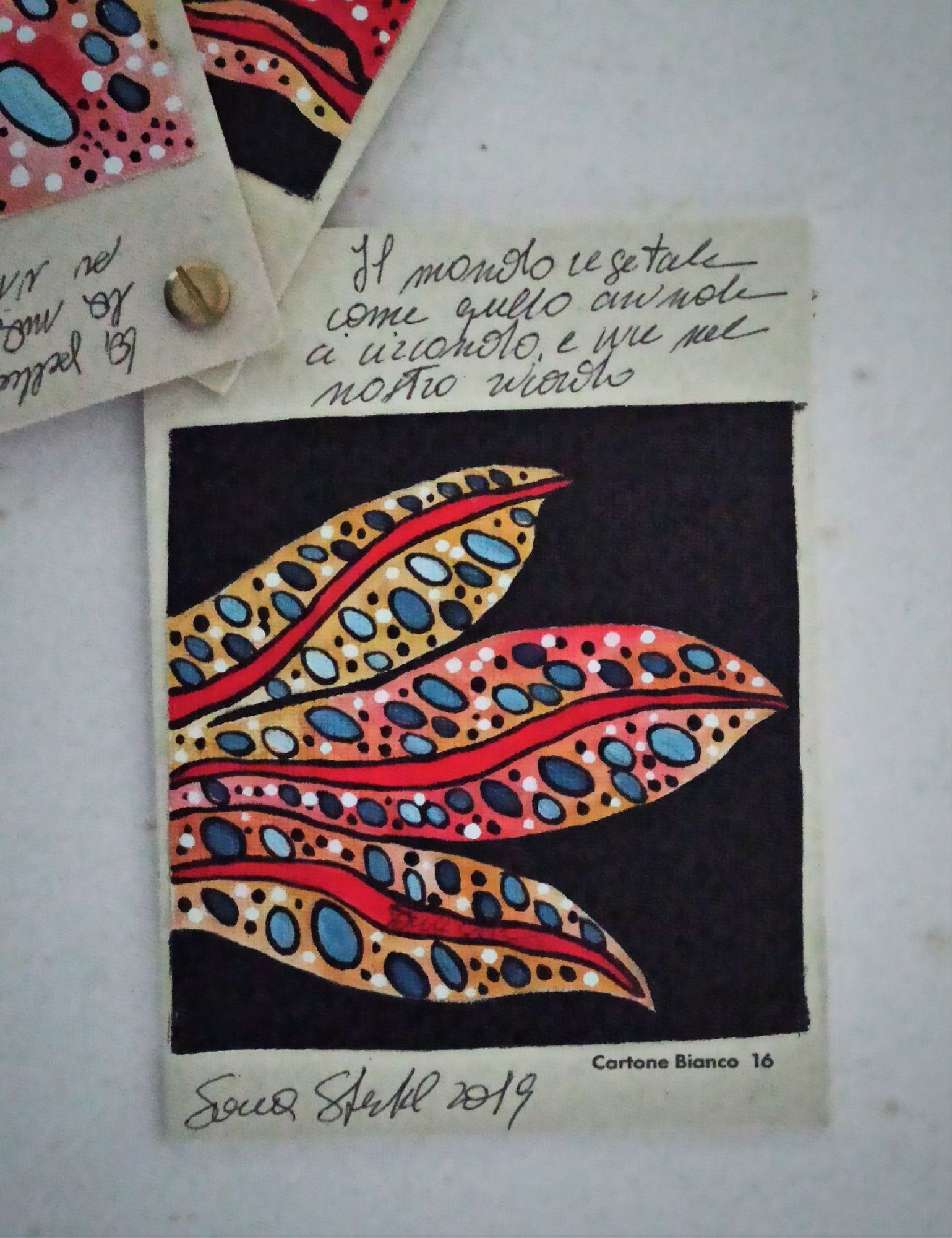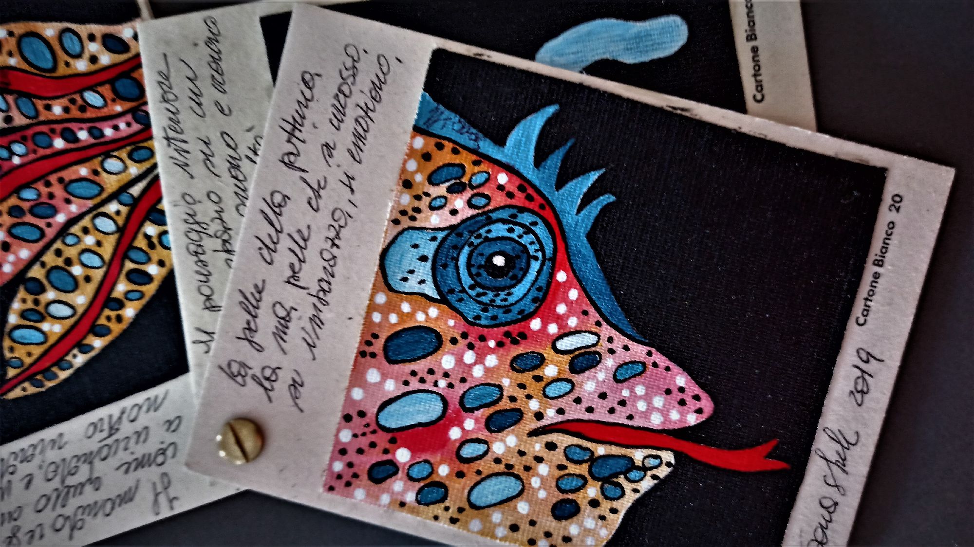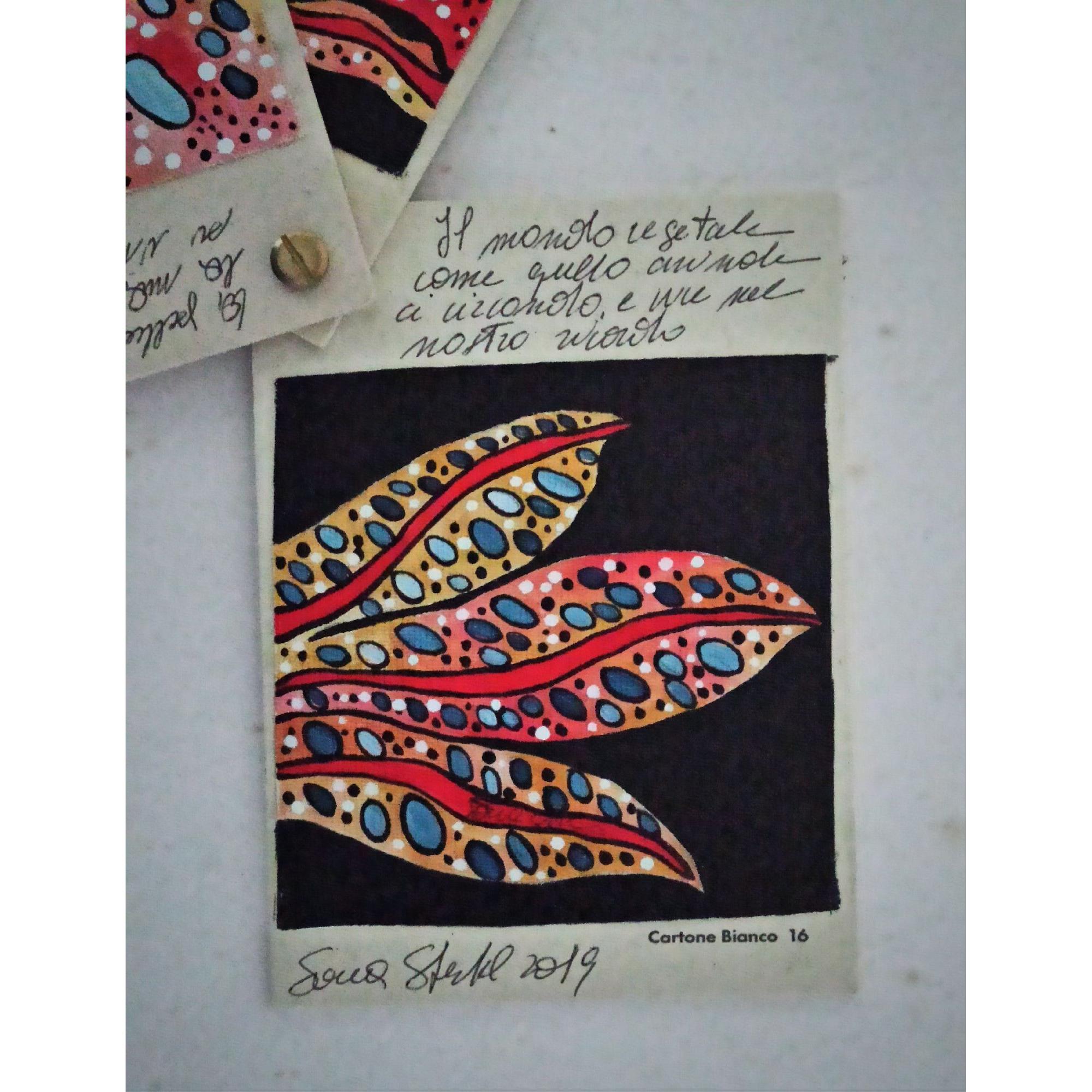 Questo piccolo libricino è stato realizzato dipingendo su piccoli pezzi di tela , applicati poi su del cartone molto rigido e spesso che ruotano attorno ad un perno, che permette di sfogliare le immagini , è costituito da tre pagine con anche delle frasi che sono delle riflessioni dell' artista.