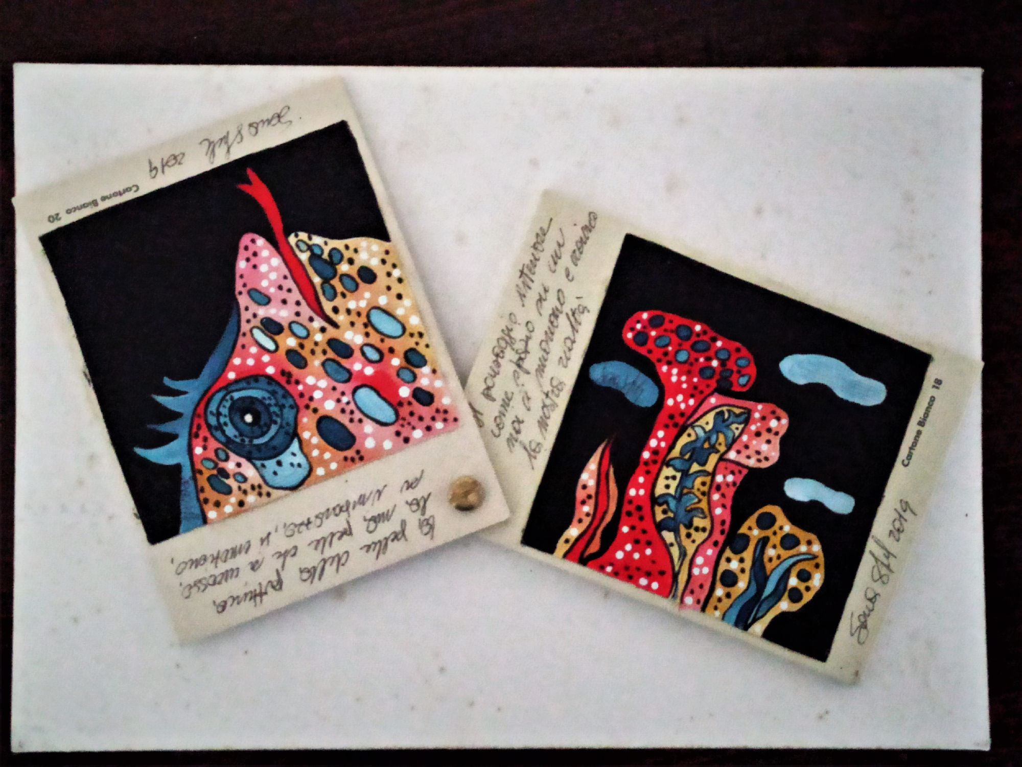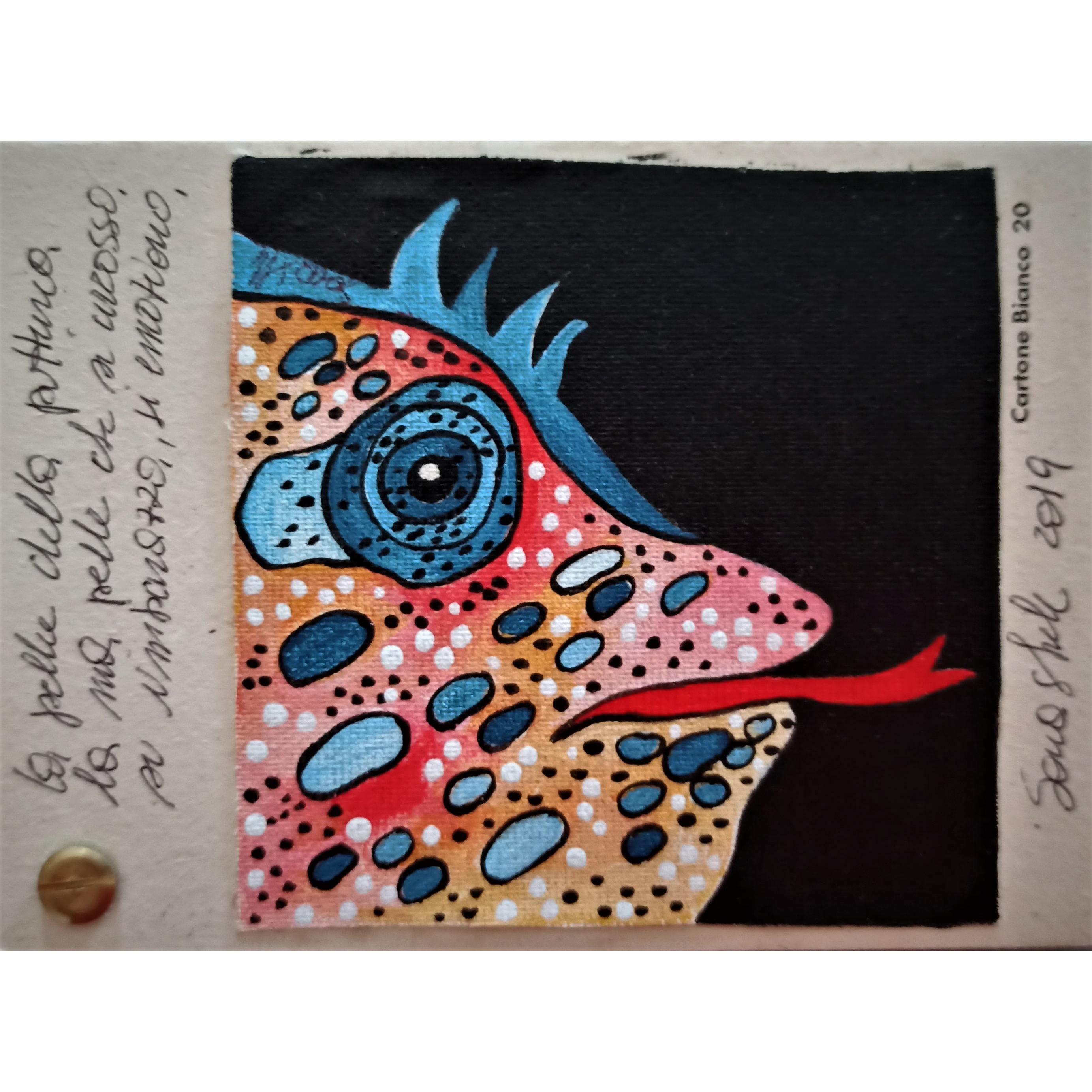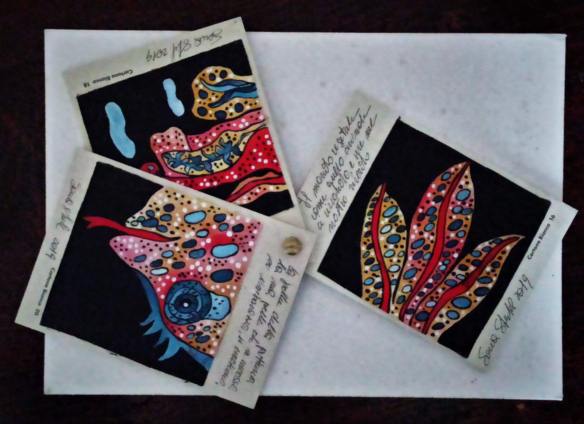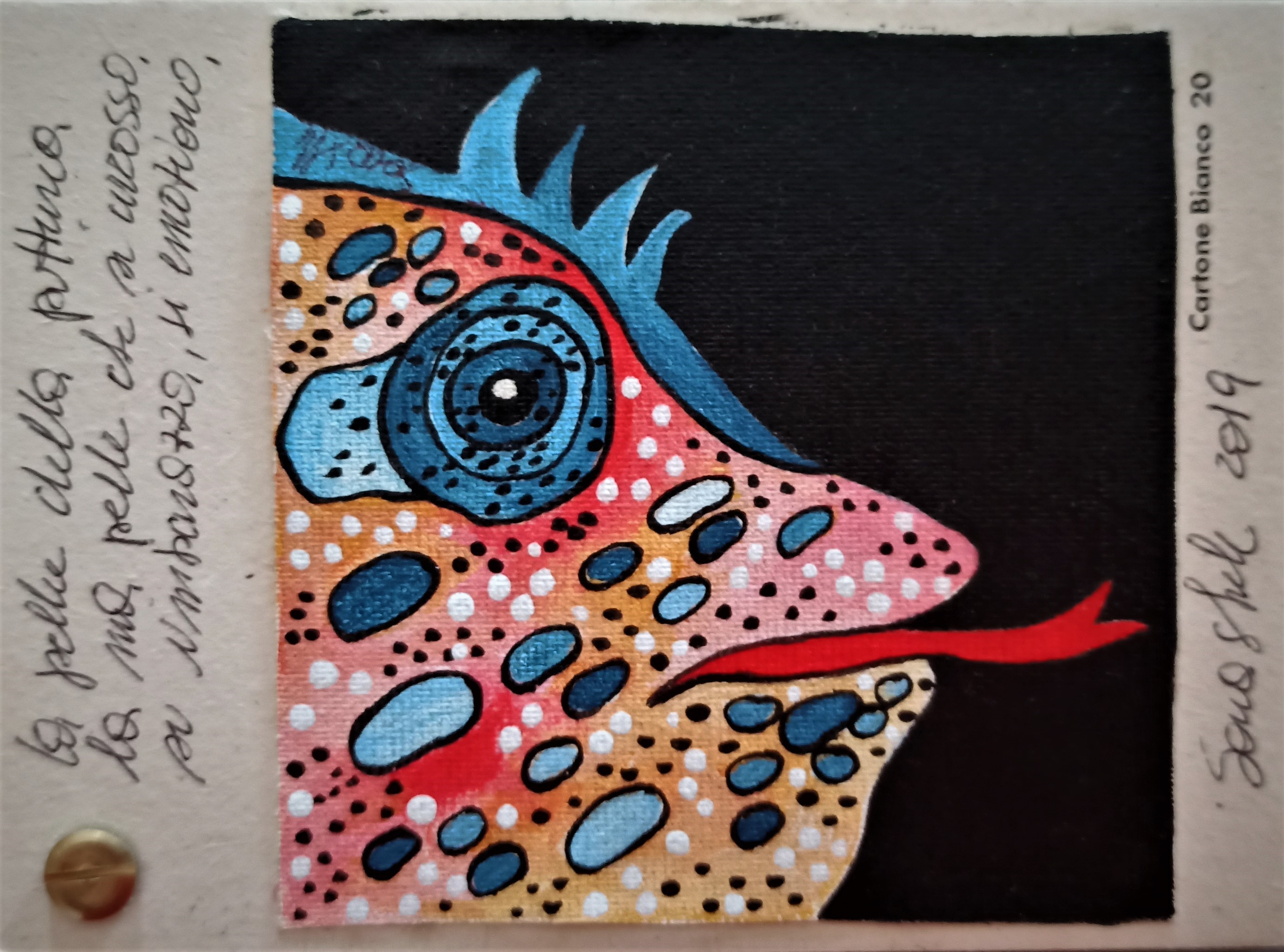 Questo piccolo libricino è stato realizzato dipingendo su piccoli pezzi di tela , applicati poi su del cartone molto rigido e spesso che ruotano attorno ad un perno, che permette di sfogliare le immagini , è costituito da tre pagine con anche delle frasi che sono delle riflessioni dell' artista.