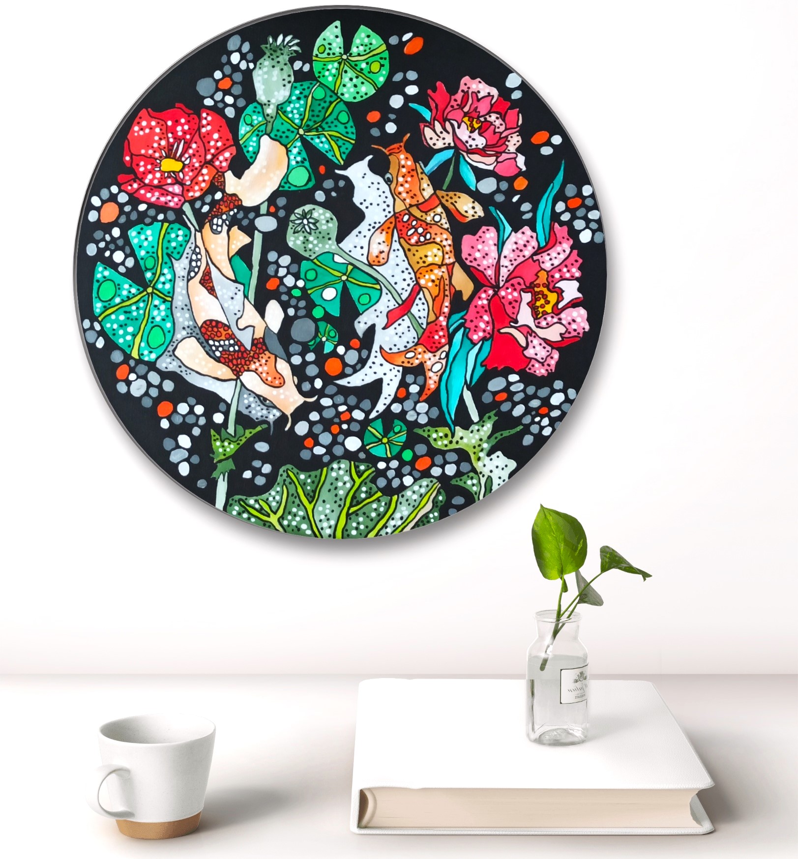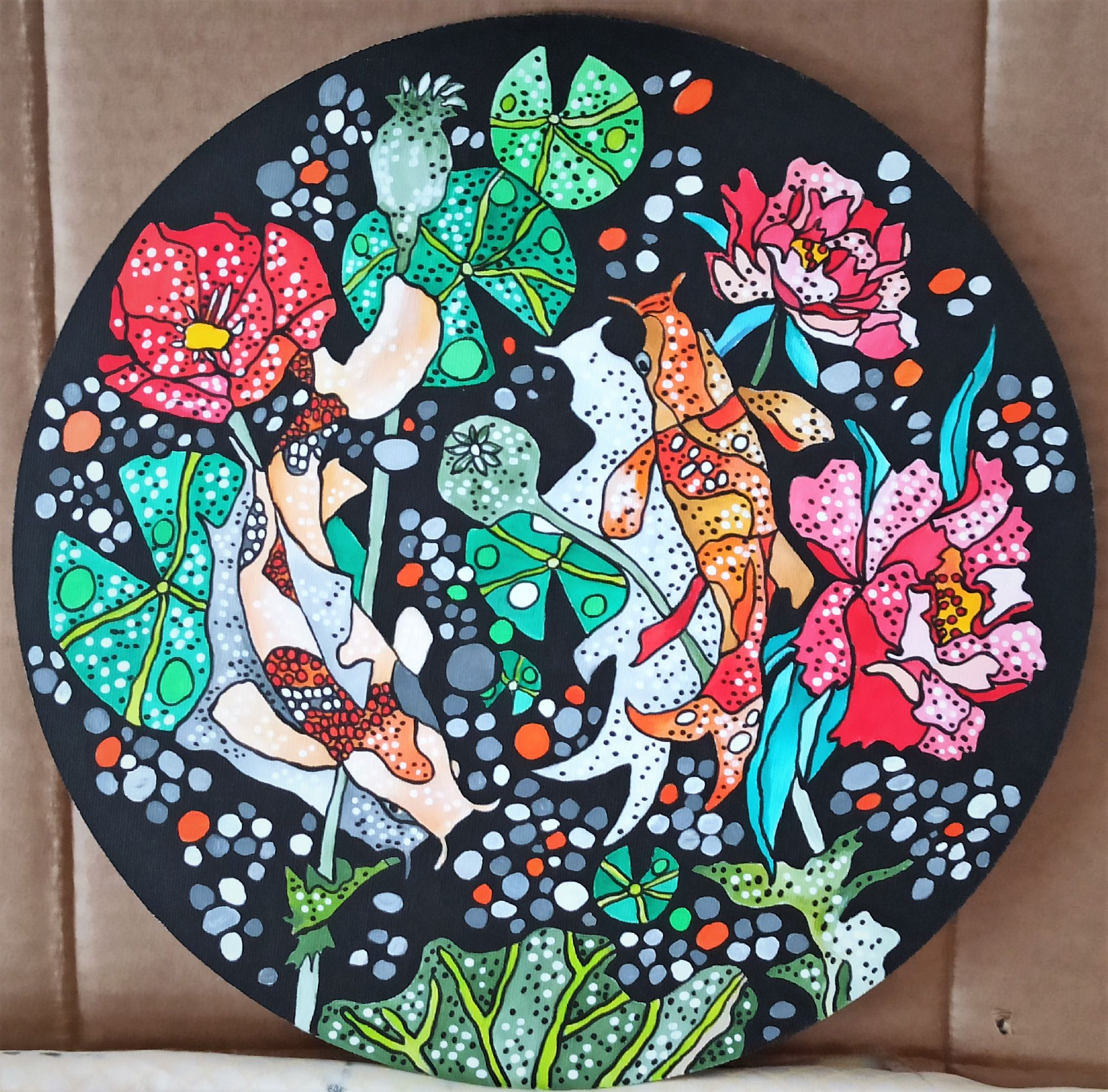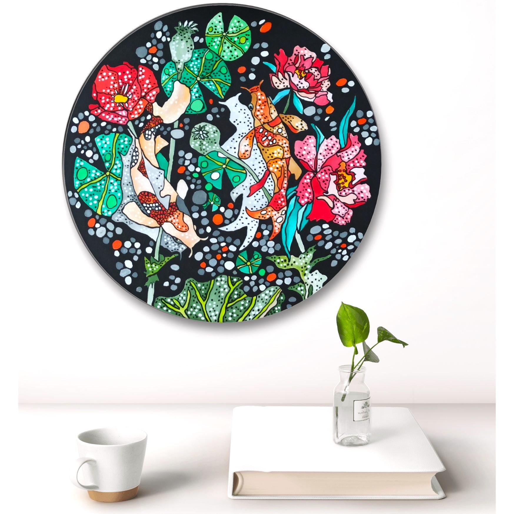 Piccolo quadro realizzato su cartone telato rotondo, raffigura delle carpe giapponesi koi viste dall' alto mentre nuotano in un laghetto