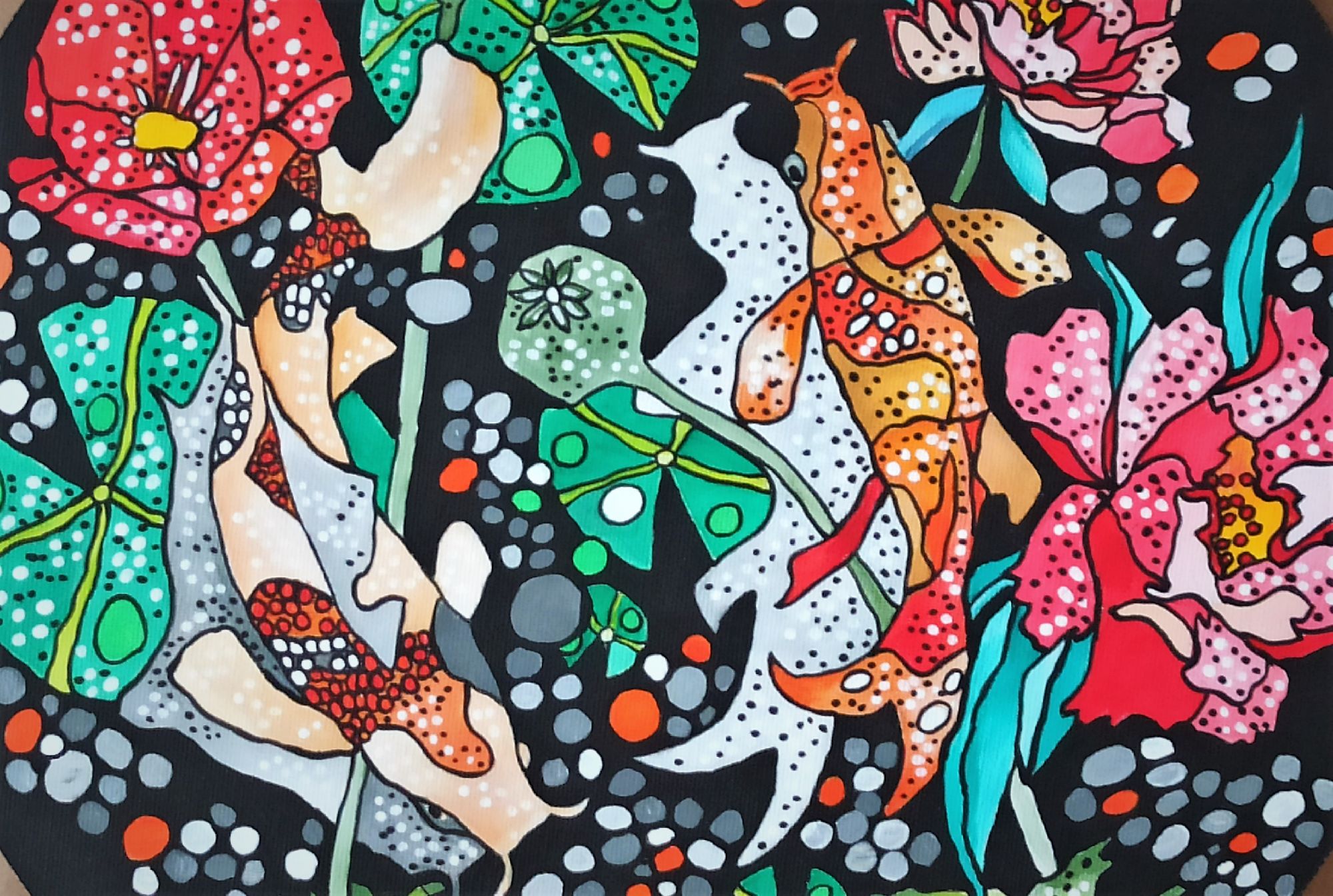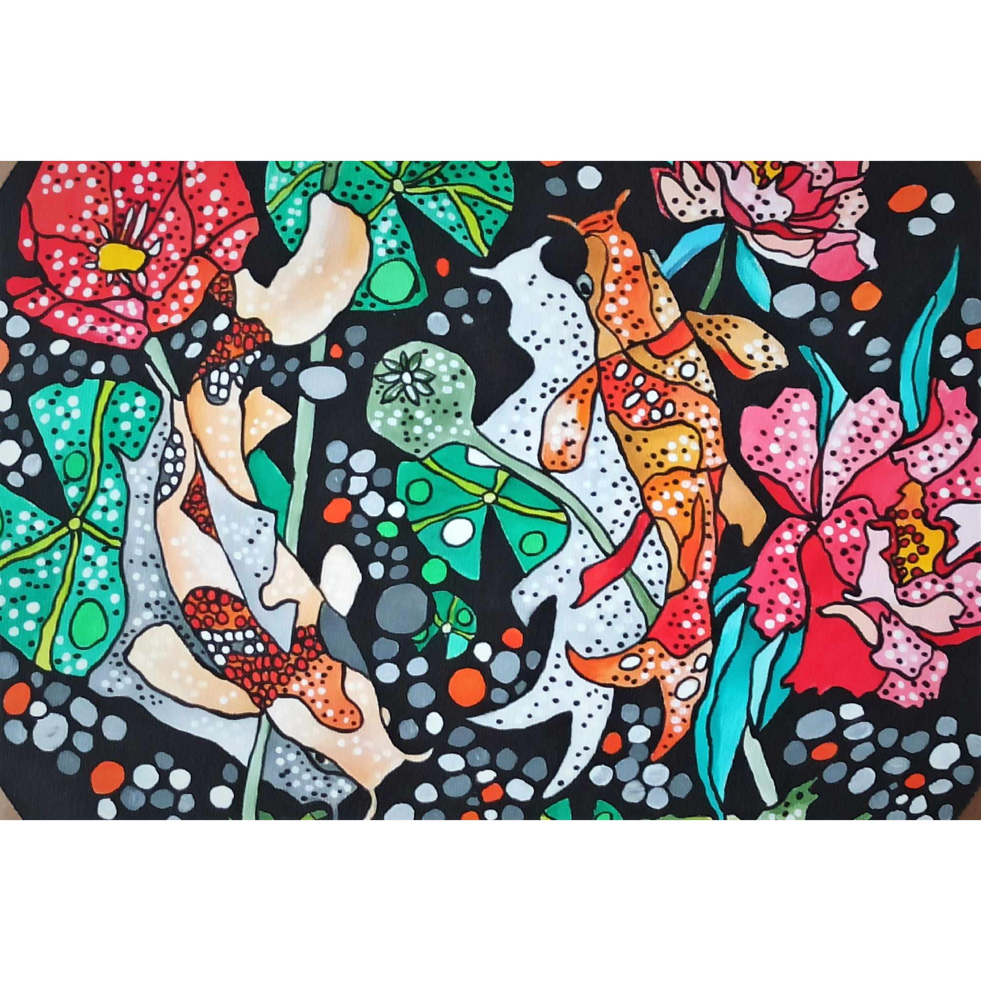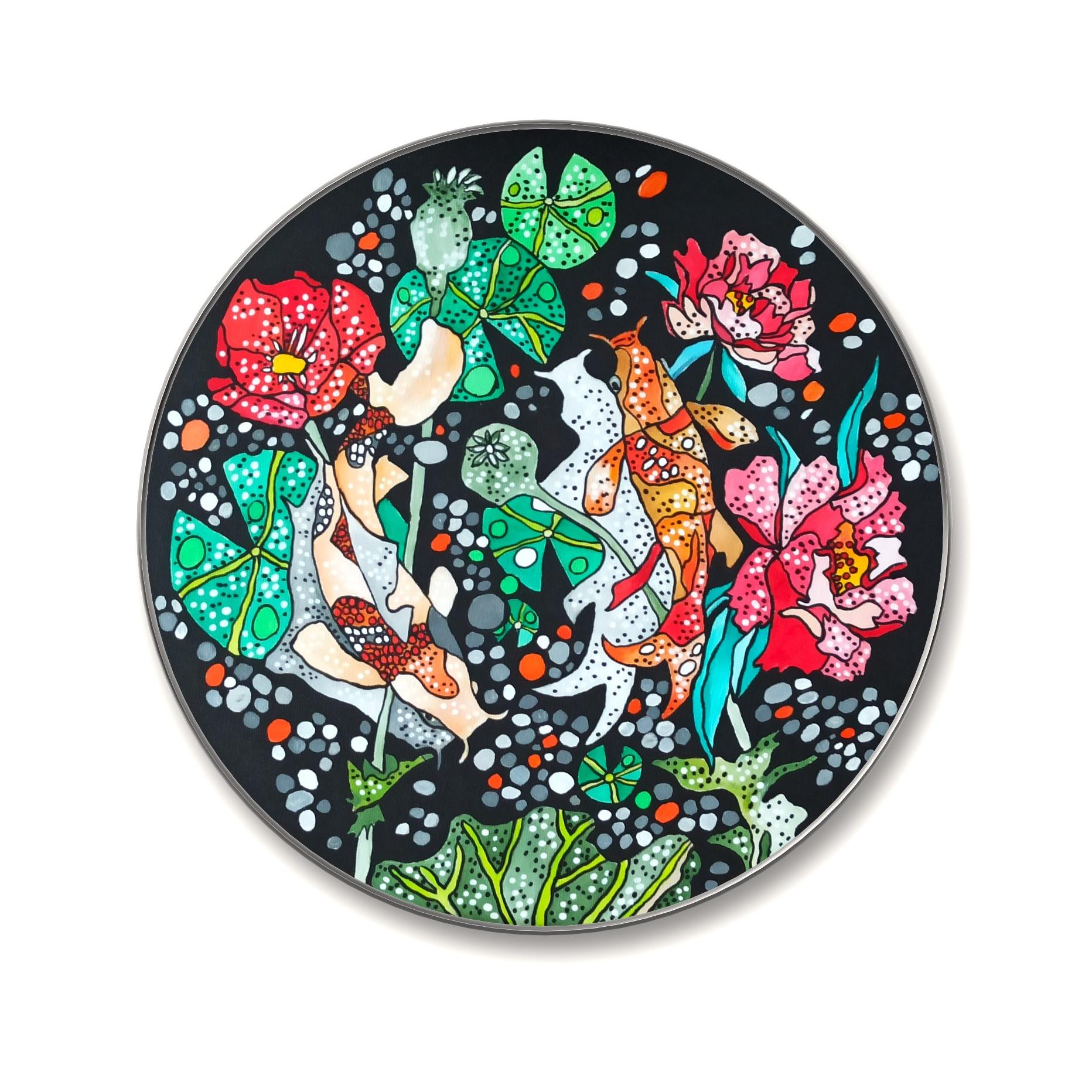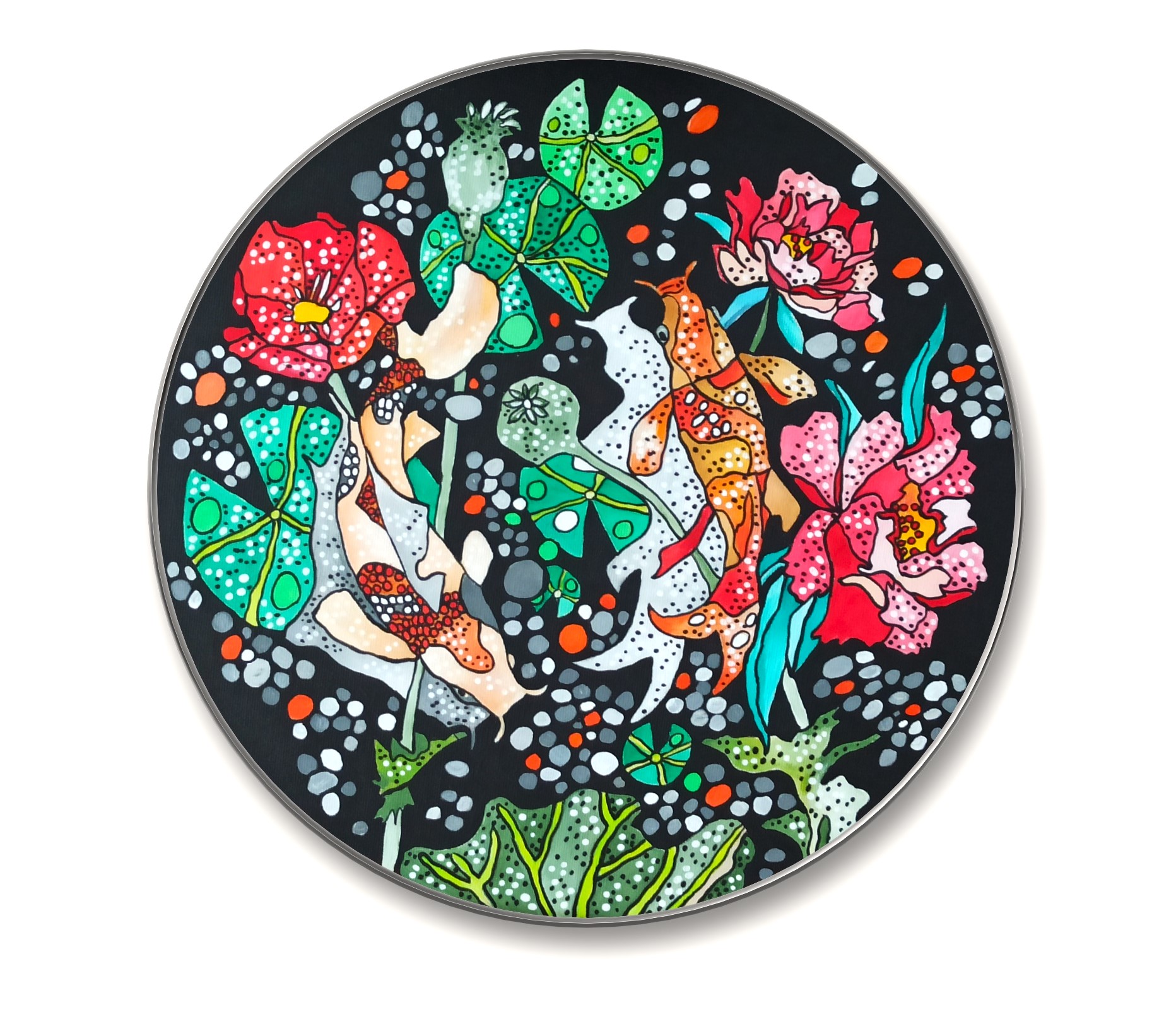 Piccolo quadro realizzato su cartone telato rotondo, raffigura delle carpe giapponesi koi viste dall' alto mentre nuotano in un laghetto