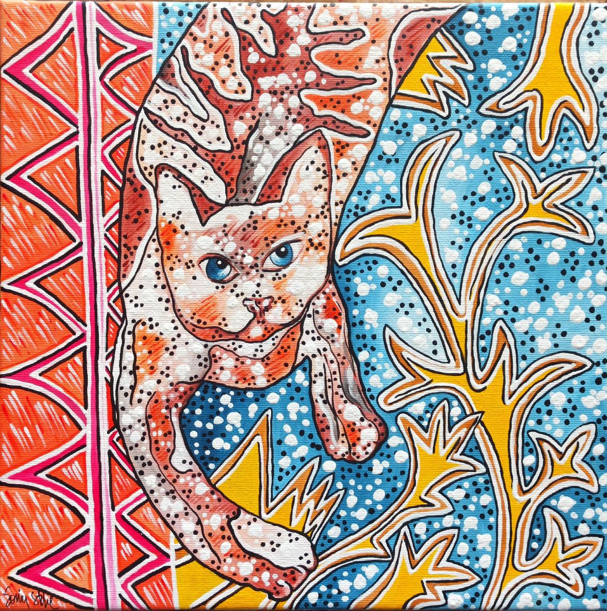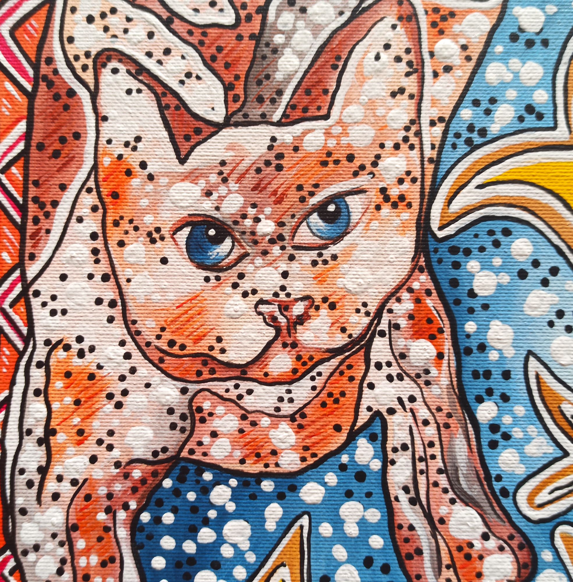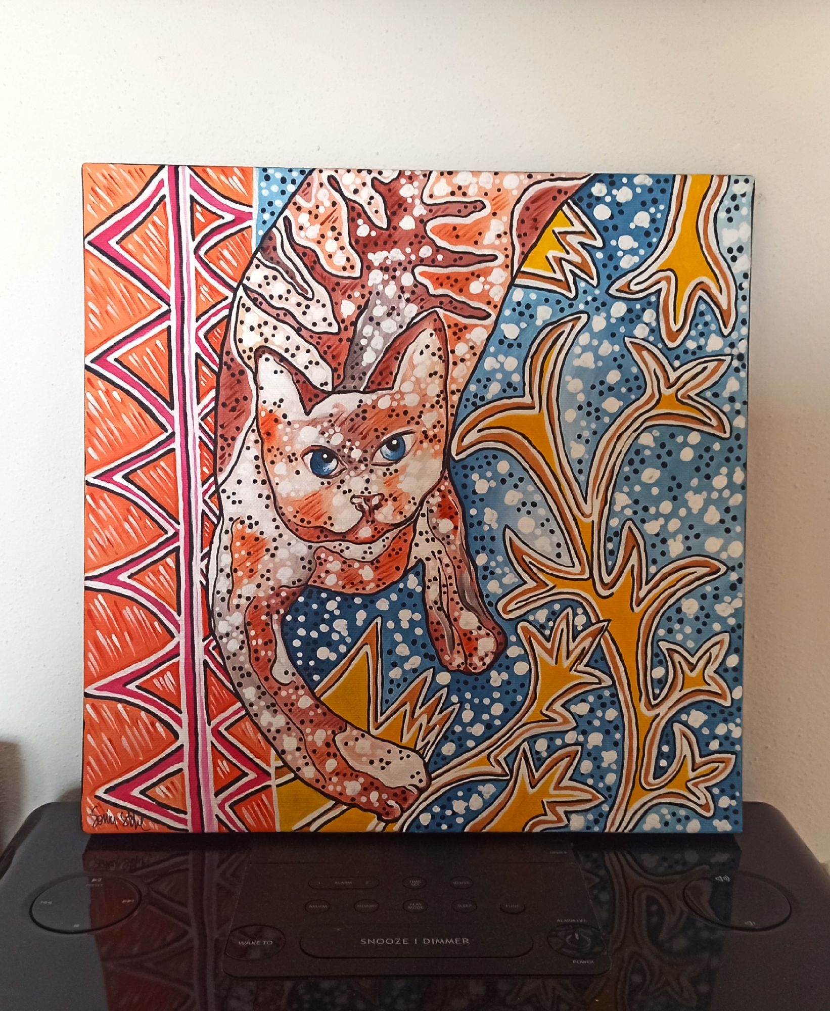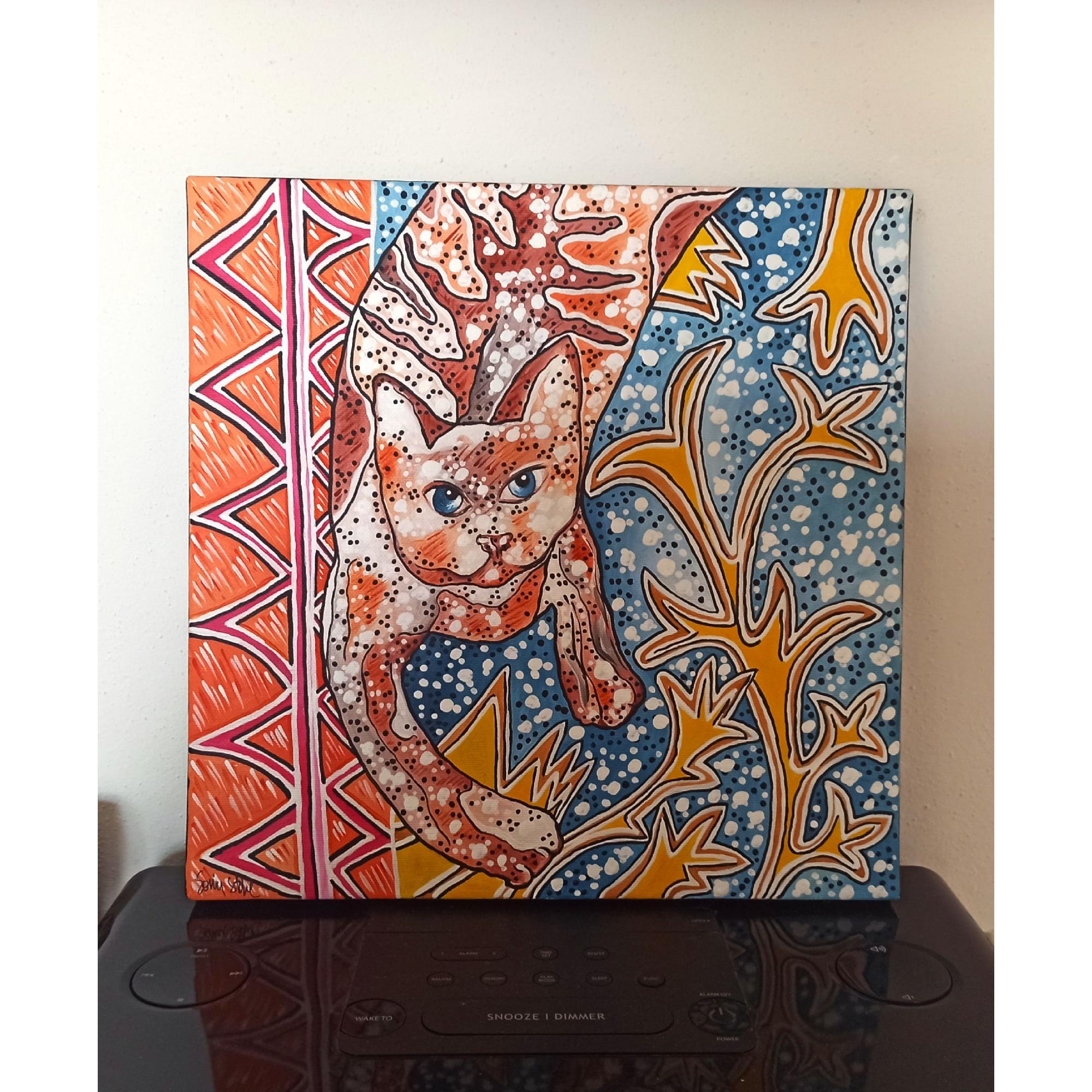 Questo quadro raffigura un gatto in un ambiente domestico, sdraiato su un tappeto che ci guarda con uno sguardo ammaliatore