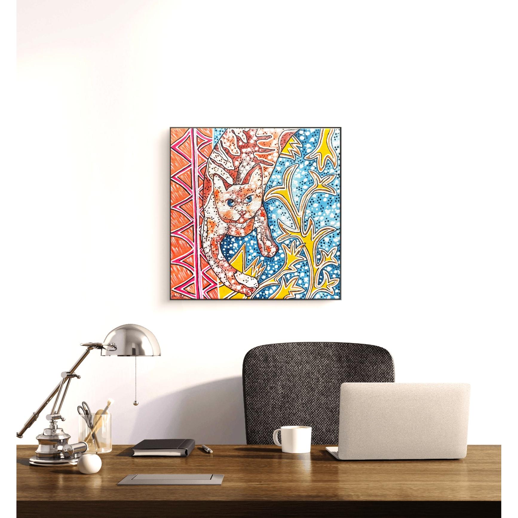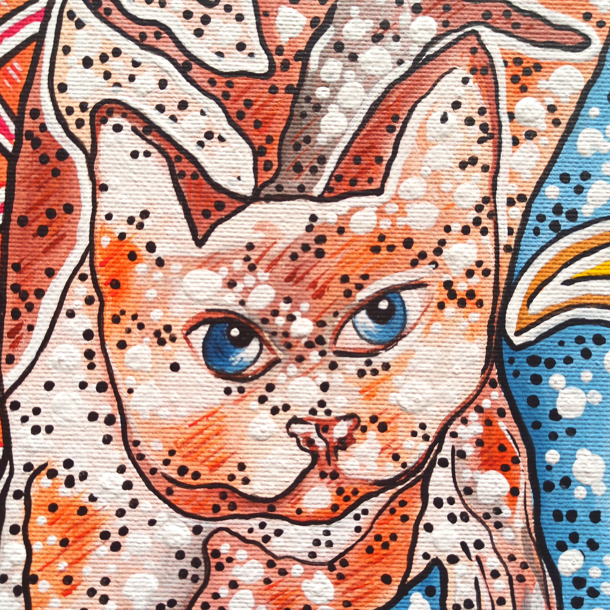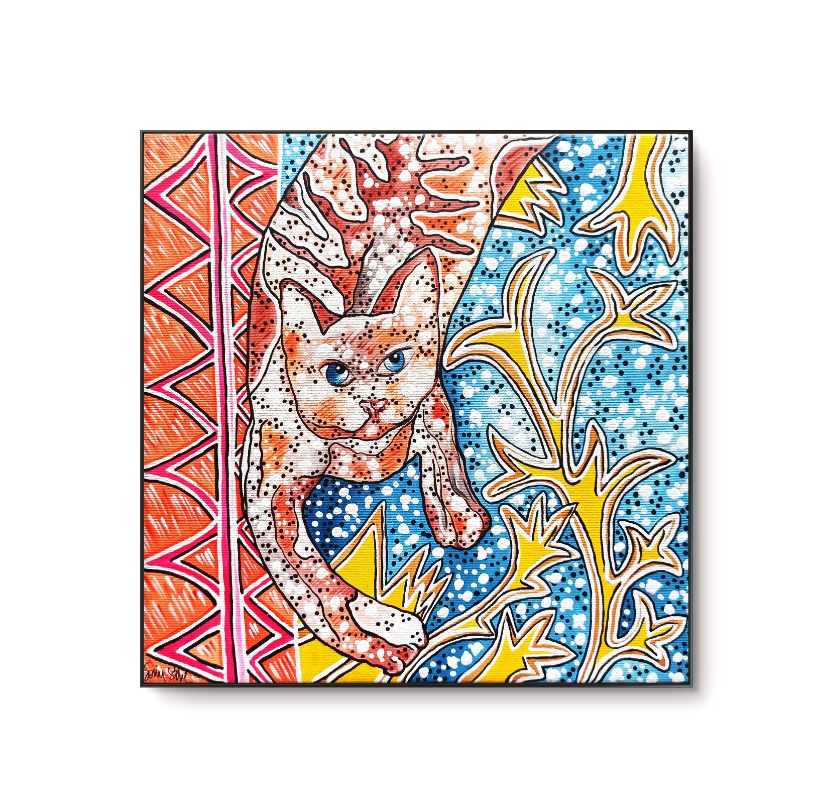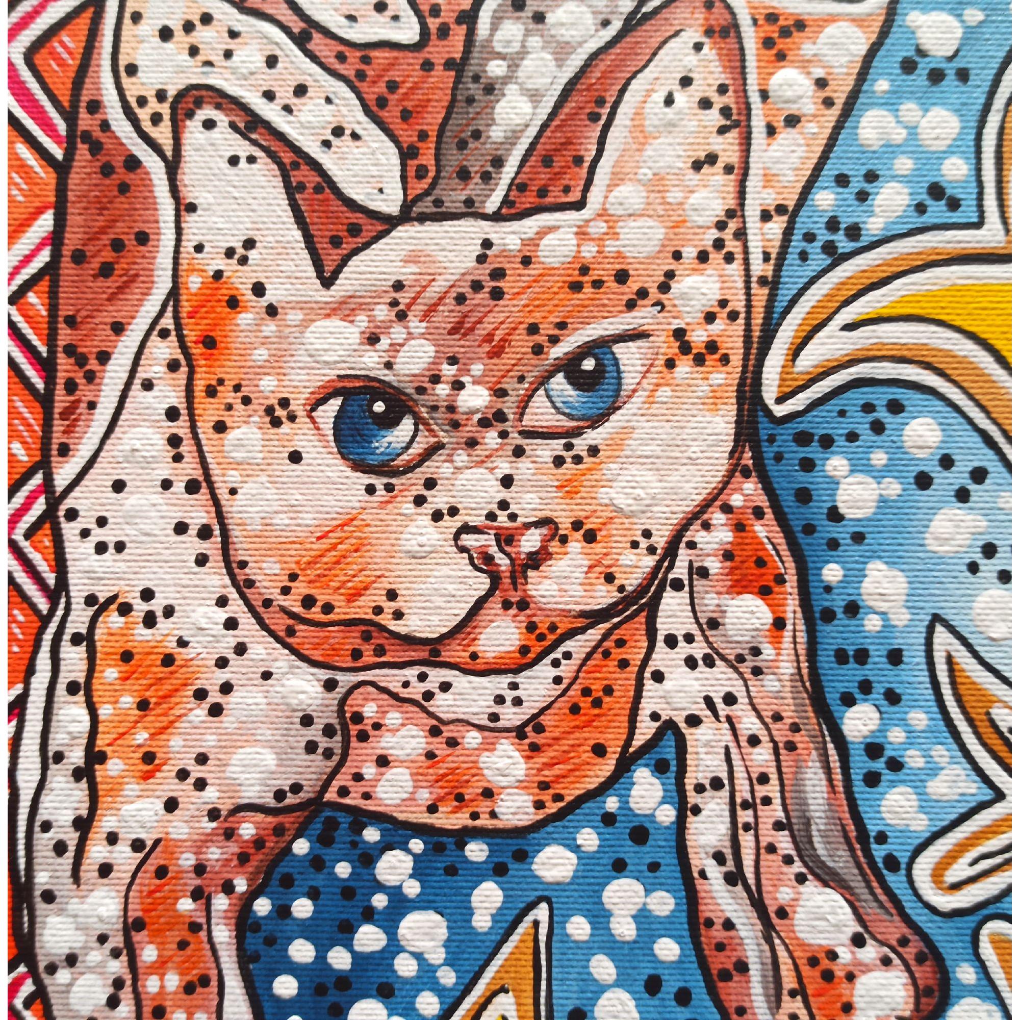 Questo quadro raffigura un gatto in un ambiente domestico, sdraiato su un tappeto che ci guarda con uno sguardo ammaliatore