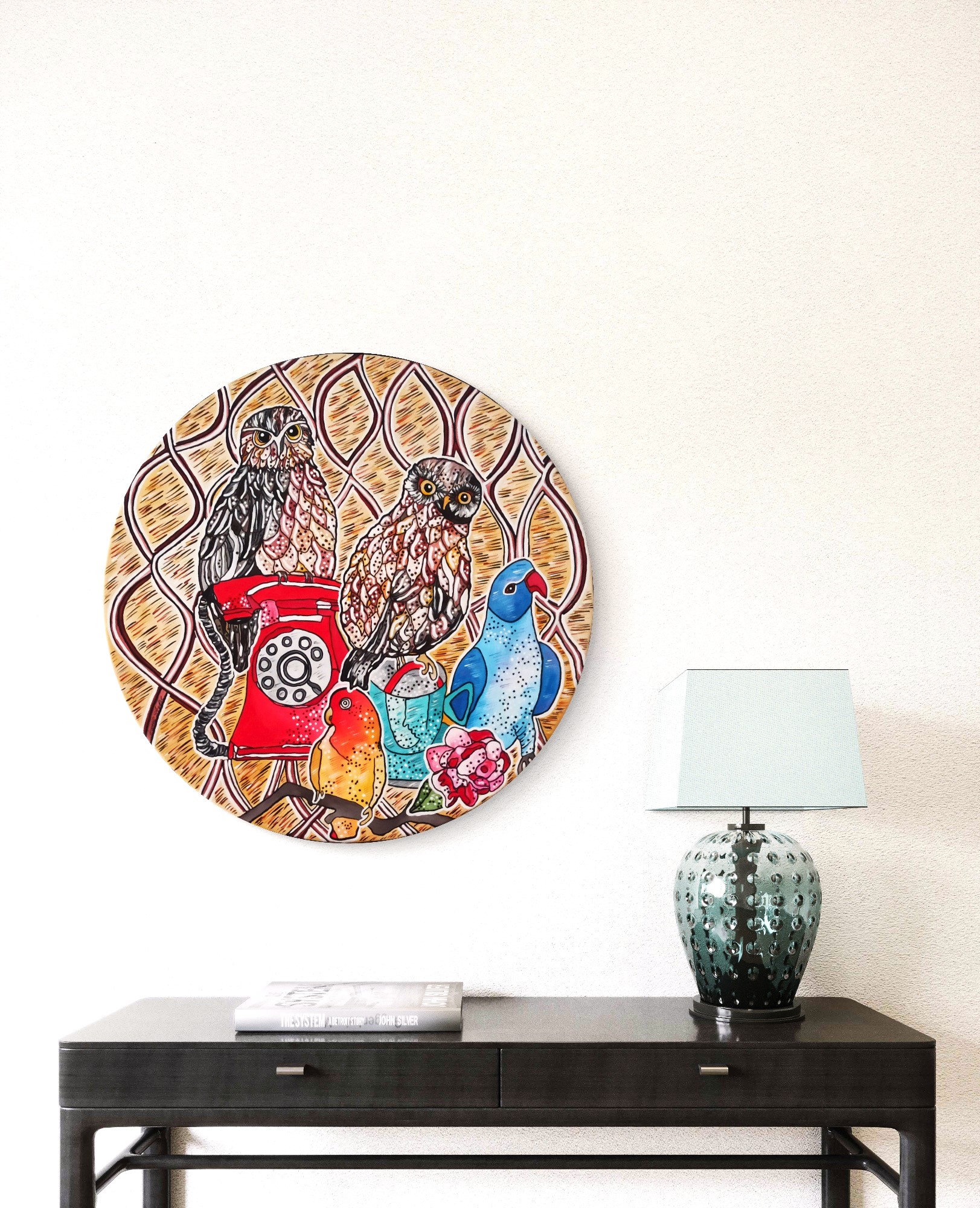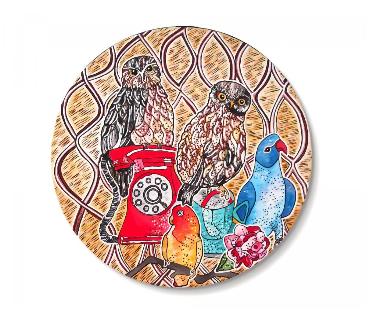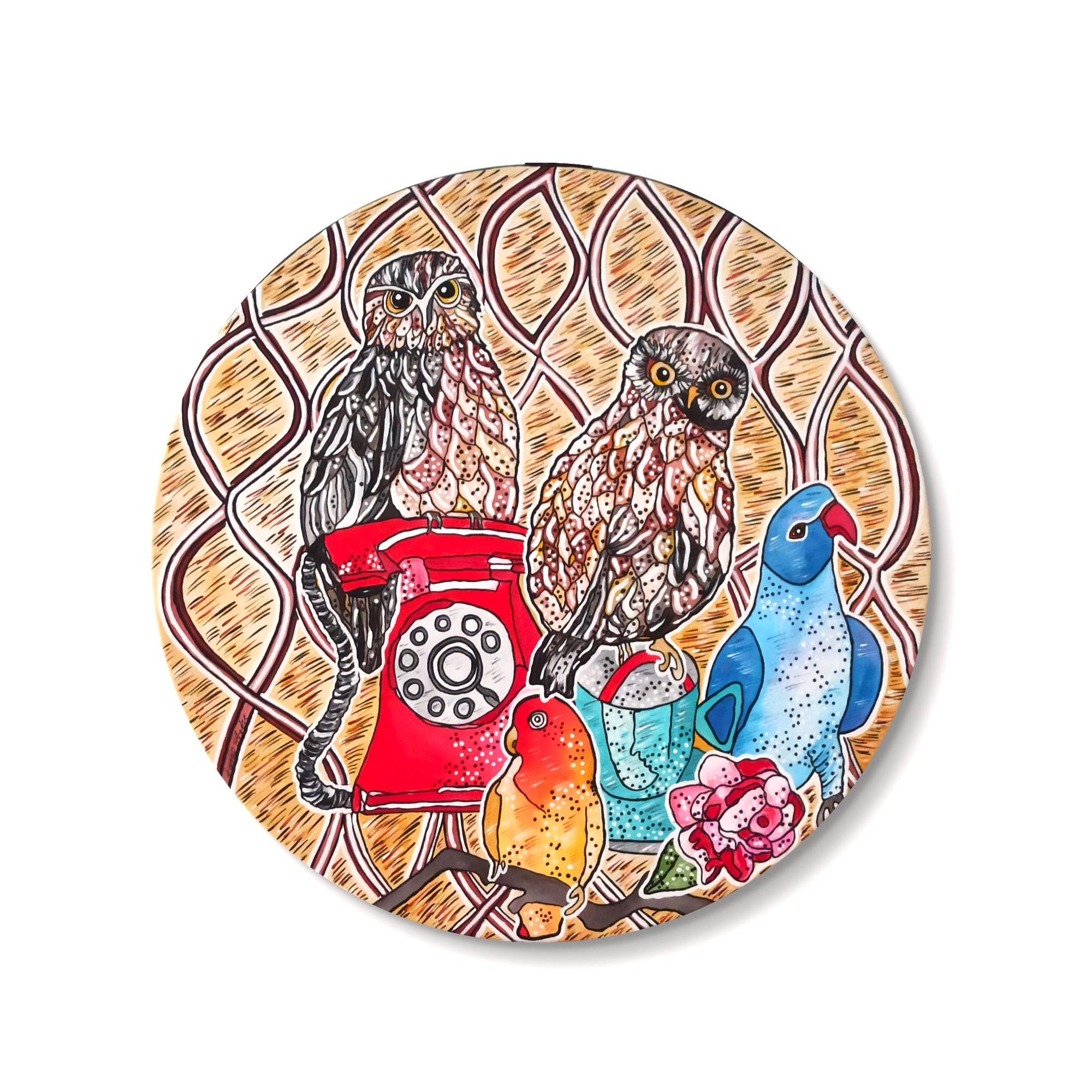 COMPOSIZIONE PAPPAGALLI CIVETTE E TELEFONO NATURA VIVA