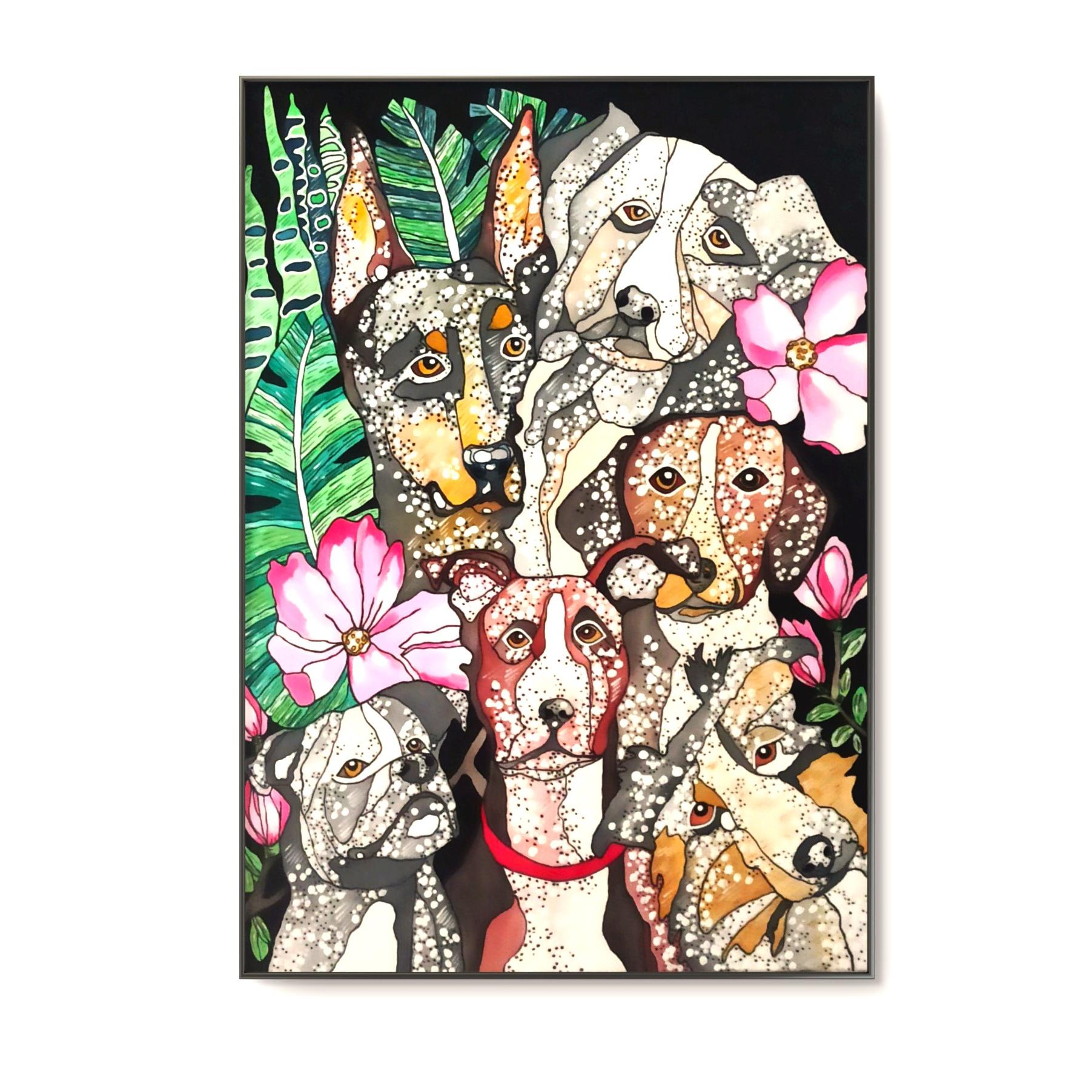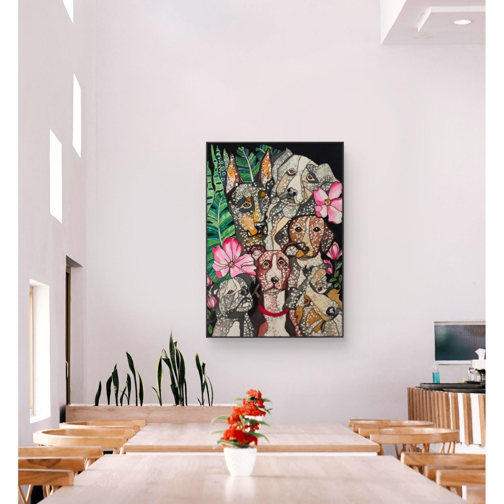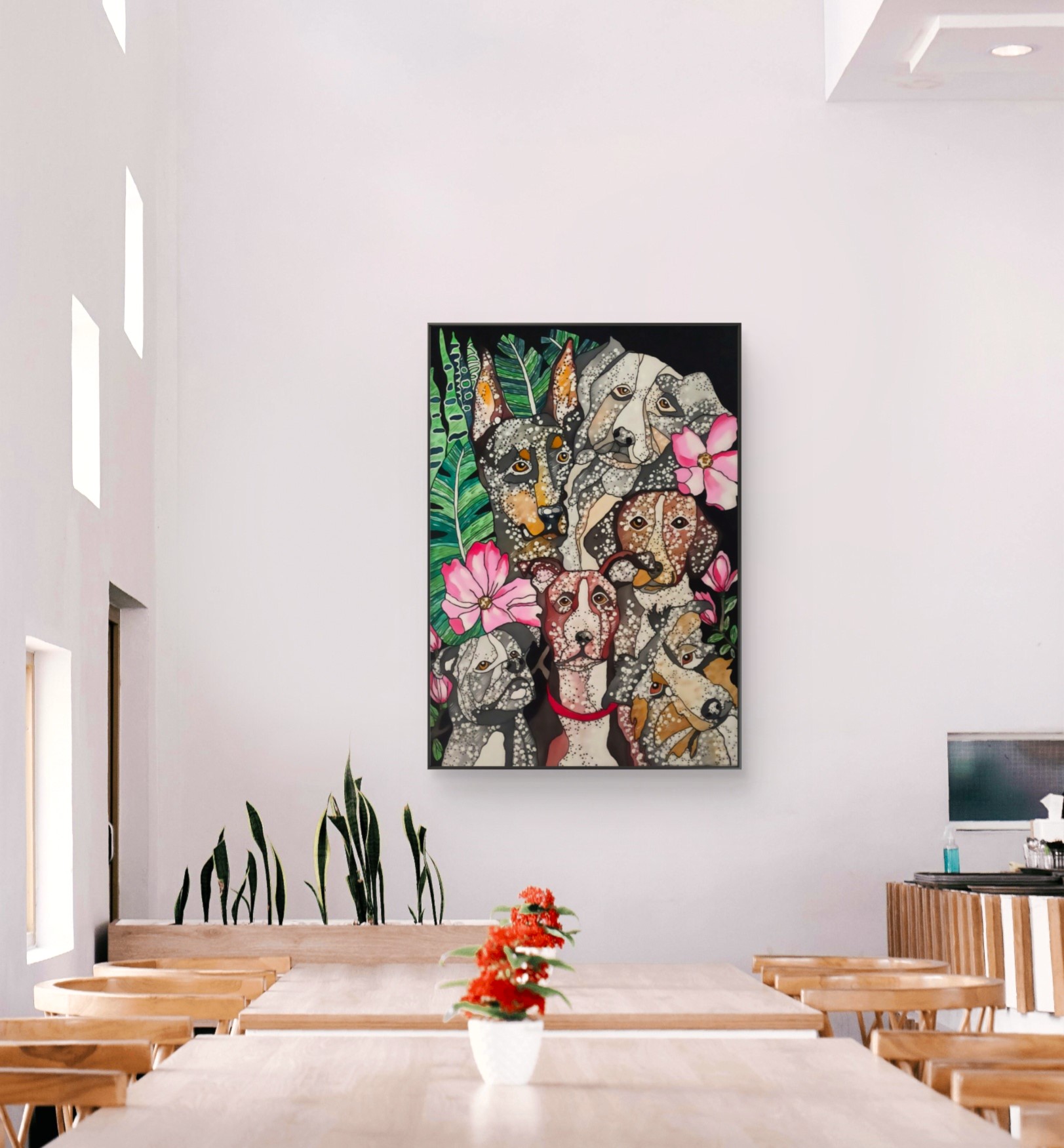 Questo quadro ritrae dei cani in un ambiente naturale, sono dei ritratti che con lo sguardo ci osservano e osservano il mondo