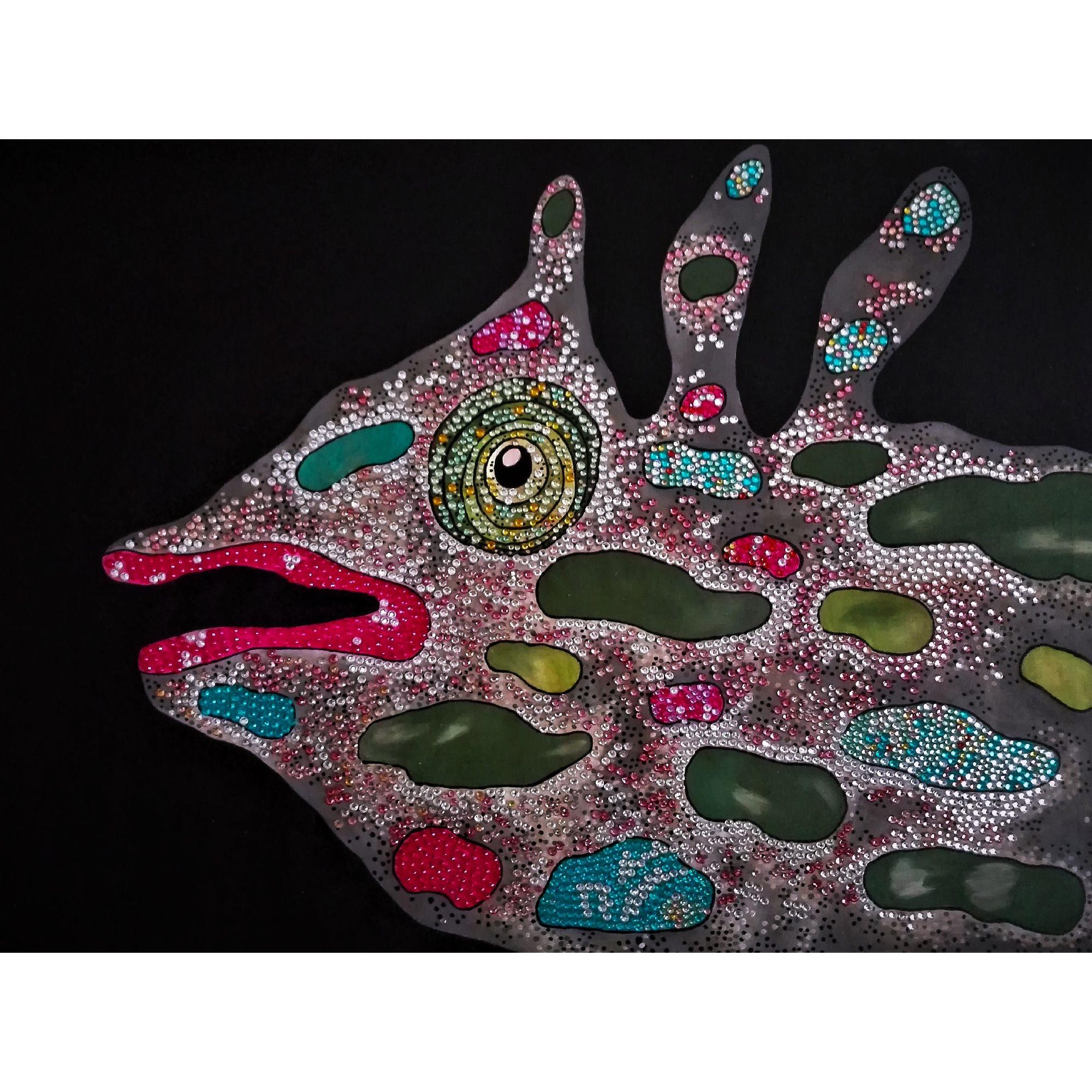 Questo quadro tra i miei camaleonti è singolare perche la tela non ha imprimitura o meglio, la tela ha una preparazione di fondo molto leggera che fa sì che la campitura nera abbia un effetto vellutato .i cristalli swarovski hanno colori sgargianti per contrastare la morbidezza dei colori del dipinto che si intravedono .
