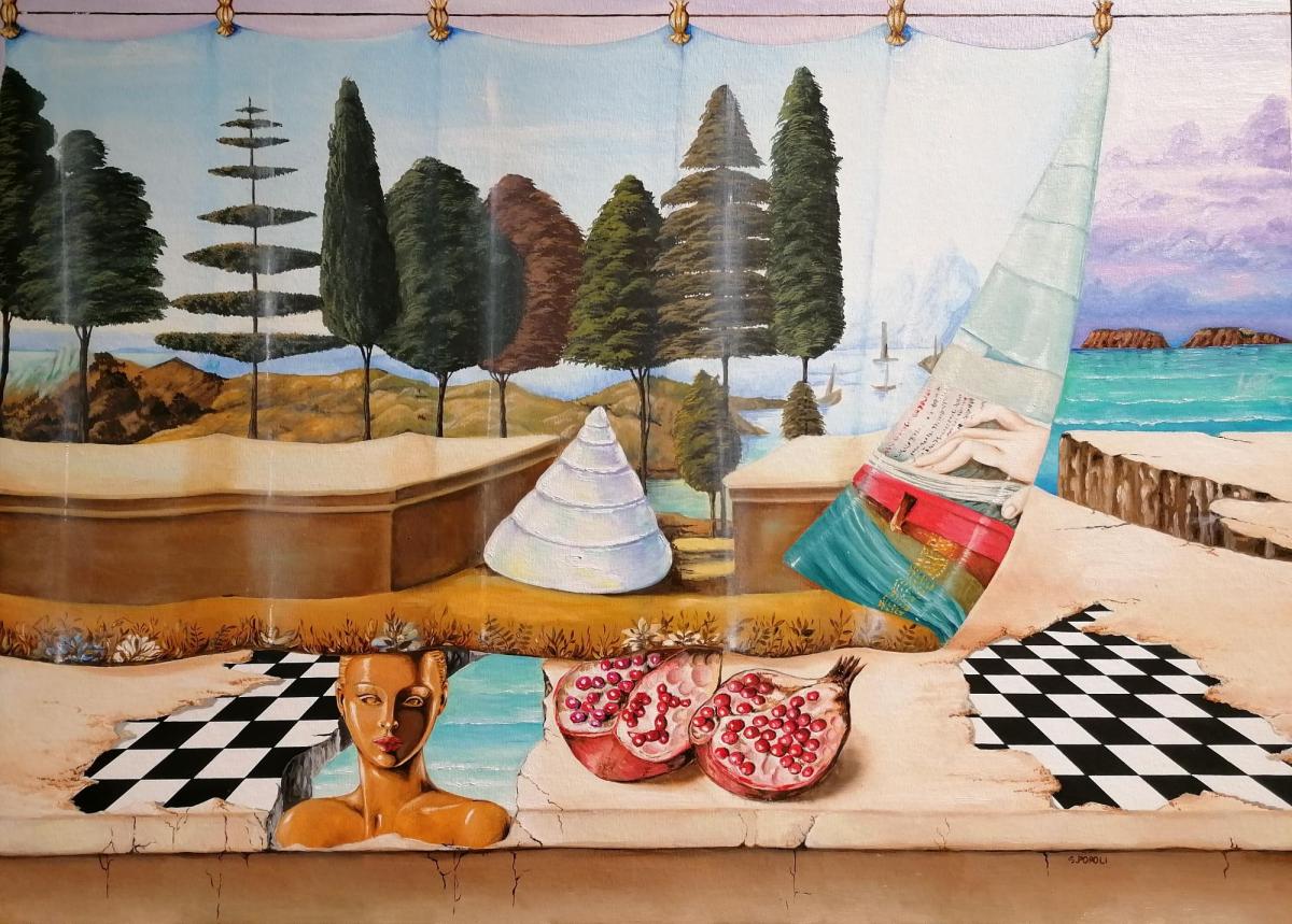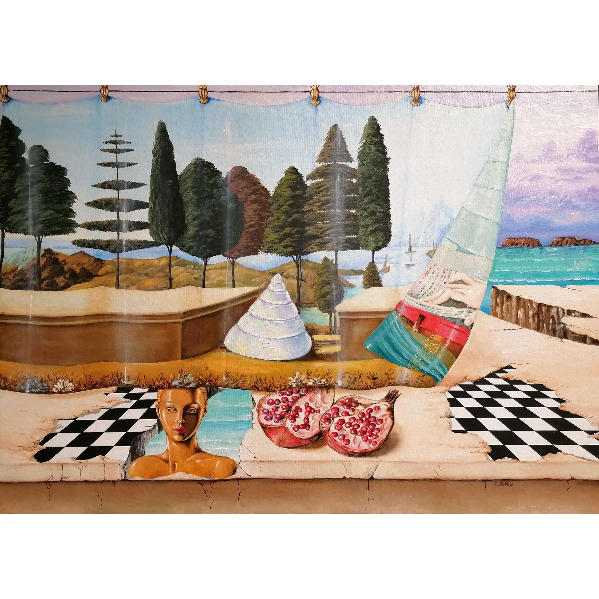 L’opera del maestro è rappresentata nel drappo appeso e sostenuto da ganci, come un arazzo che nasconde un paesaggio marino. L’uno si fonde idealmente nell’altro (stessa linea dell’orizzonte).