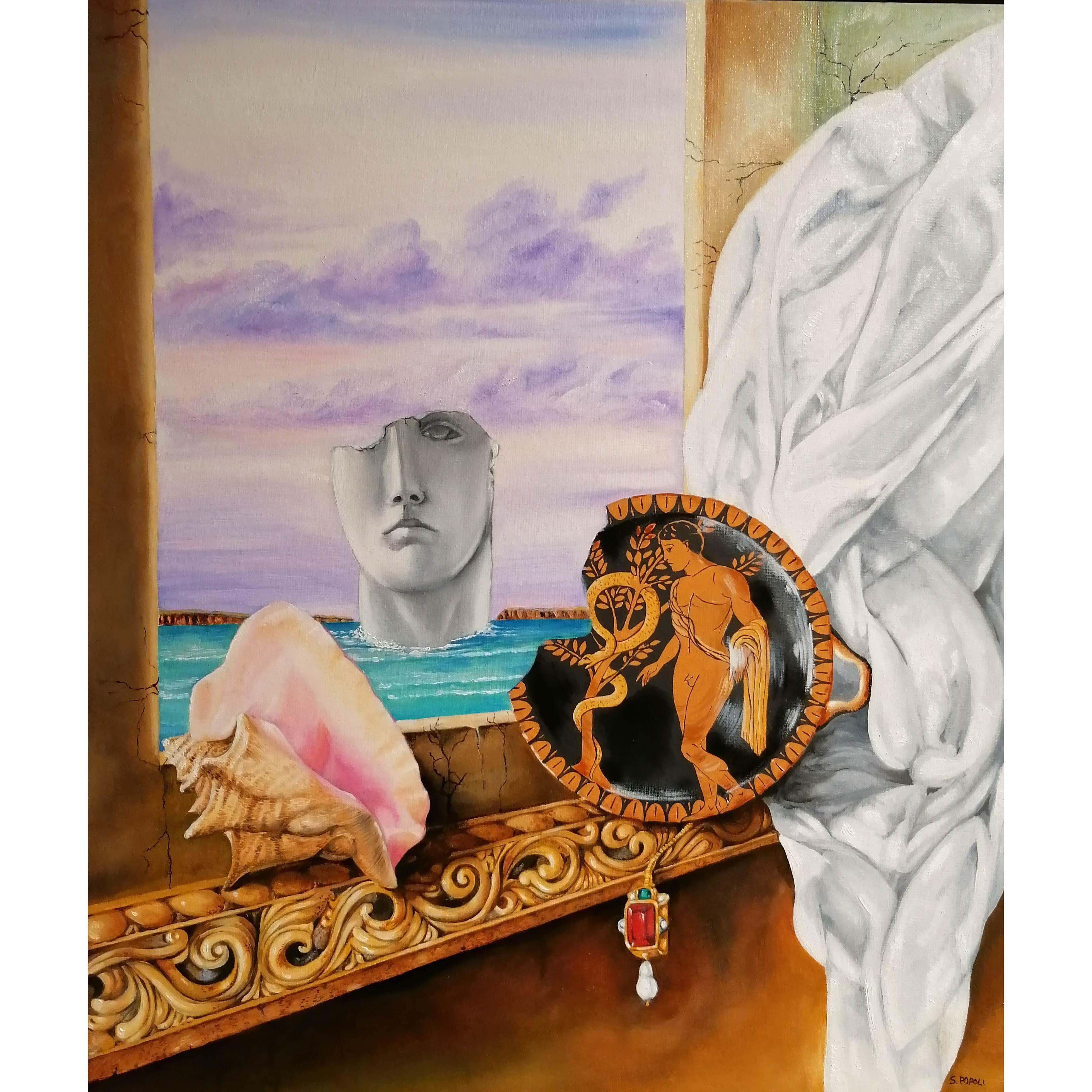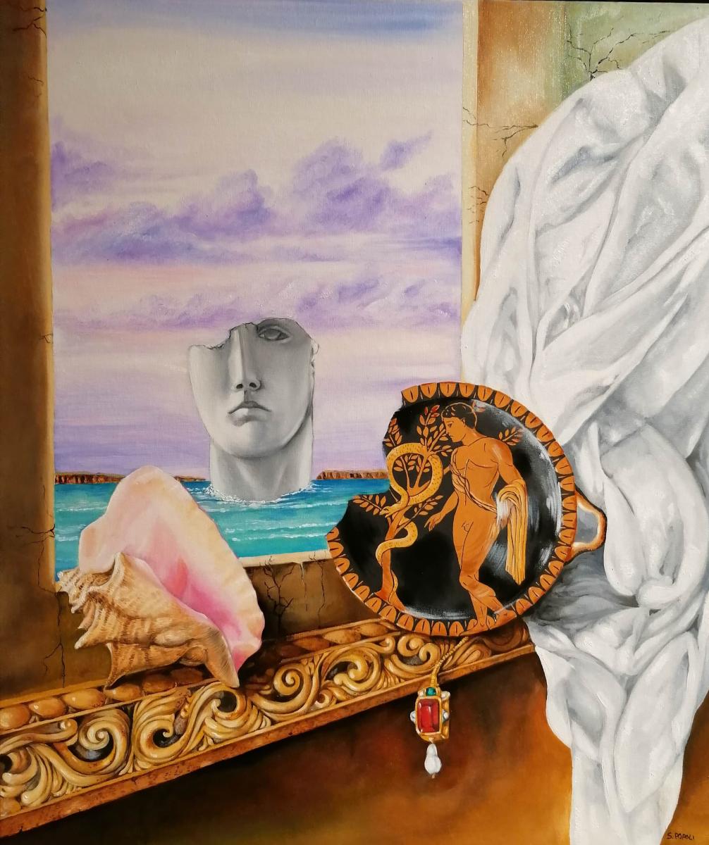 Questa opera affronta il tema del maschile e femminile con la seduzione come perno attorno al quale si genera il perpetuo moto fra?uomo e donna. Il tema è guidato,?inserito dal Kylix attico all’interno del quale vediamo un giovane tentato da?un serpente, come un novello Adamo.?Sotto, un ciondolo d’oro con?incastonati un rubino e uno smeraldo;?alla base pende una perla. E’ il gioiello?che le spose indossavano nel ‘500 per?il significato che trasmetteva come?promessa allo sposo: castità (perla),?passione (rubino), fedeltà (smeraldo).?Sul lato destro un drappo bianco,?simbolo di purezza che contrasta però?con la grande conchiglia in primo?piano, la quale, per forma e colore, rappresenta il sesso femminile nella sua massima seduzione. Sullo sfondo emerge, dalle acque del mare, la testa marmorea di un giovane uomo dall’espressione assorta e consapevole.
