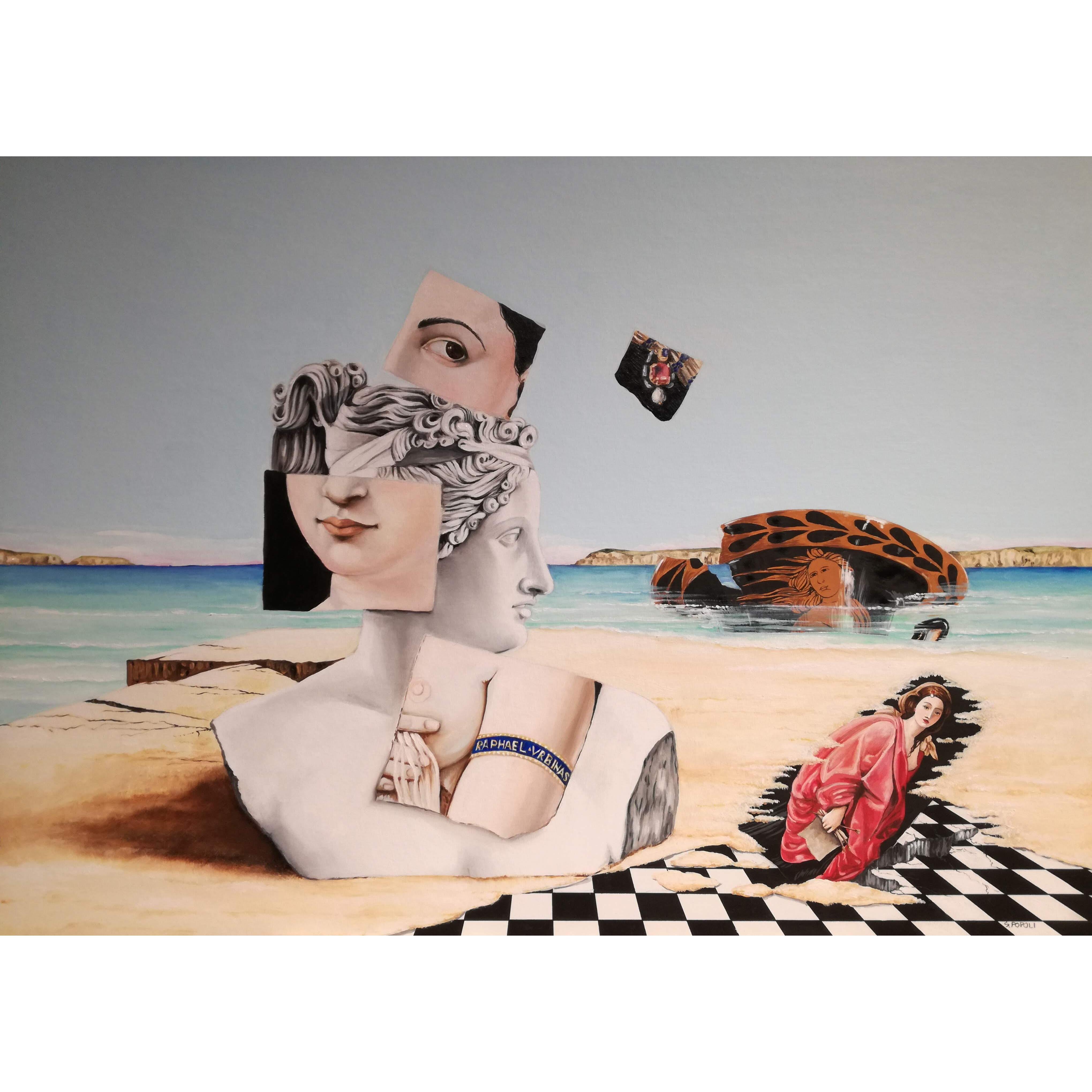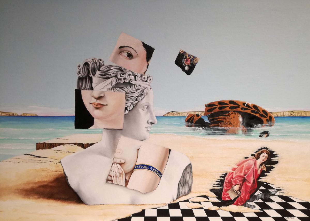 Sono frammenti della Fornarina che volano trasportati dal vento sovrastando la Venere di Canova. È un inno alla bellezza. La Pittura (personificazione dell’artista), come una testimone silenziosa e astratta, affiora dal pavimento, a scacchi bianchi e neri, ormai distrutto. Sullo sfondo un altro omaggio a Raffaello: dall’acqua emerge un vaso attico che raffigura Galatea, la Nereide innamorata di Aci, ucciso da Polifemo per gelosia.