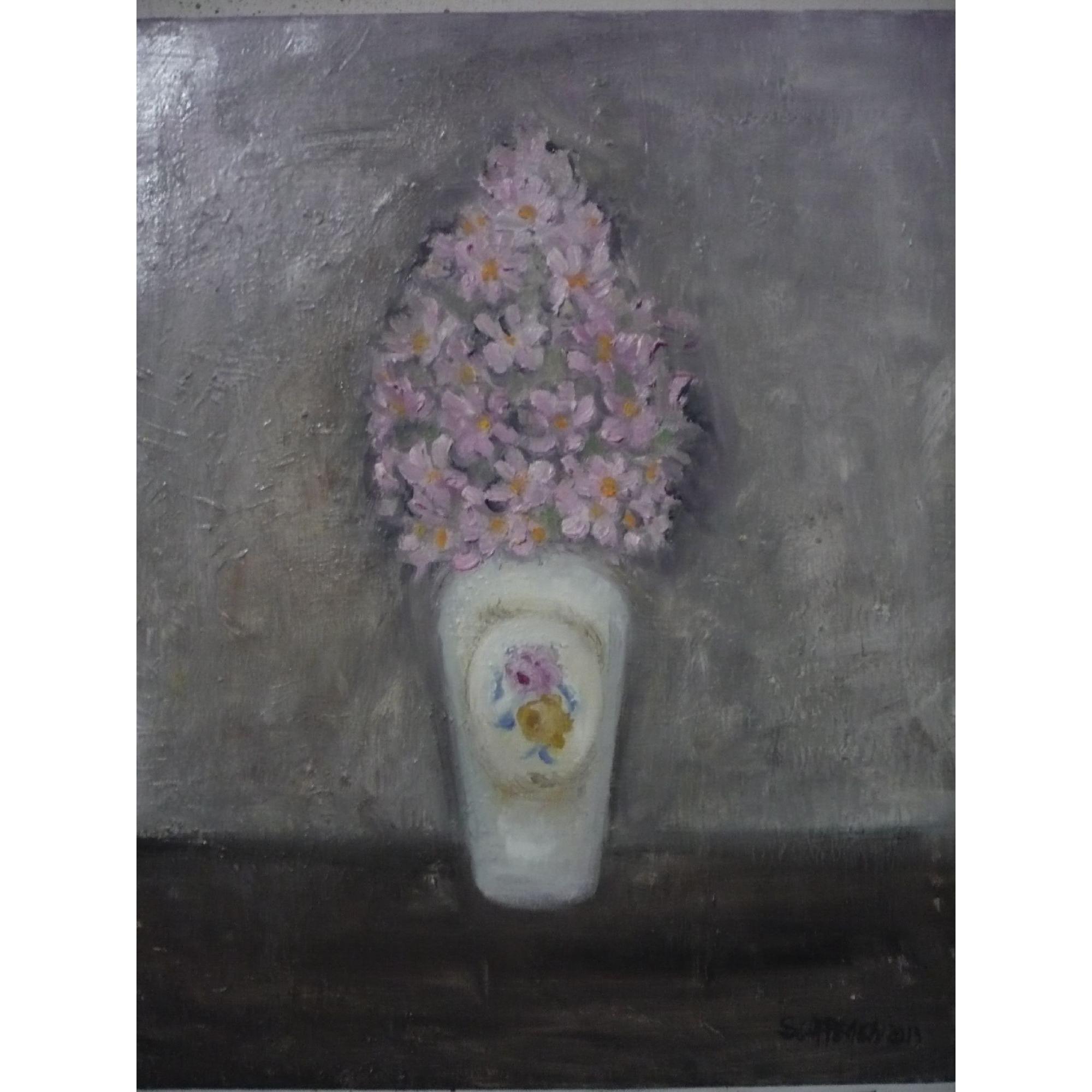 ''Nell'opera presentata a questa Triennale dal titolo NATURA MORTA GIACINTO,si vede l'amore che l'artista nutre per la natura,componente costante delle sue opere .Opera gradevole per colore e resa pittorica.Materia pittorica stesa a piccoli colpi di pennello,simile al procedere degli impressionisti,con la principale differenza che non siamo in una dimensione EN PLEIN AIR,bensi nel chiuso di una stanza dalle pareti grigie.Al centro di un tavolo ,o forse di una mensola,sta un vaso di ceramica finemente decorato,prezioso,raffinato,da cui fuoriescono fiori di Giacinto come ci suggerisce il titolo.I fiori carnosi,dalle tonalita lilla,sono colpite da una fonte di luce frontale a giudicare dall'ombra che si intravede dietro al vaso.