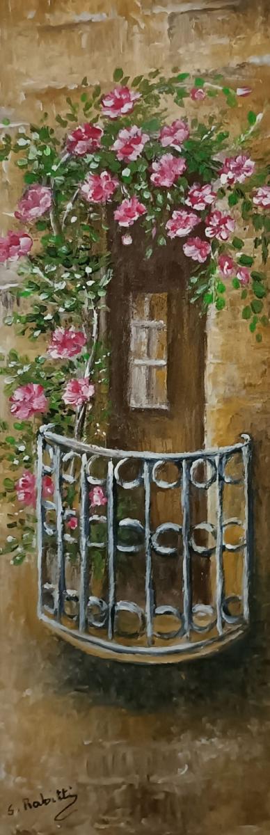 Un piccolo balcone di una vecchia casa in Lunigiana con un vaso di roselline che si arrampicano sul muro in pietra