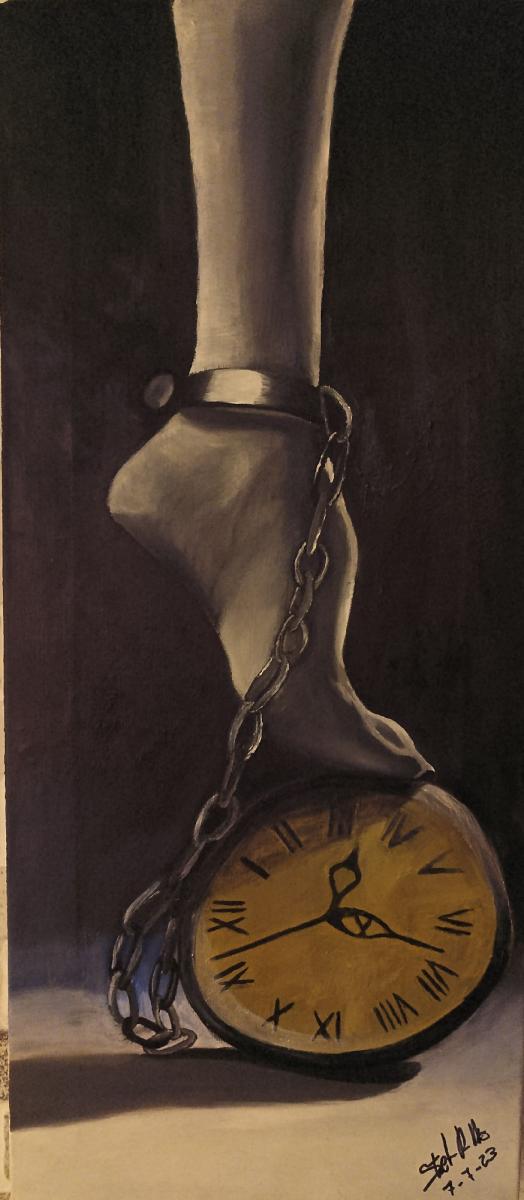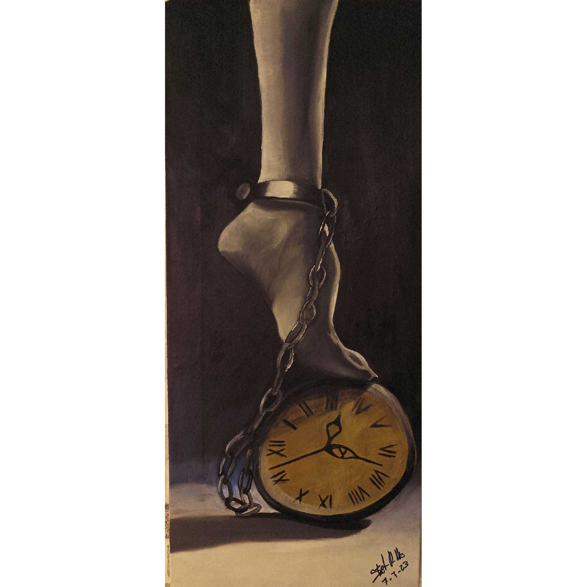 Stile e TecnicaL’opera è realizzata con tecnica olio su tela, che permette una resa ricca e dettagliata. Il gioco tra luci e ombre esalta i contrasti emotivi e visivi: il metallo freddo delle catene e dell’orologio contrasta con la carne del piede, rendendo palpabile la tensione tra la libertà umana e i limiti imposti dal tempo. I colori sobri, con tonalità di grigio, marrone e oro, sottolineano l’atmosfera drammatica e universale dell’opera.