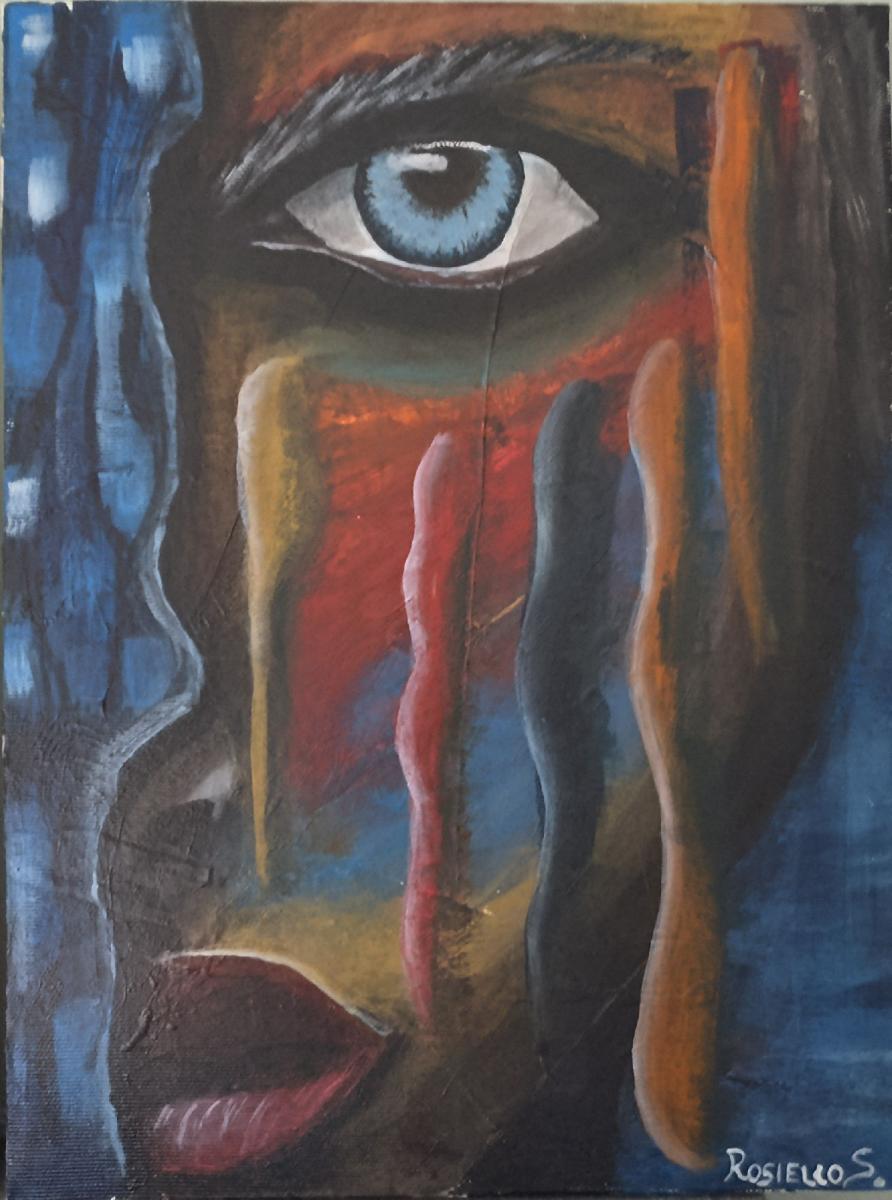 Spio è un'opera intensa che esplora il tema della percezione e dell'introspezione. Al centro dell'immagine, un occhio profondo e penetrante emerge da un gioco di colori vivaci, come se stesse osservando qualcosa dietro una barriera. Una mano sfuma e si avvicina all'occhio, quasi a separarlo dal contesto circostante, creando un senso di tensione e di introspezione. Il contrasto tra il colore freddo dell'occhio e i toni caldi e sfumati della mano e dello sfondo suggerisce un dialogo tra l'interiorità dell'individuo e la realtà che lo circonda.
