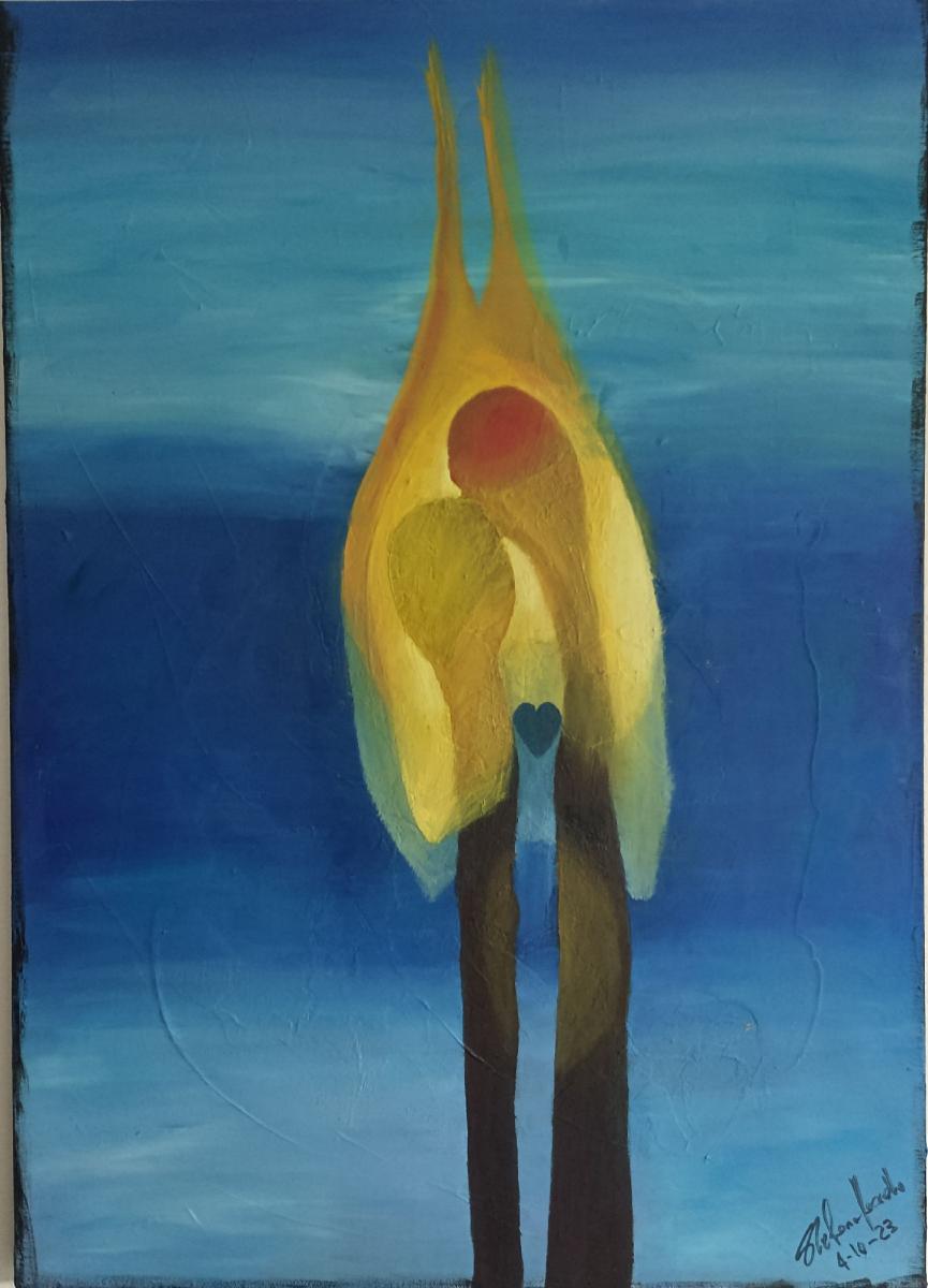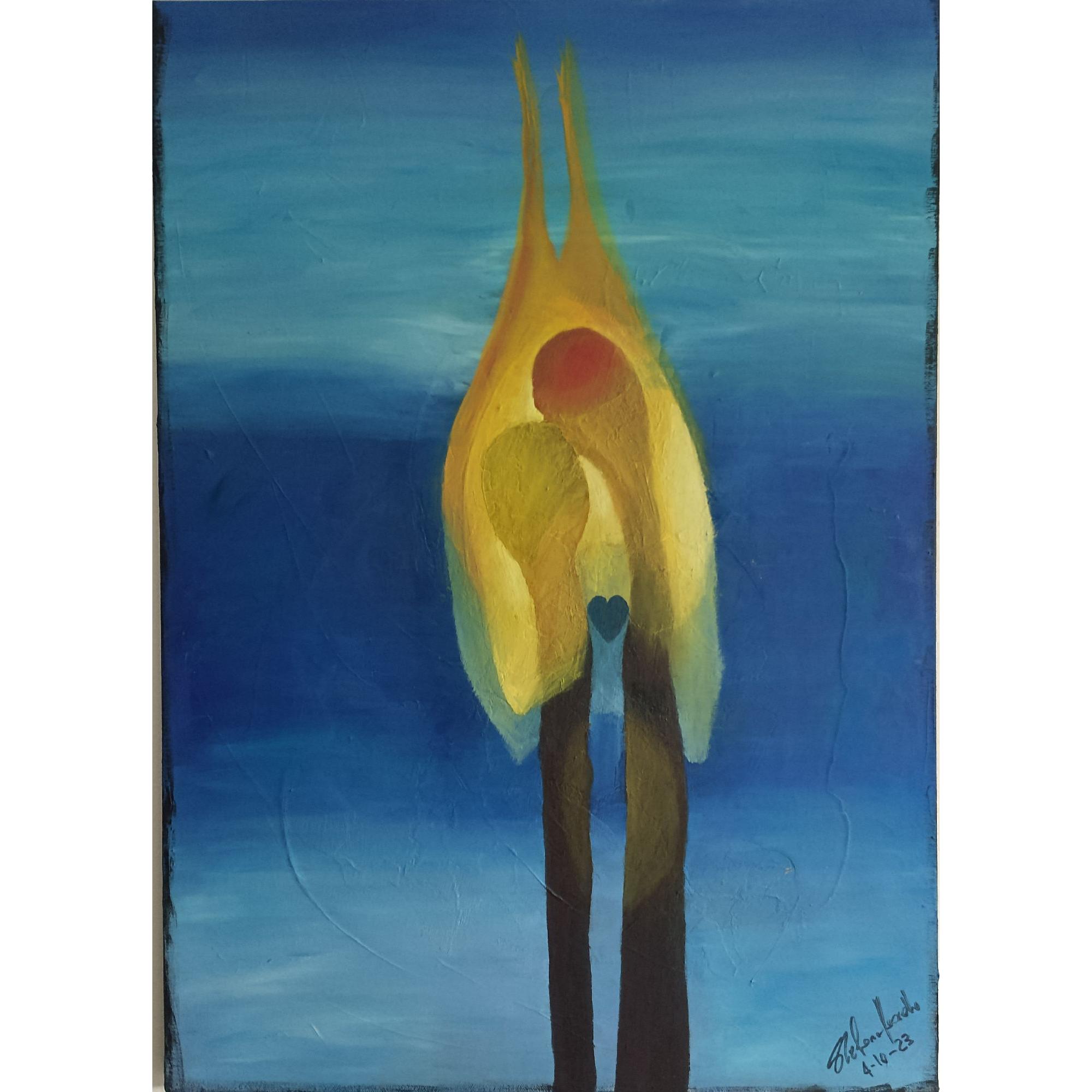 - I colori: I toni caldi di giallo e arancio, associati al fuoco, rappresentano la passione e l'intensità emotiva, mentre il blu sullo sfondo evoca serenità, ma anche il potenziale di freddezza e distacco. L'uso di questi colori suggerisce che, sebbene le relazioni siano uniche e potenti, possono anche essere rischiose, con esiti che dipendono dalla direzione intrapresa.
