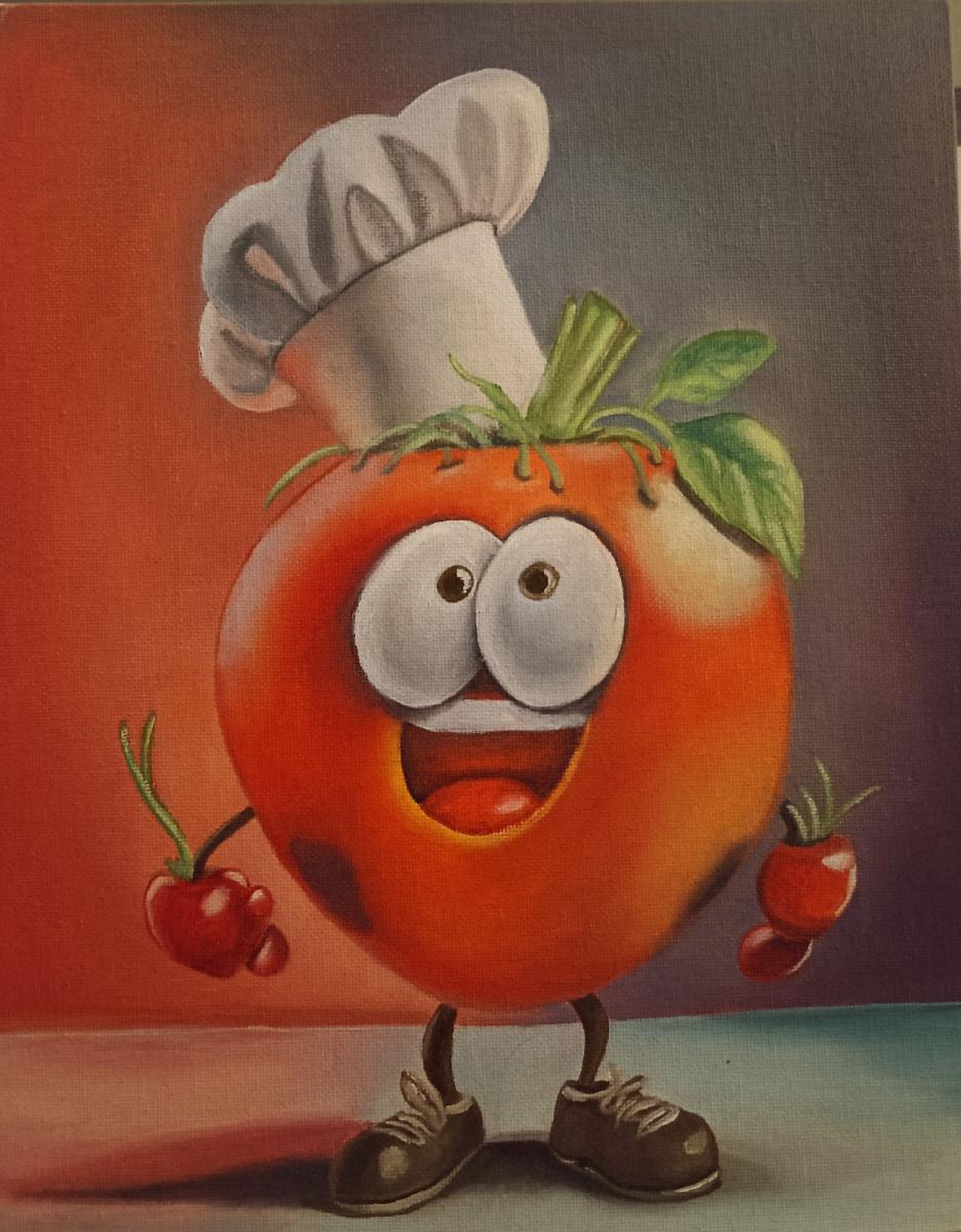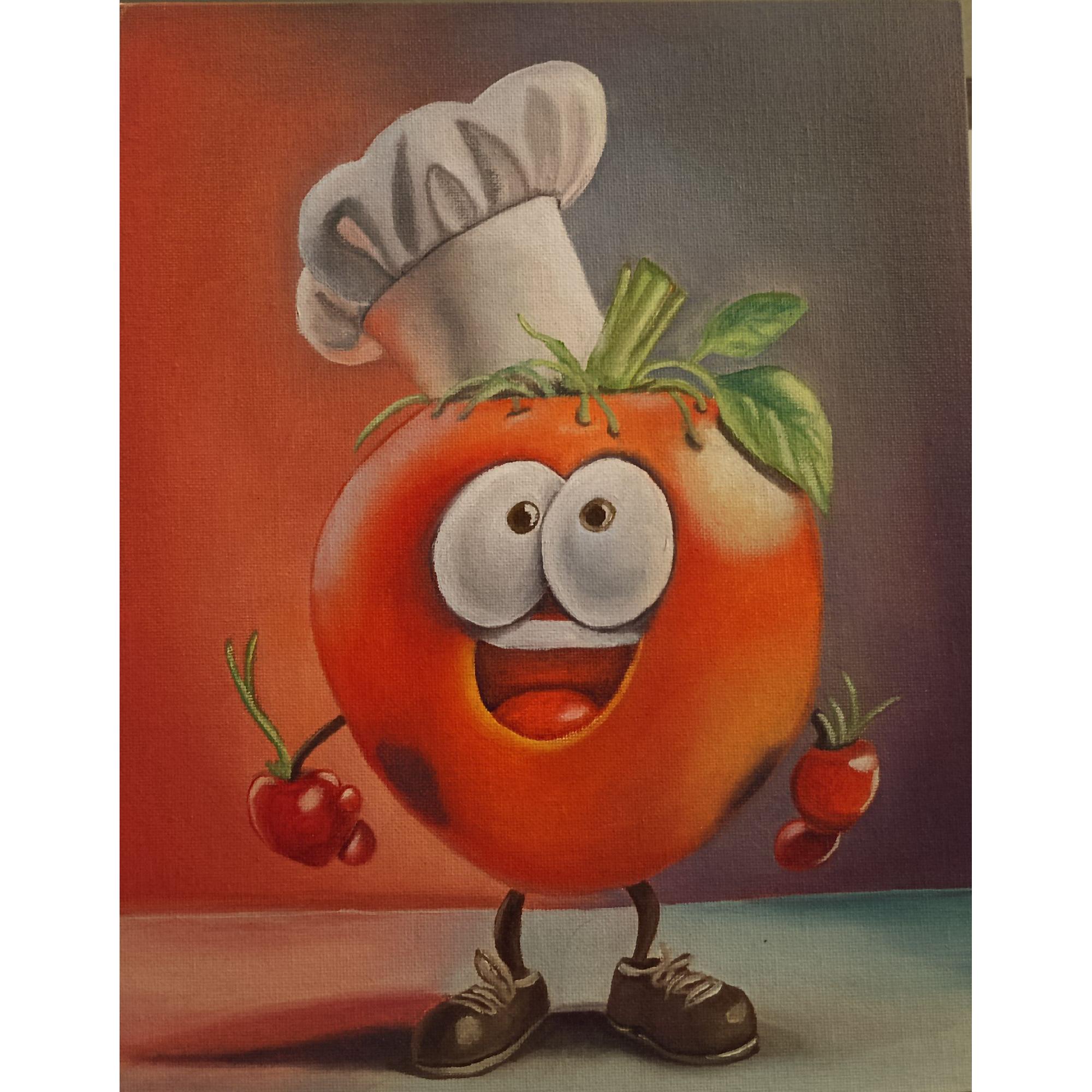 Realizzata con olio su tela, l'opera gioca con colori vivaci e sfumature morbide per dare vita a un personaggio tridimensionale. Il contrasto tra i toni caldi dello sfondo e il brillante rosso del pomodoro crea un effetto visivo accattivante, mentre i dettagli del volto e delle mani sono resi con una tecnica che enfatizza l'espressività del personaggio.