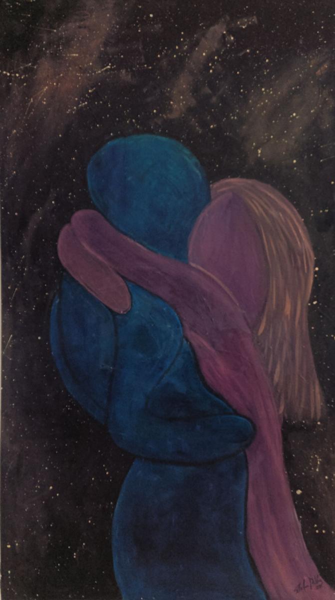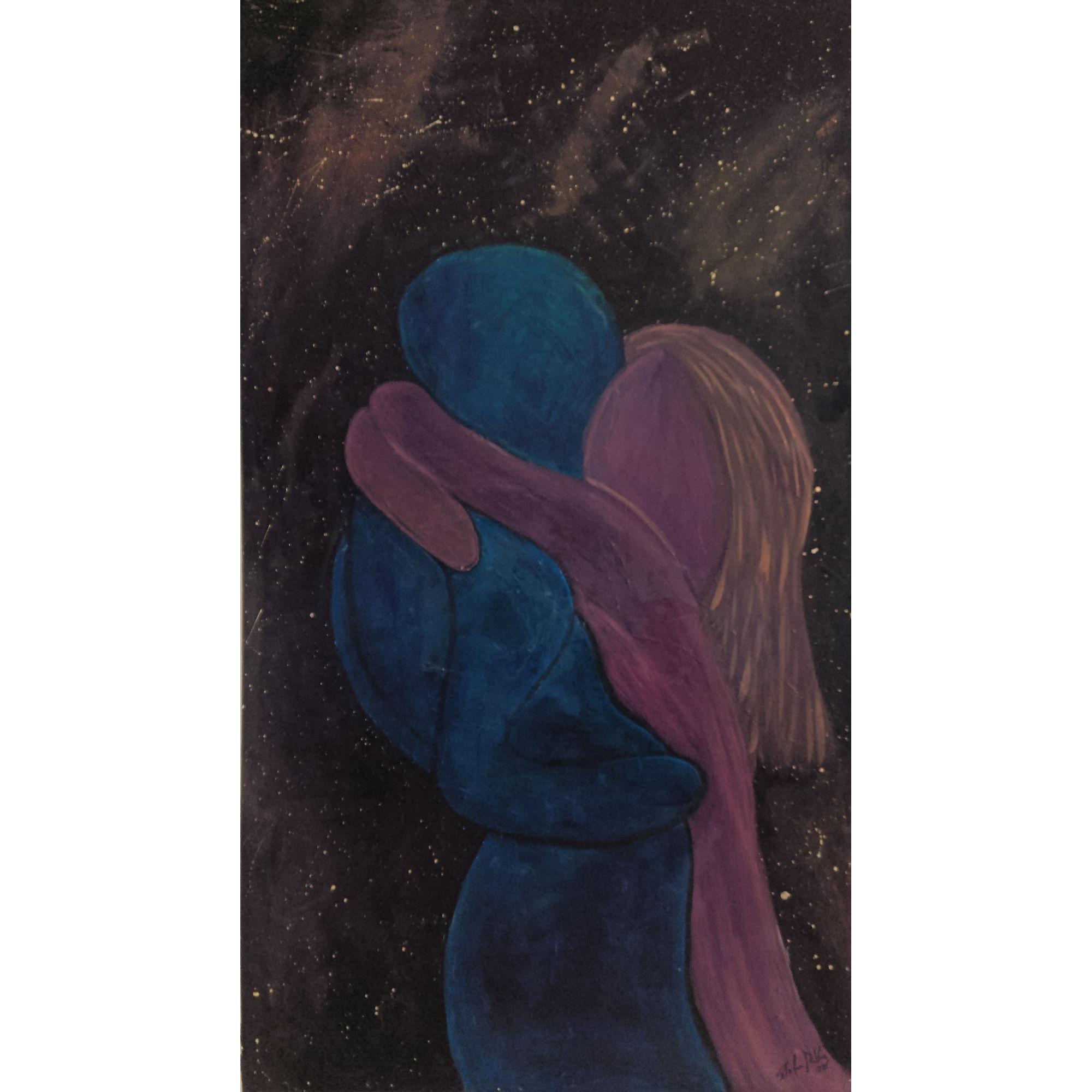 L'Abbraccio è un'opera che cattura un momento intimo di unione e connessione profonda tra due esseri. Le figure, stilizzate e colorate con tonalità di blu e viola, si fondono insieme in un abbraccio che supera i confini fisici, come se l'amore e l'affetto non fossero limitati dal corpo. Il fondo stellato suggerisce l'infinito, rappresentando un legame che va oltre la realtà terrena, come se l'abbraccio fosse una forma di connessione cosmica, eterna e universale. I colori sfumati e le linee morbide evocano una sensazione di pace, calore e sicurezza, mentre le figure si intrecciano in un gesto di protezione e sostegno reciproco.