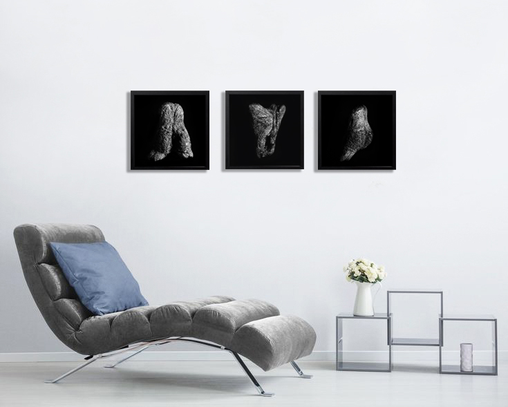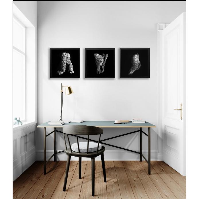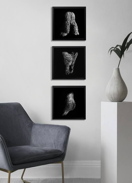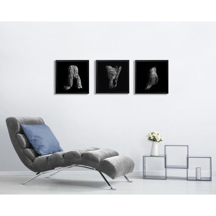 This triptych with 3 25x25 black frames, printed in black and white, is already framed, ready to hang.