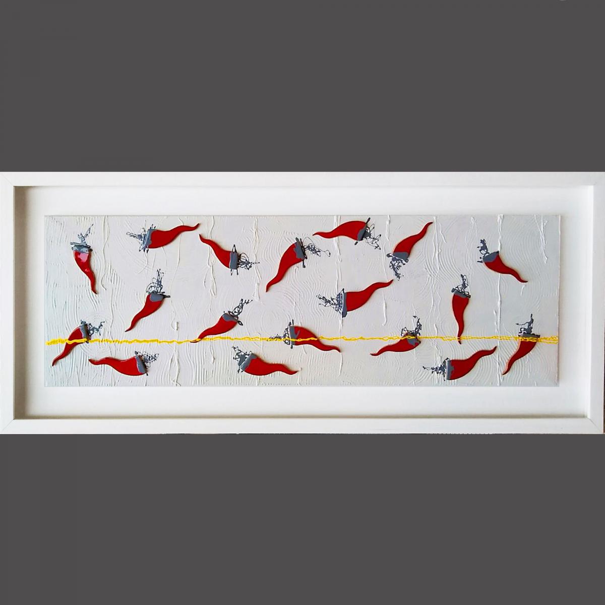 Ritengo i colori la vera energia per le mie creazioni e mi muovo perché le cromie siano travolgenti. Gli innesti ceramici, sono presenti anche nei lavori su tela perché tengo molto alla possibilità di determinare un dialogo più forte tra la pittura e la matericità della terra cotta e smaltata.