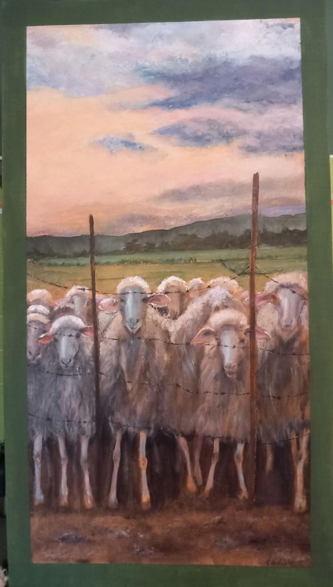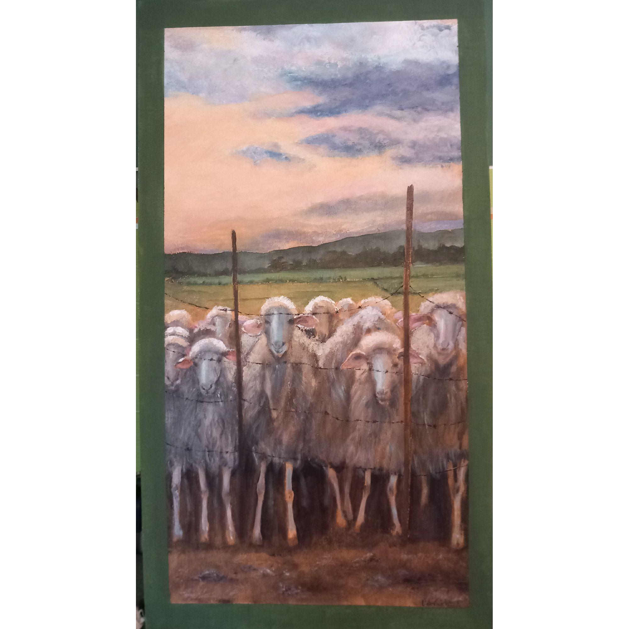 Si tratta di un gruppo di pecore, colte all'imbrunire, assiepate contro un recinto di filo spinato. Ispirato parzialmente ad una foto di Sardegna Magica (Giacomo Manca)