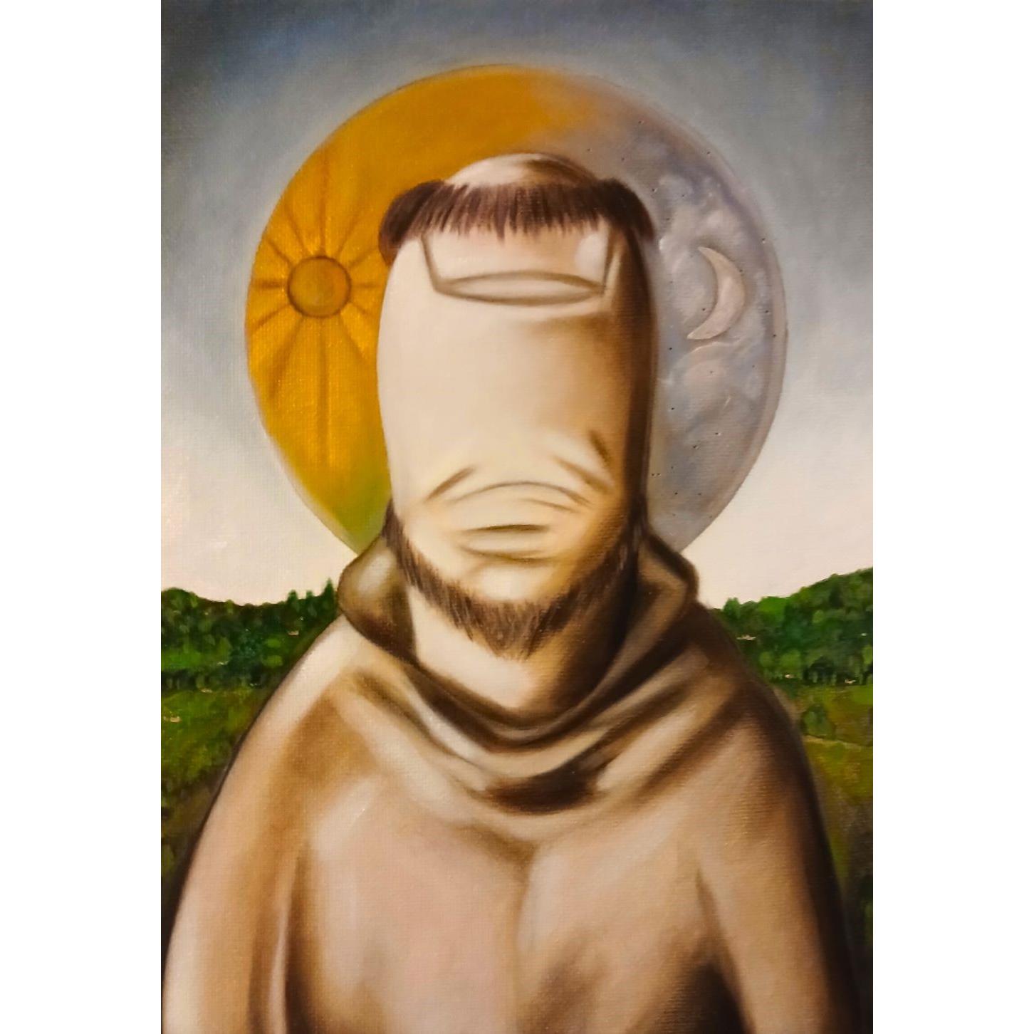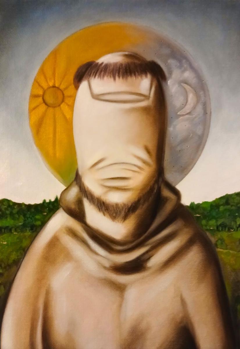 3. Maestria Tecnica e ContestoL'opera bilancia con successo l'audacia concettuale della Finger Art con l'esecuzione classica. Il drappeggio del saio, reso con tonalità calde e terrose, e il paesaggio verde e collinare (chiaro richiamo all'Umbria) ancorano la figura in un contesto di realismo pittorico. L'uso sapiente della luce, che avvolge il saio e illumina la nimbo, rende l'opera vibrante e trascendente.