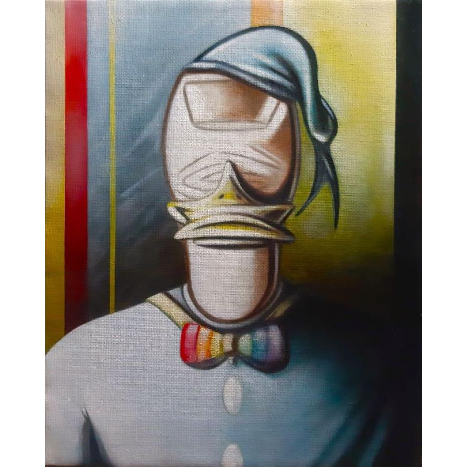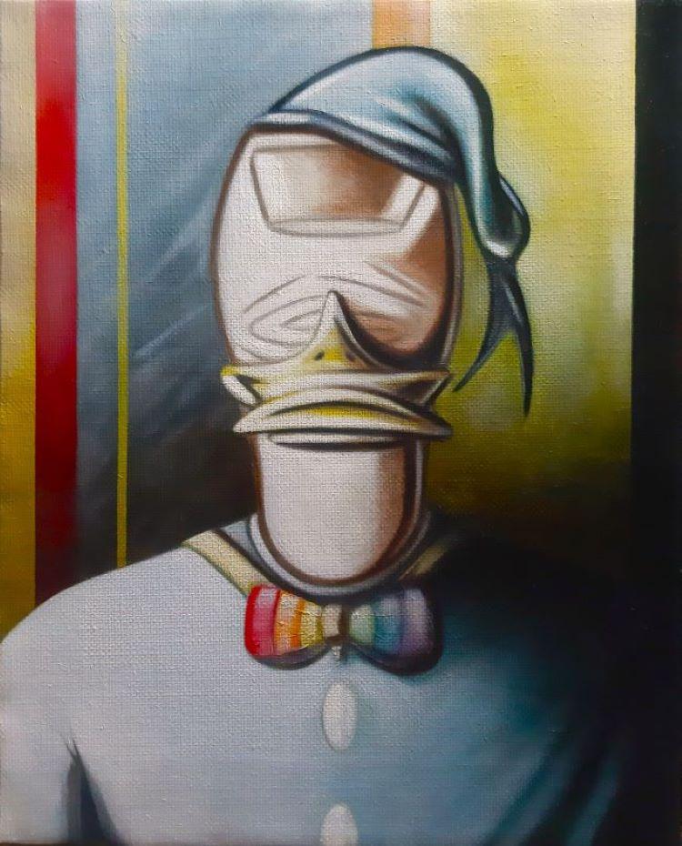 L'opera "PaperinoFinger" di Raffaele Ciotola rappresenta il vertice intellettuale della sua corrente artistica brevettata. Qui, il Maestro non si limita alla rappresentazione di un'icona dei cartoni animati, ma ne opera una trasfigurazione ontologica. Sostituendo il volto del soggetto con l'impronta del proprio dito, Ciotola trasferisce il DNA dell'artista nella fibra stessa della juta, elevando il personaggio da prodotto commerciale a reliquia moderna.