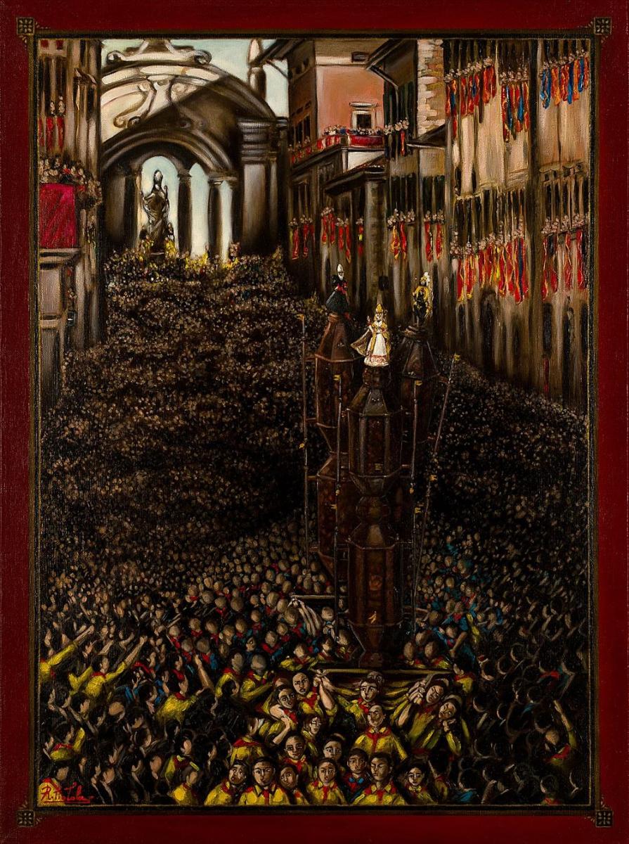 Nell'opera "I Ceri di Gubbio", il Maestro Raffaele Ciotola compie una metamorfosi antropologica che trasforma la storica festa umbra in un simbolo assoluto di connessione collettiva e devozione atavica. Attraverso la Finger Art Ciotola, la folla oceanica e la tensione strutturale dei ceri vengono sintetizzate in un tratto materico potente: il gesto pittorico si trasfigura nel pilastro dell'identità comunitaria, dove le impronte dell'artista generano vita e movimento sulla tela.