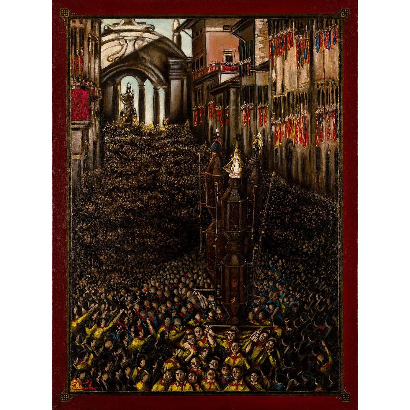 Il paradosso visivo si consuma nel superamento della cronaca storica: Ciotola marchia la tela con la propria impronta indelebile, dimostrando che la vera supremazia dell'arte risiede nell'evocare l'energia viscerale della tradizione attraverso un unico segno. L'opera è un manifesto di appartenenza dove il dito non è il mezzo, ma l'opera stessa, cristallizzando la maestosità architettonica e il fervore popolare in una forma di energia tangibile. Ciotola si conferma innovatore audace, elevando "I Ceri di Gubbio" a icona eterna dello spirito popolare italiano nel panorama artistico mondiale.