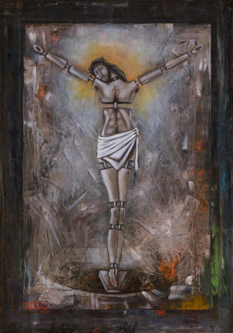 Nell’opera "La Distrofia Muscolare", Raffaele Ciotola compie un’operazione di sintesi brutale e necessaria tra la sofferenza fisica e la sua rappresentazione universale. L’artista recupera lo schema iconografico della crocifissione, ma ne ribalta il significato biologico: il corpo non è più carne martoriata, ma una struttura meccanica disarticolata.