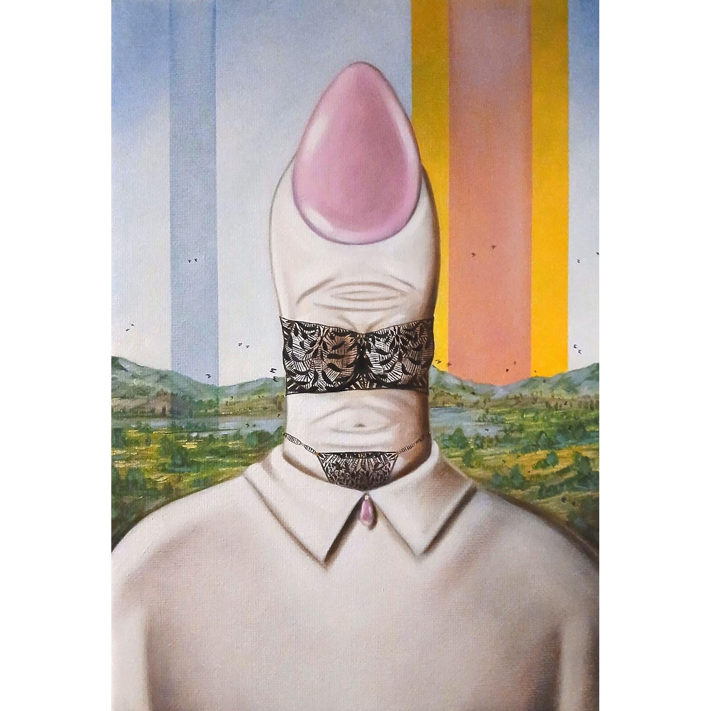 L'Iconografia del Dito-Volto: La figura centrale, ieratica e monumentale, domina un paesaggio universale segmentato da bande cromatiche pure. È la rappresentazione del dominio dell'artista sulla natura stessa.