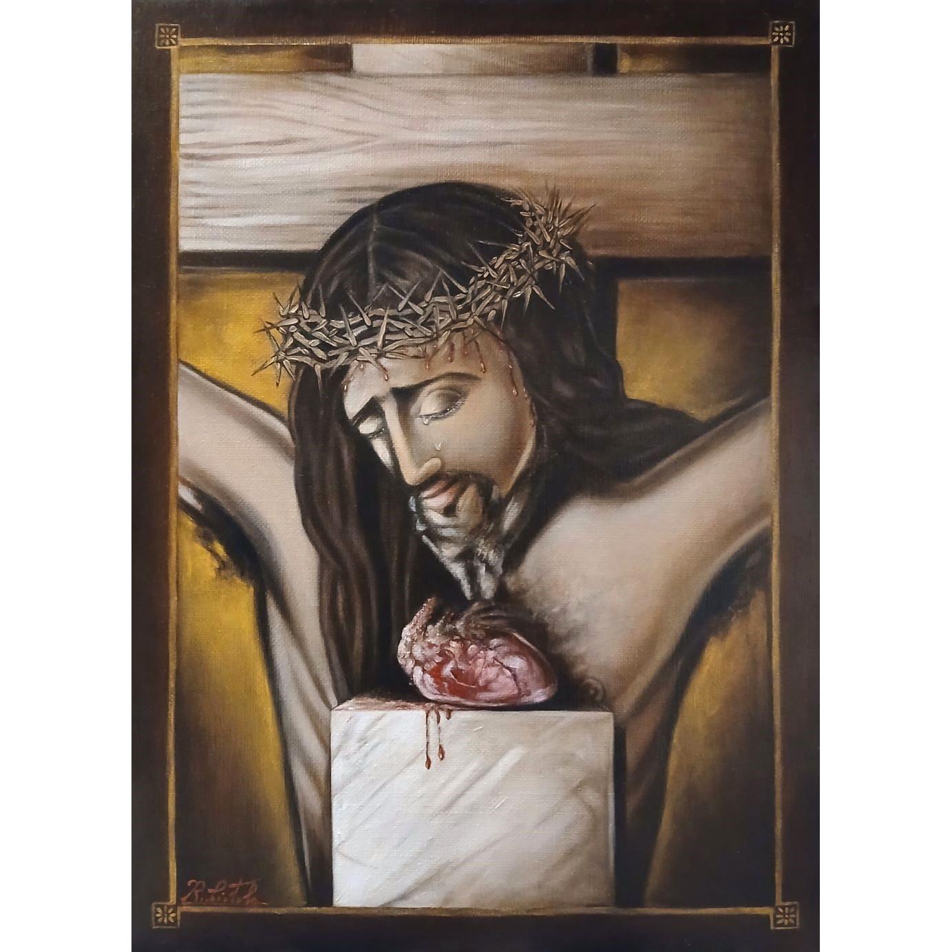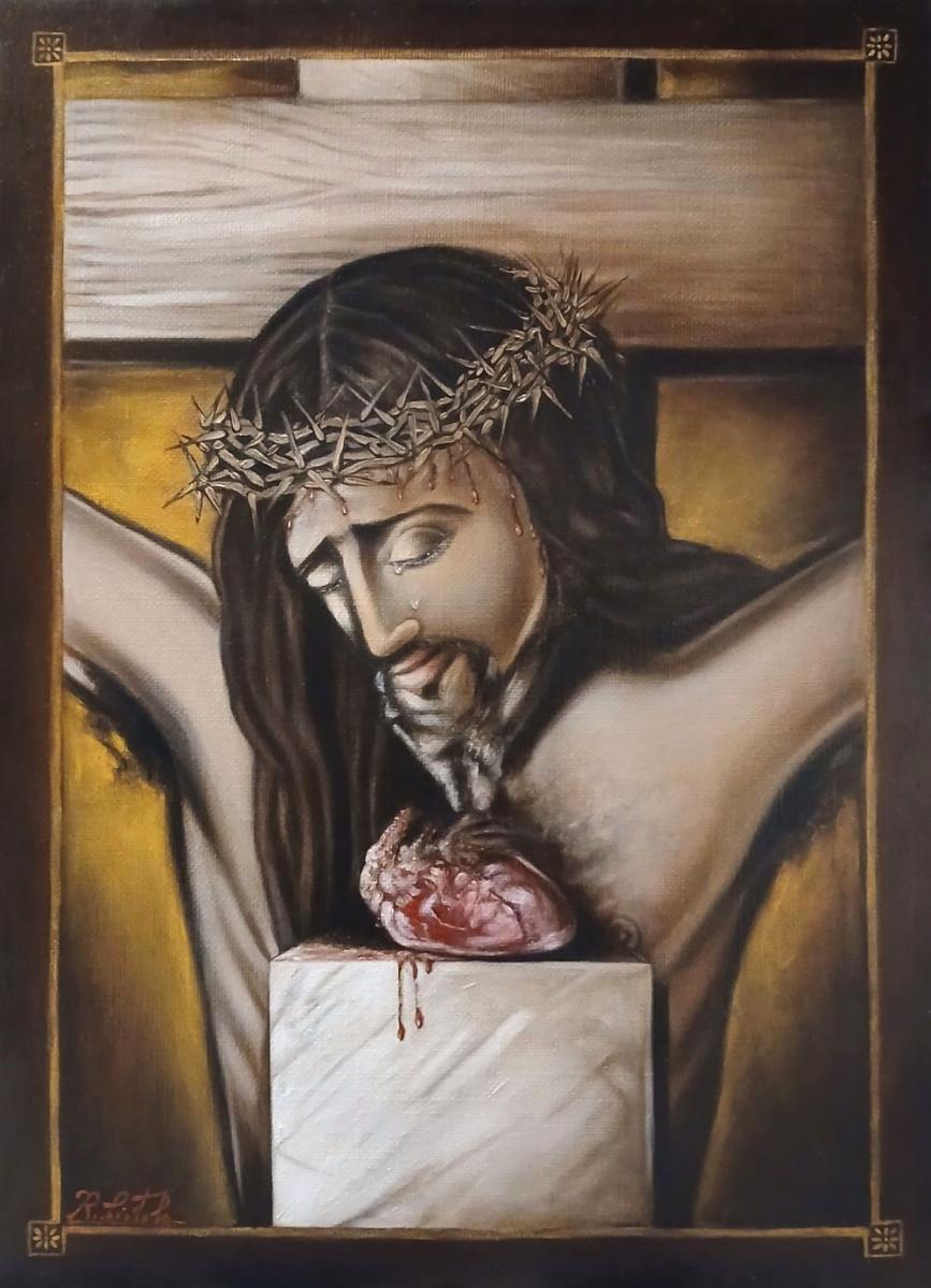 Nell'opera "UN CUORE PER TUTTI", l'artista Raffaele Ciotola compie un'operazione di sintesi drammatica tra la materia inerte e la vitalità del sacro. La tela non si limita a rappresentare un'iconografia, ma mette in scena un vero e proprio "corpo a corpo" tra la luce e l'oscurità, risolto con una maturità tecnica che denota una profonda ricerca interiore.