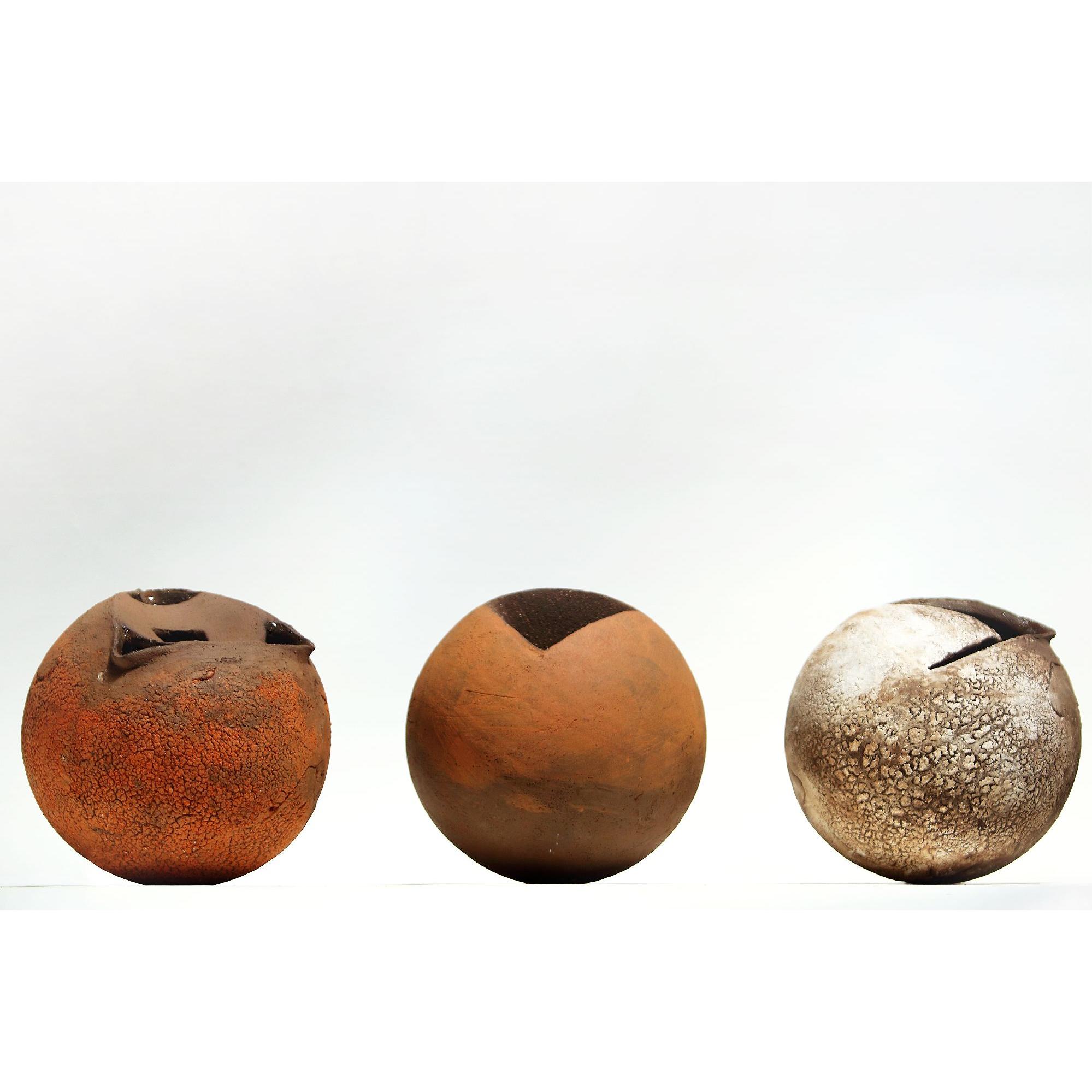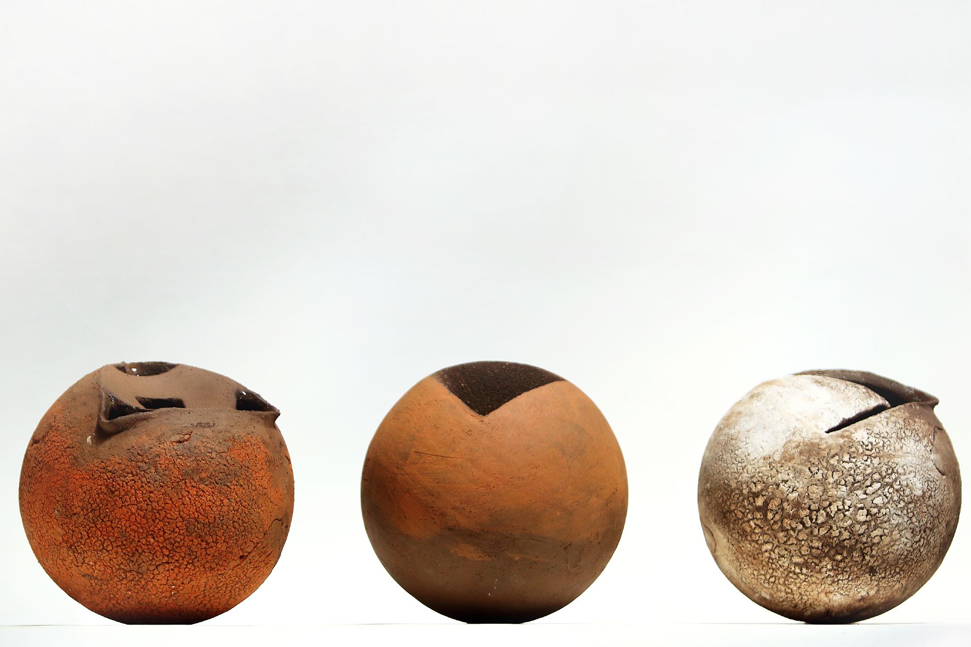 Così queste forme sferiche si dispongono nello spazio come una costellazione di argilla, materia densa che ricorda l’origine e il ritorno.