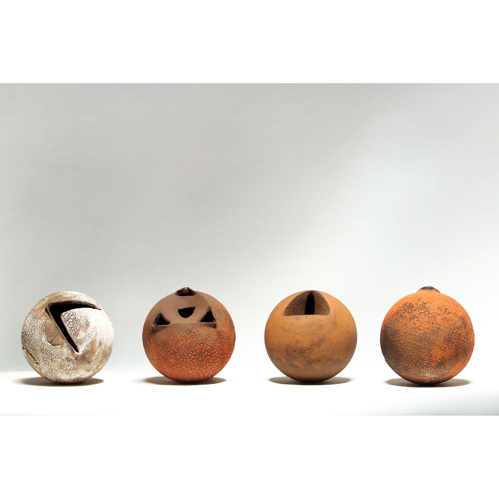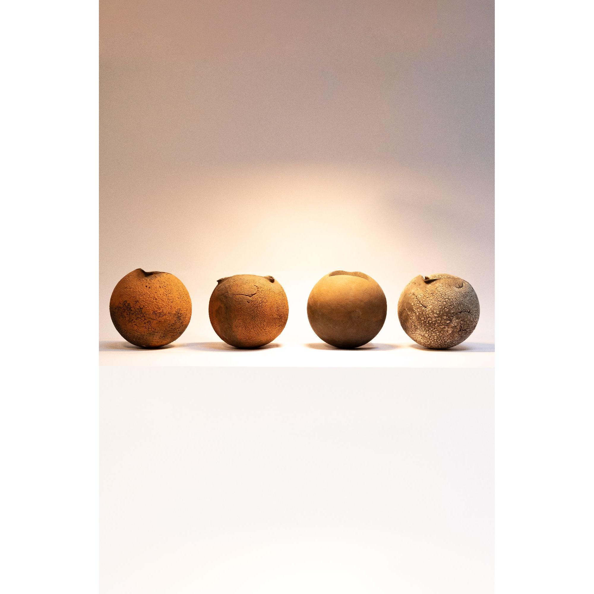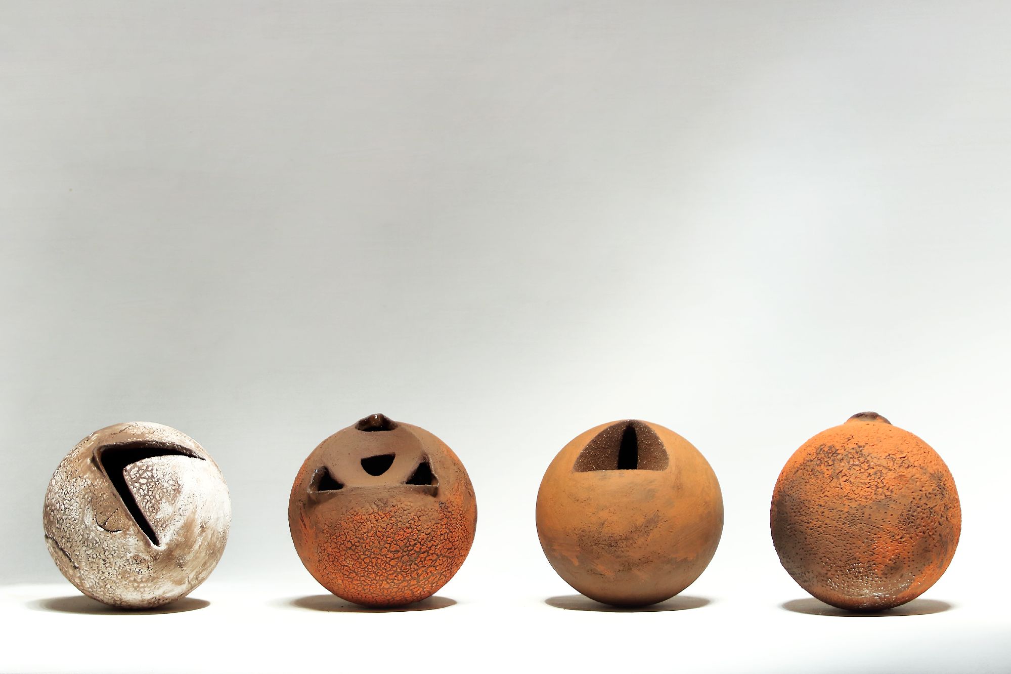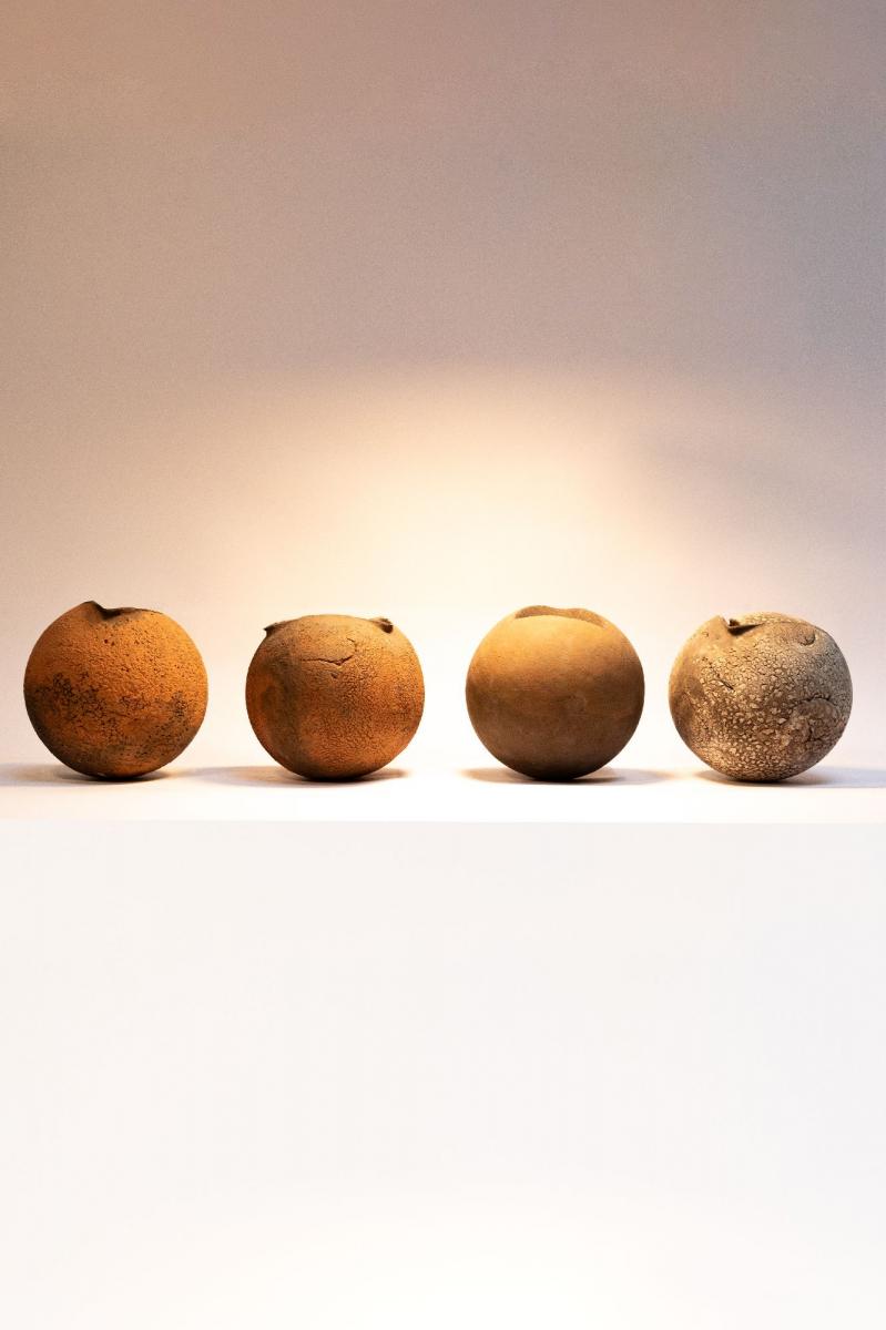 Quattro sfere di terra si allineano come corpi celesti in equilibrio silenzioso.