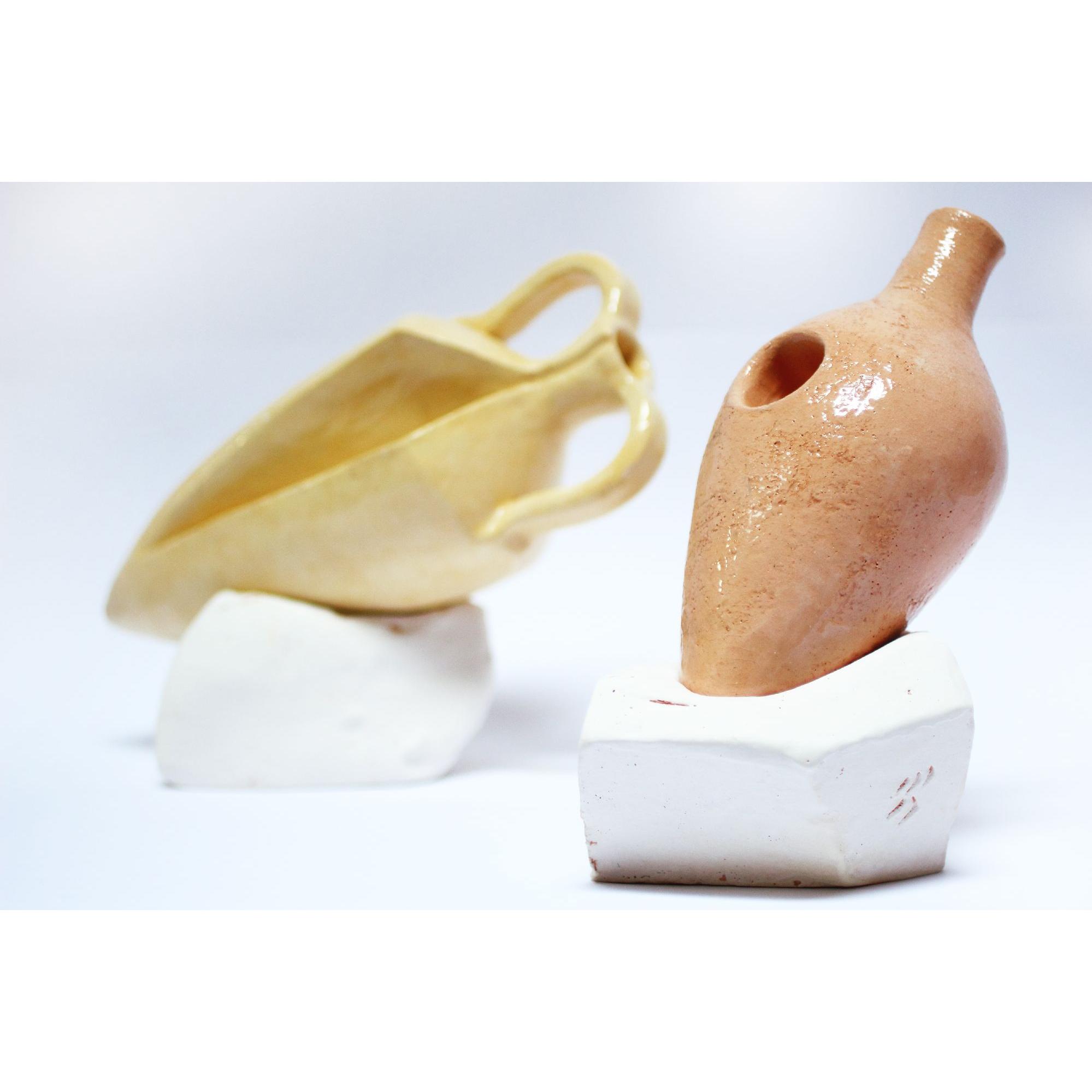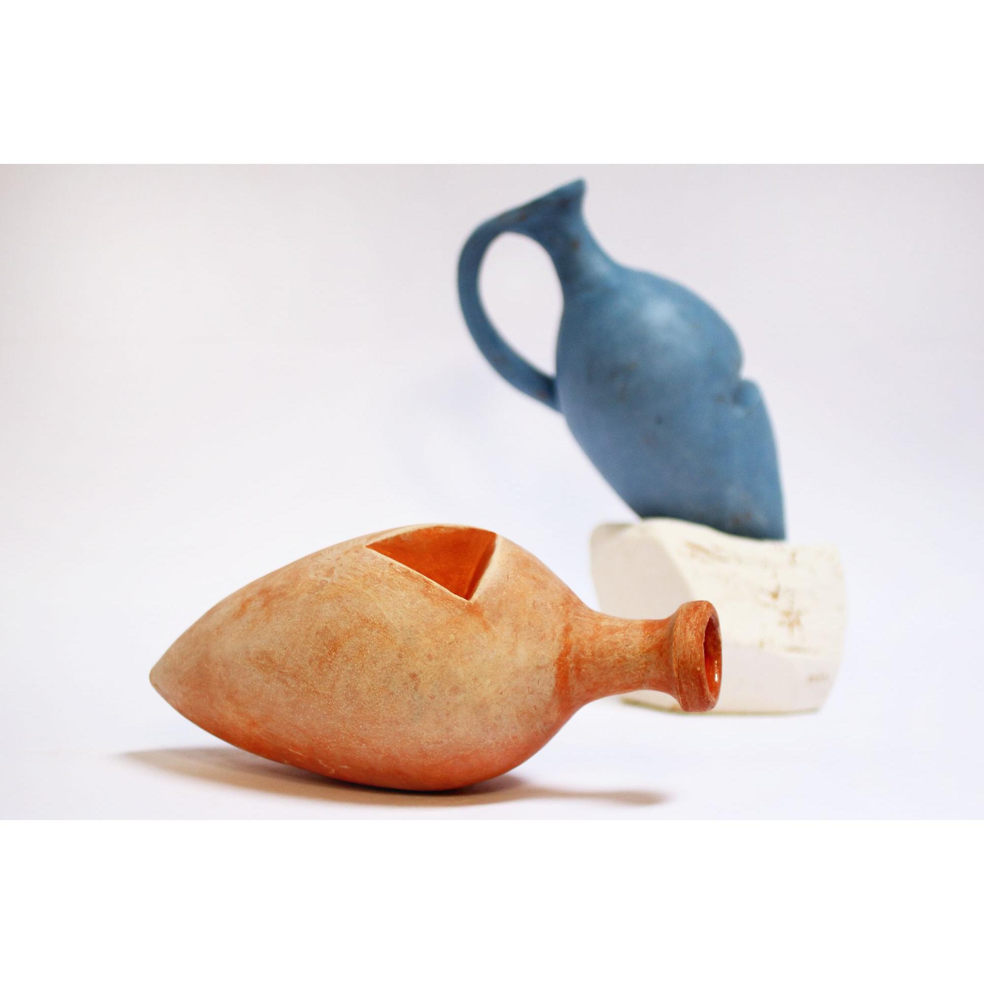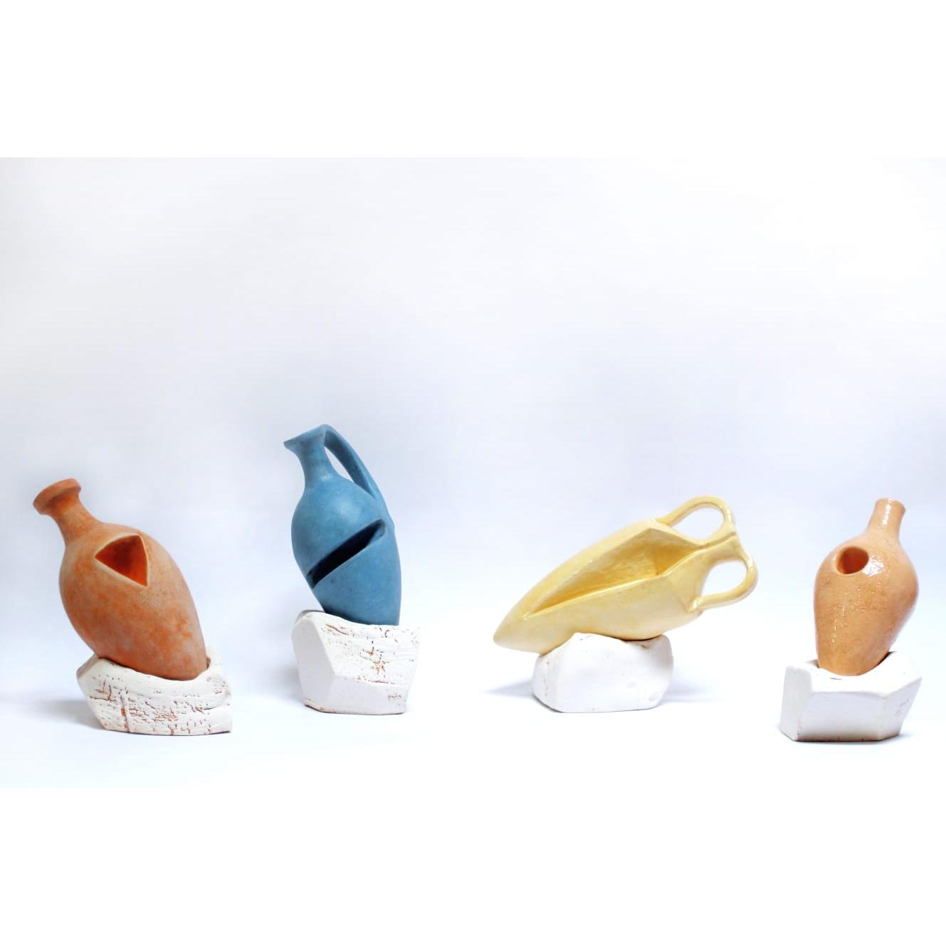 Nessi è una collezione di 4 piccole anfore – diverse per forma, colore e finiture - in ceramica,realizzate a colombino e brunitura e decorate engobbio - uno dei metodi di colorazione edecorazione più antichi – e cristalline. L’opera si completa con volumi d’appoggio, elementi inpietra calcarea sagomati a mura poligonali. Le anfore, per natura instabili, trovano nel basamentouna loro naturale allocazione come in terreni fertili e accoglienti.Le colorazioni pastello, nella duplice versione opaca e lucida, si abbinano a forme e dettagli di voltain volta differenti. Le anfore, ottenute dalla sottrazione di forme geometriche pure, abbinandosi aibasamenti, offrono una nuova lettura dell’insieme che ri-vive sotto una luce inedita.Oggetto “antico” ma sempre attuale l'anfora è, al tempo stesso, contenitore e contenuto erappresenta in ogni senso l'incontro di tutti i reciproci esistenti in Natura, esprimendo sul pianodella coscienza manifesta una dimensione consapevole, inclusiva e totale, in cui prevale l'aspettocontemplativo e compartecipativo della realtà. In alchimia, l’anfora, esprime “la coincidenza degliopposti” e in senso ermetico “l'identità di alto e basso”: è quindi metafora di tutto ciò che esiste inogni ciclo di vita-morte-rinascita e sue trasformazioni.L’opera, rilettura contemporanea delle antiche anfore romane, diventa espressione di un saper farelocale legato alla tradizione. L’Anfora, diventa testimonianza di un viaggio fatto di terre, sapori e tradizioni, contenitoremetaforico di storie passate e future, “misura di capacità”, che trova la sua funzione primaria nellaconservazione di quanto di più prezioso il territorio locale offre.Anfore che rappresentano e custodiscono la memoria di un paesaggio culturale e di una grandeeredità artistica.