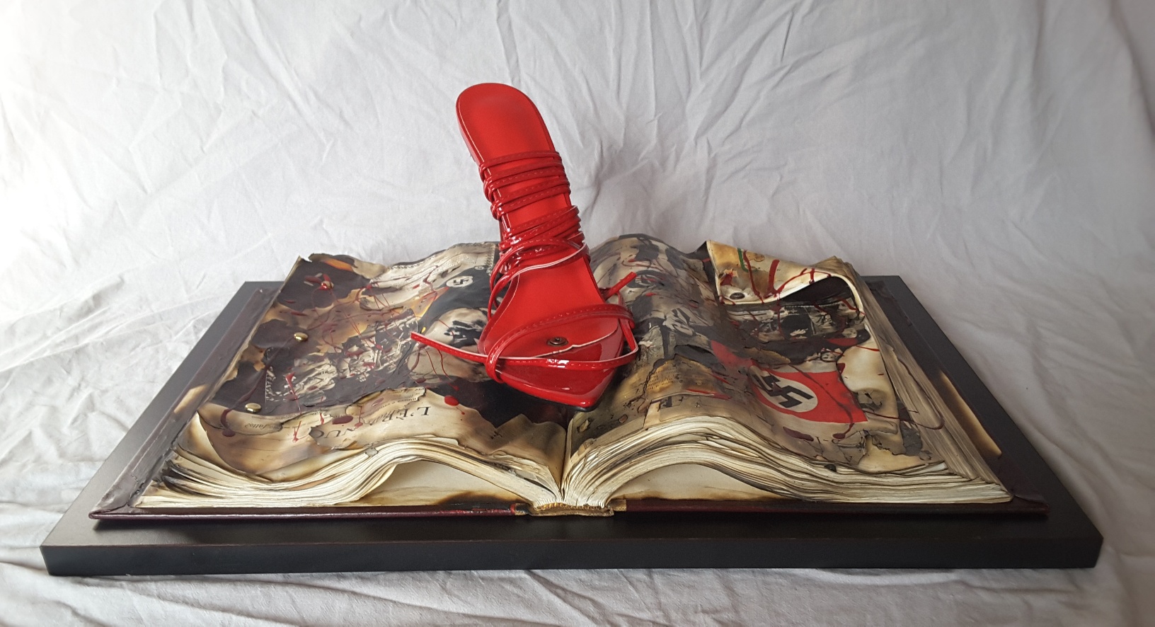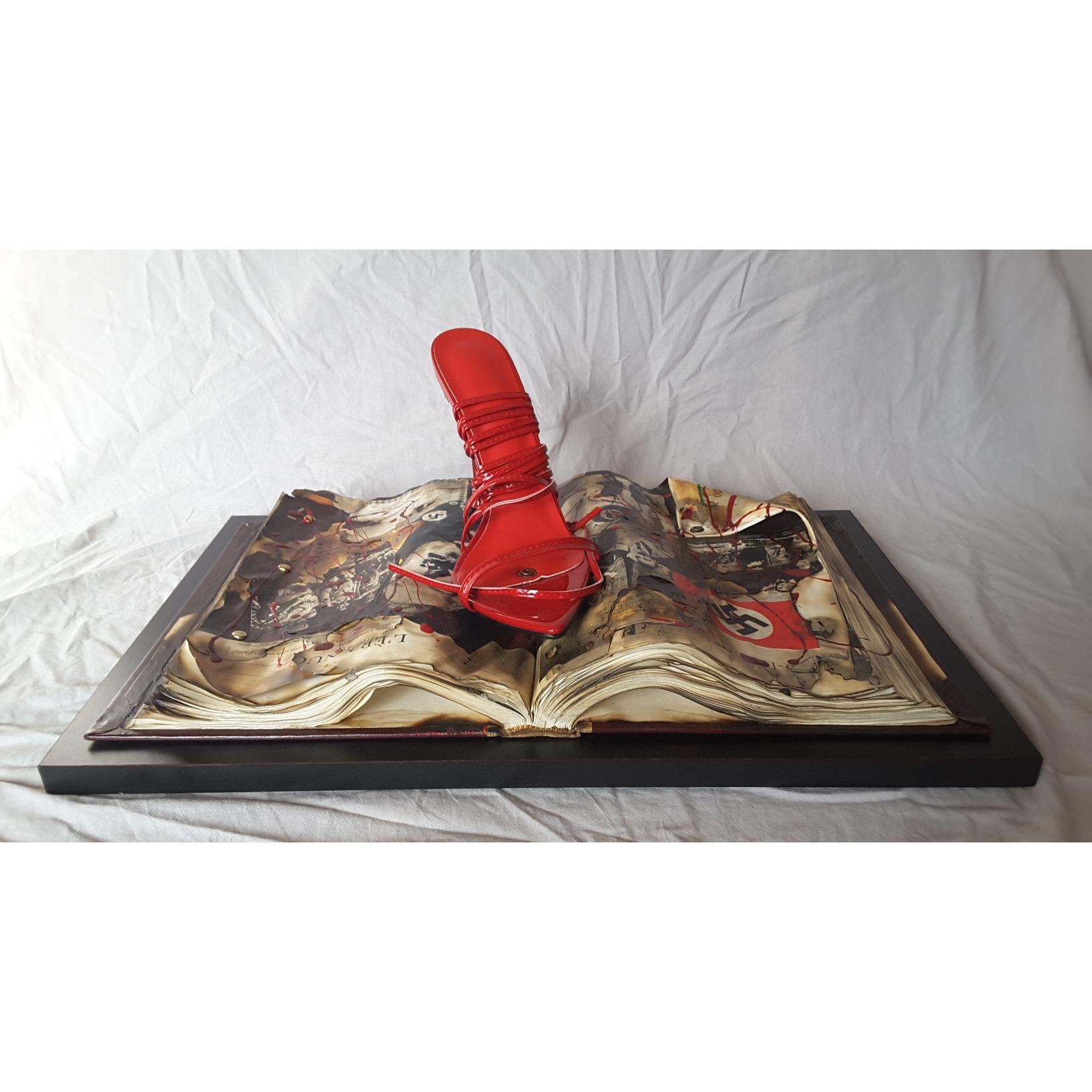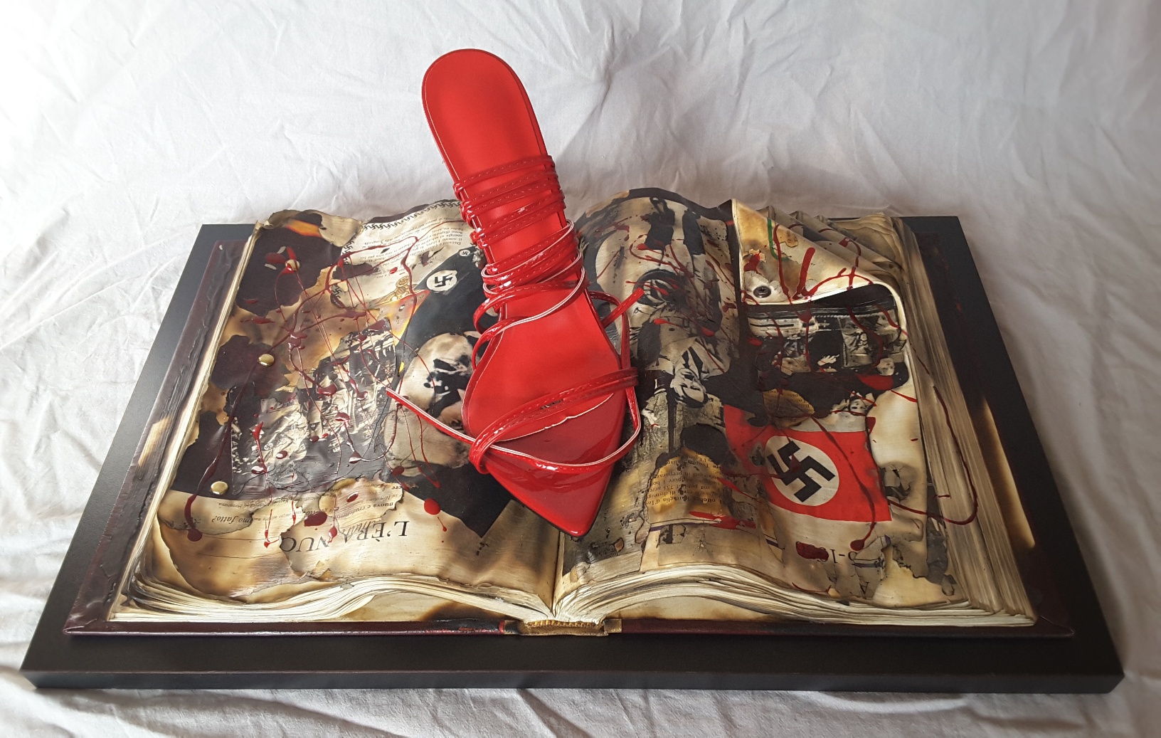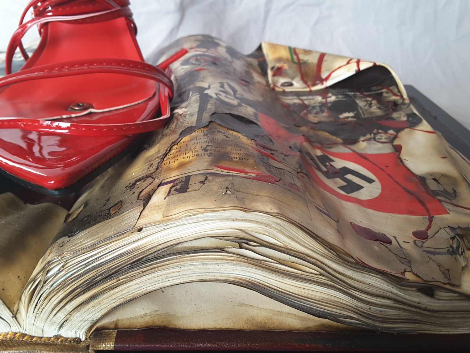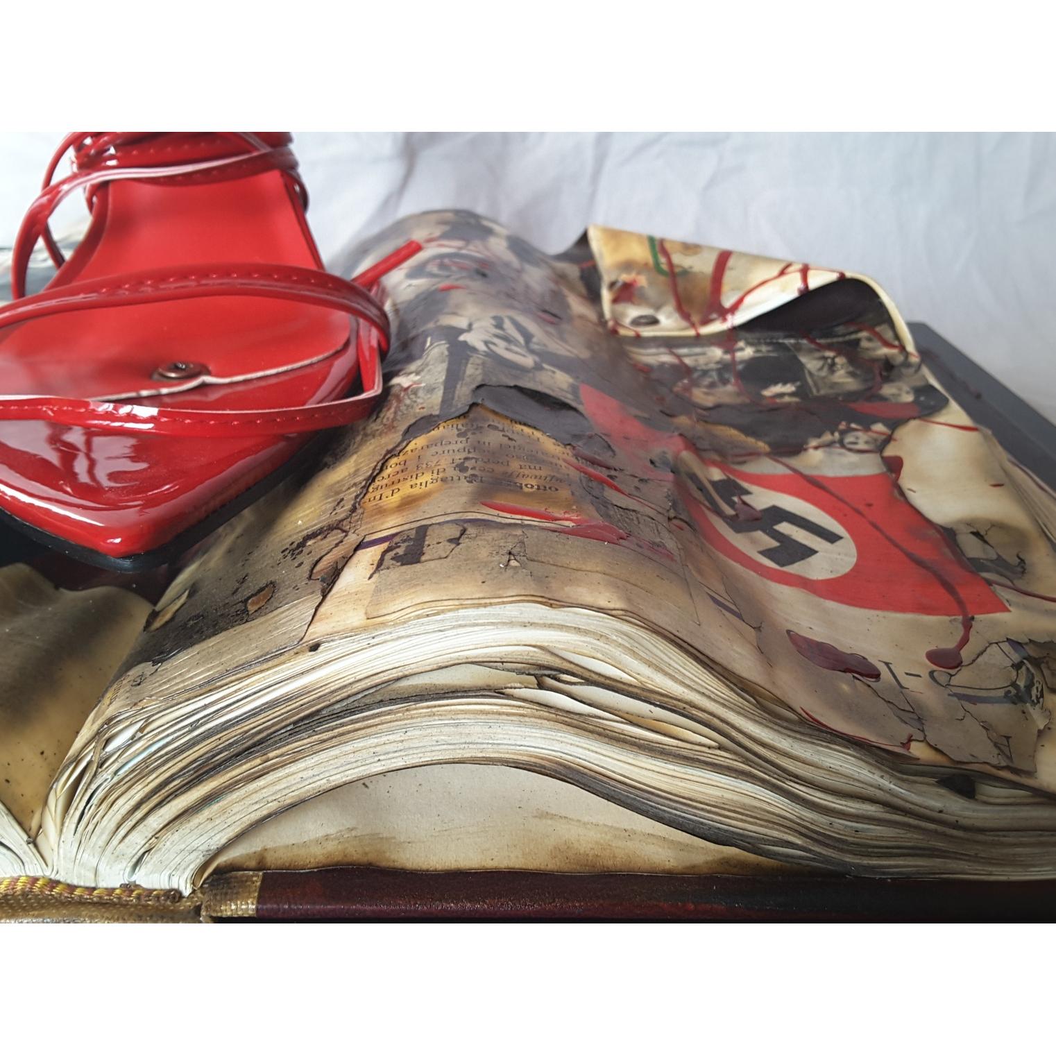 A female foot wrapped in thin red straps presses down on an open book containing fragments of Nazi iconography. The gesture is silent yet decisive: not an act of furious destruction, but one of symbolic superiority.