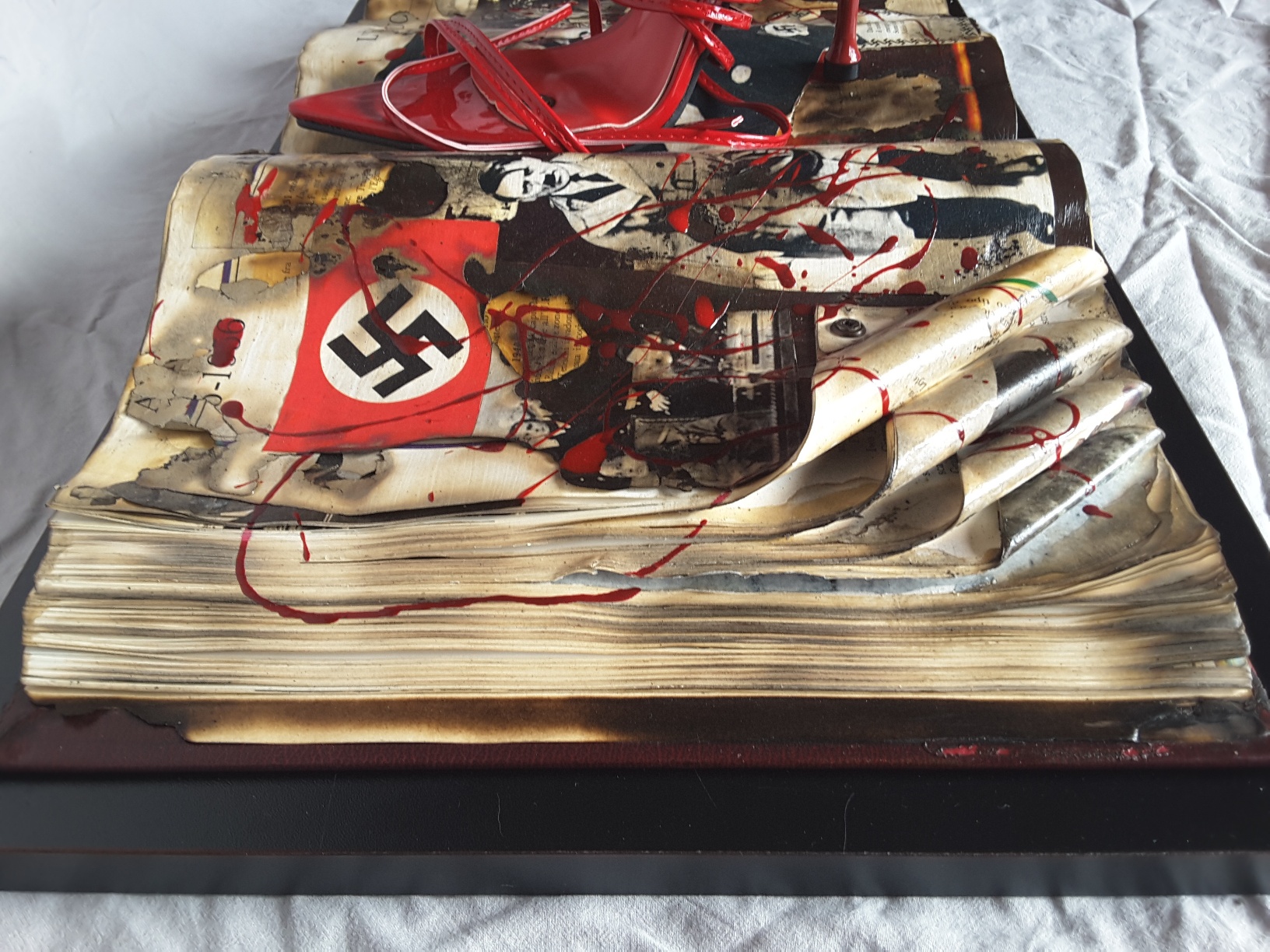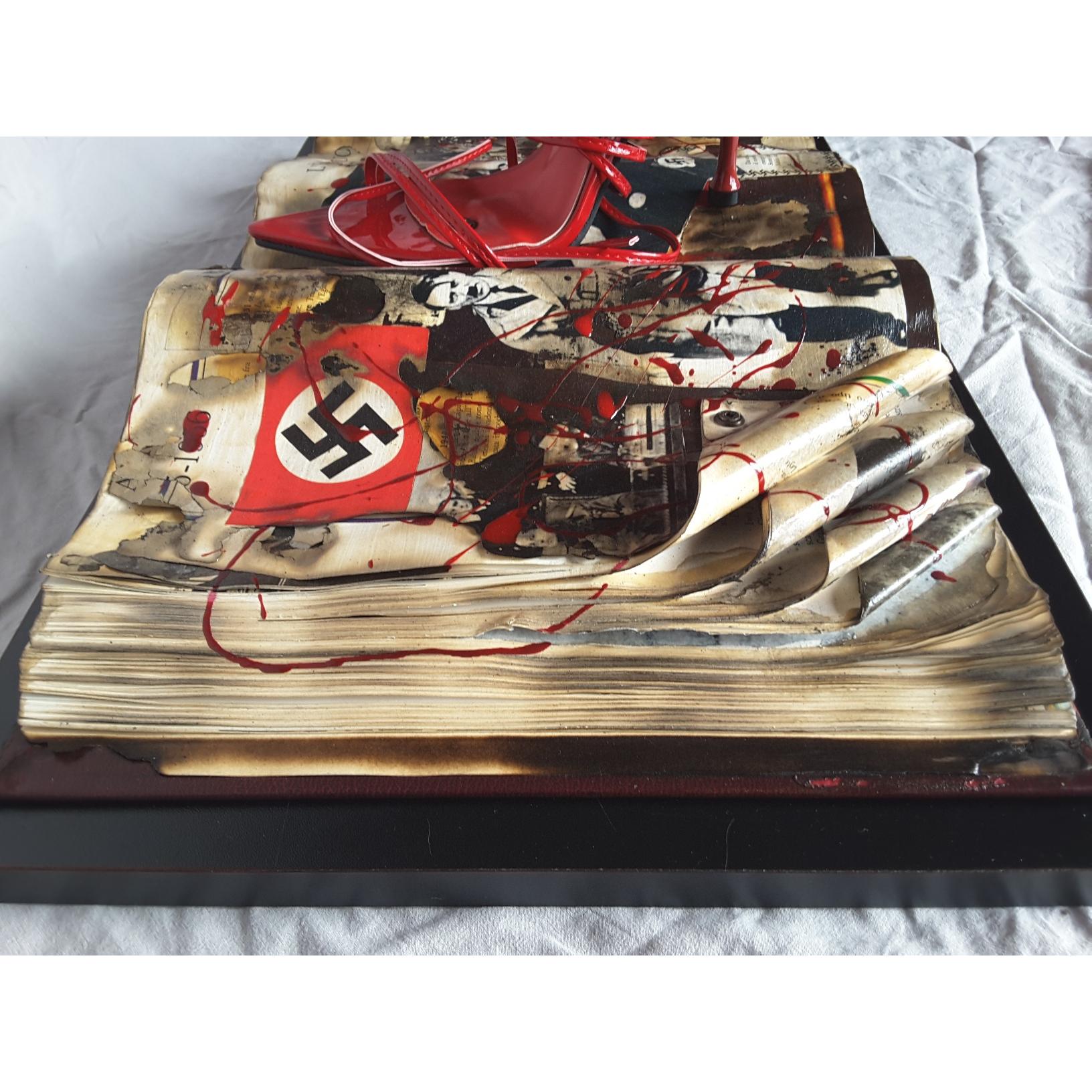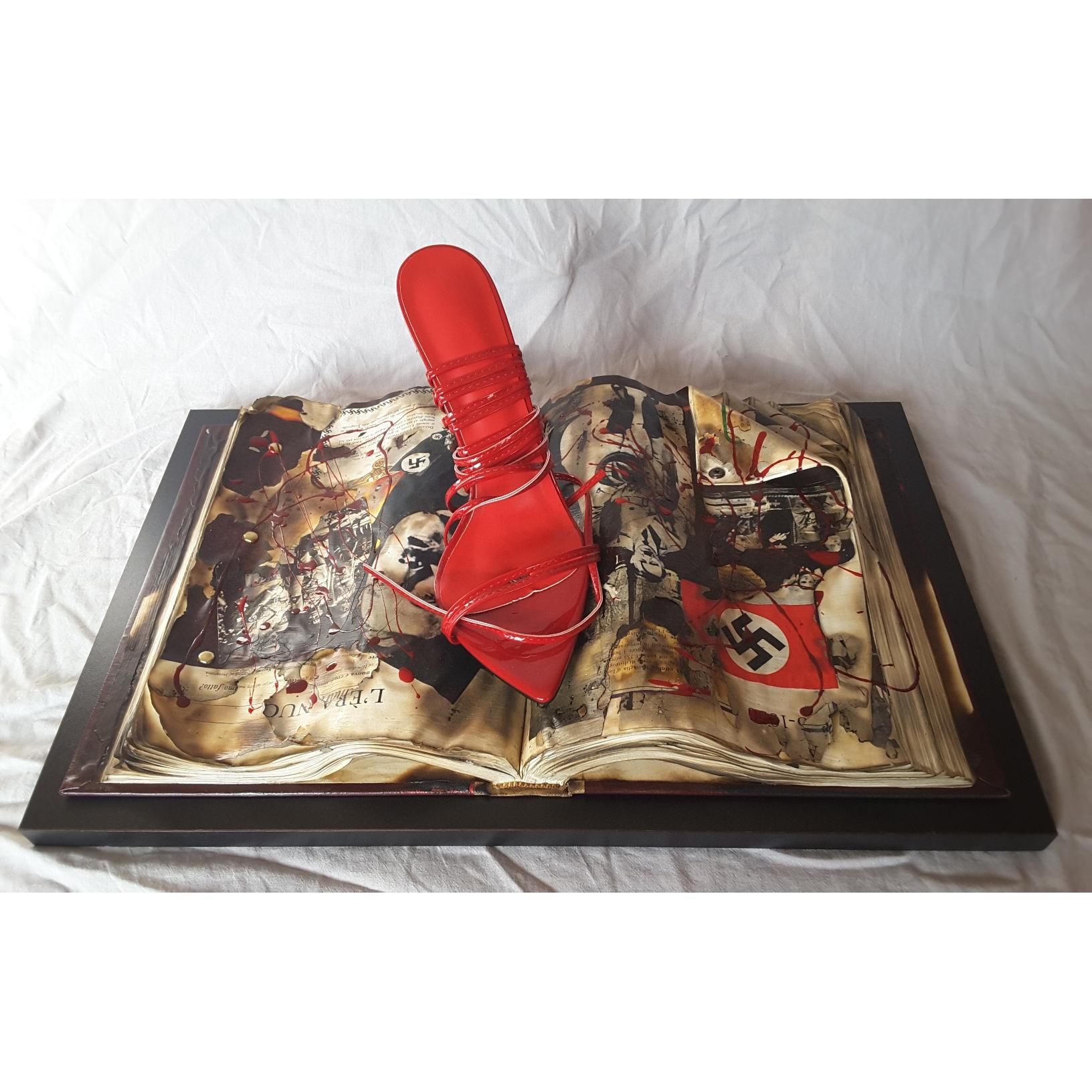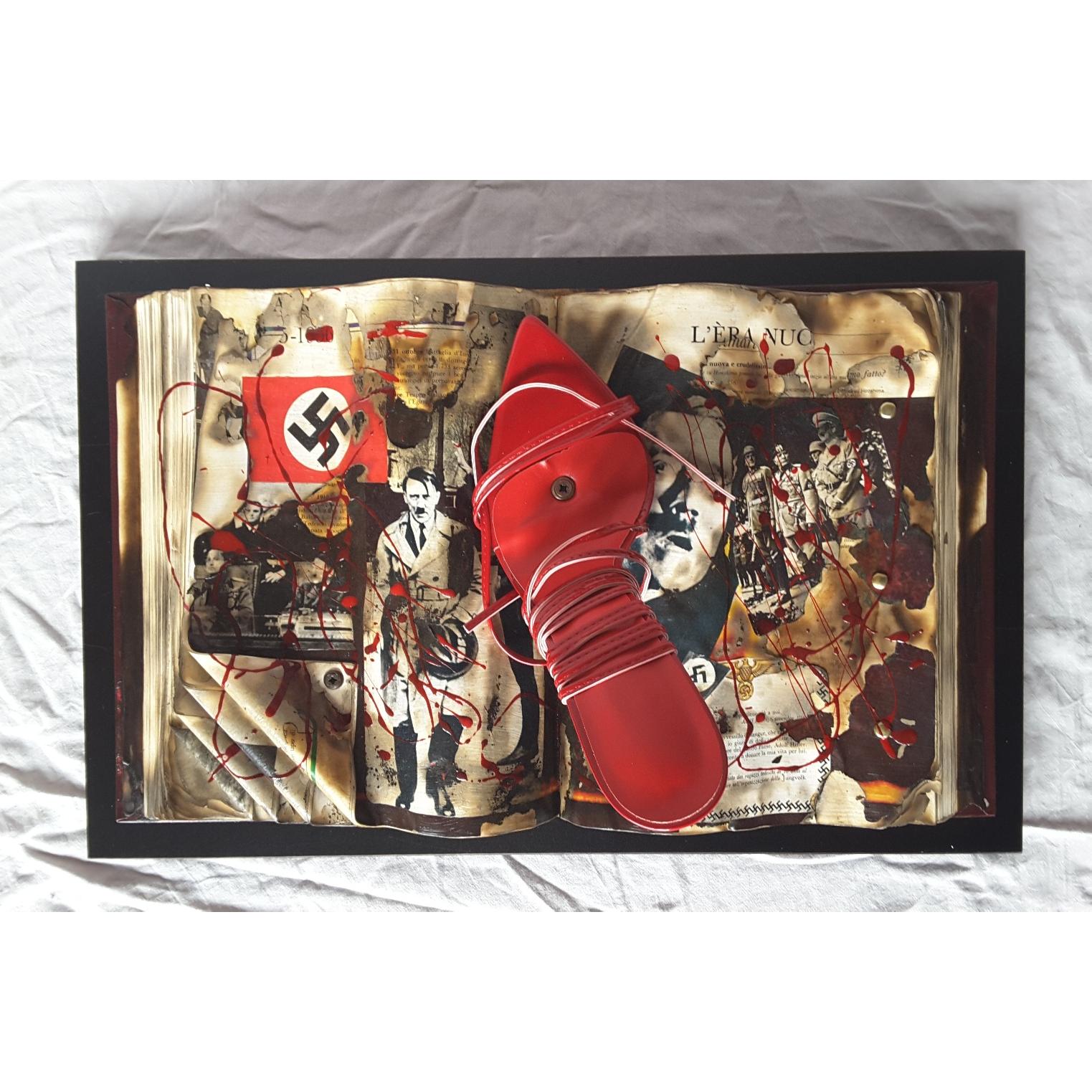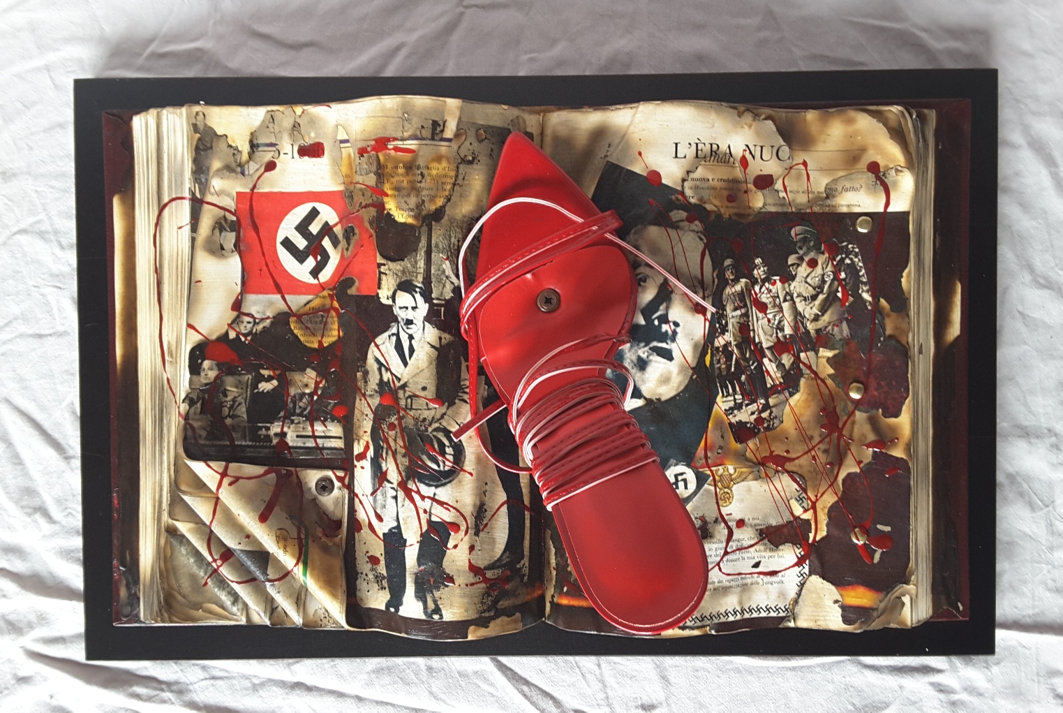 A female foot wrapped in thin red straps presses down on an open book containing fragments of Nazi iconography. The gesture is silent yet decisive: not an act of furious destruction, but one of symbolic superiority.