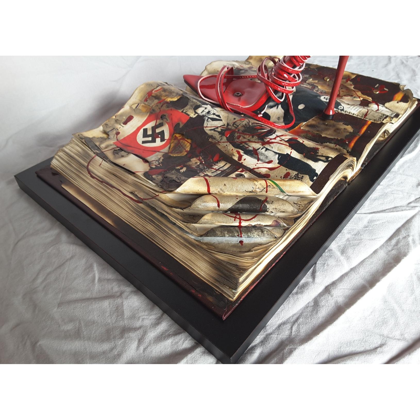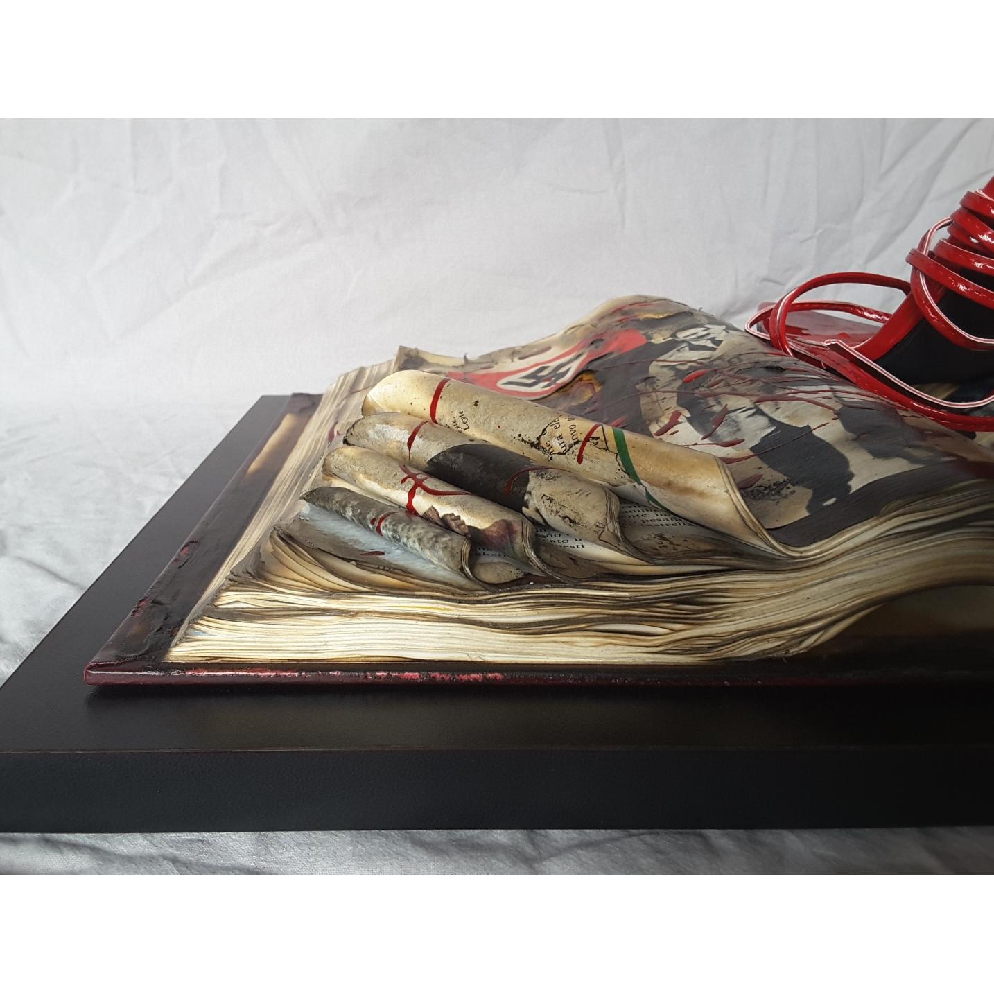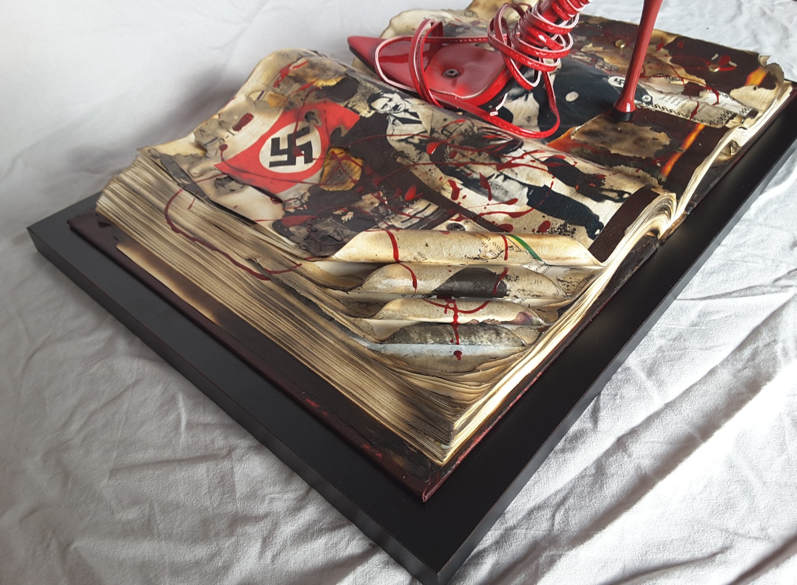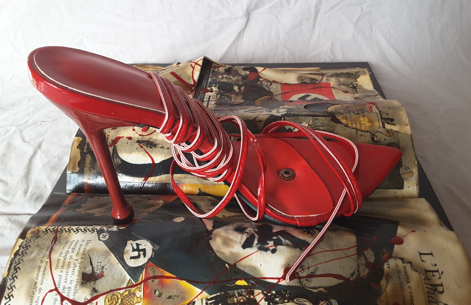 A female foot wrapped in thin red straps presses down on an open book containing fragments of Nazi iconography. The gesture is silent yet decisive: not an act of furious destruction, but one of symbolic superiority.