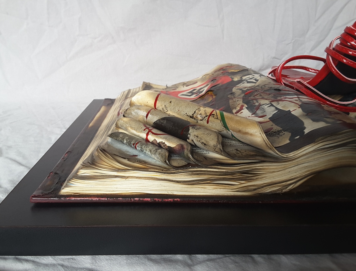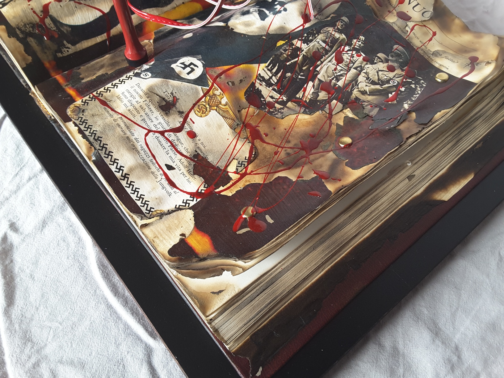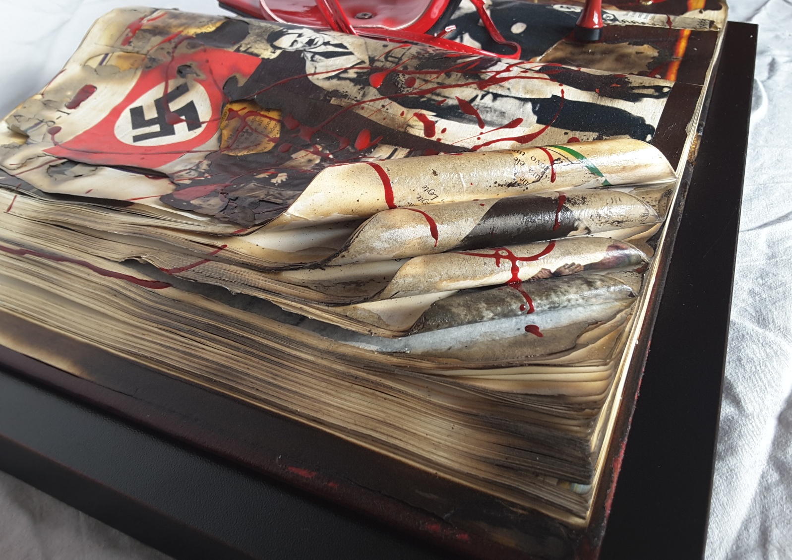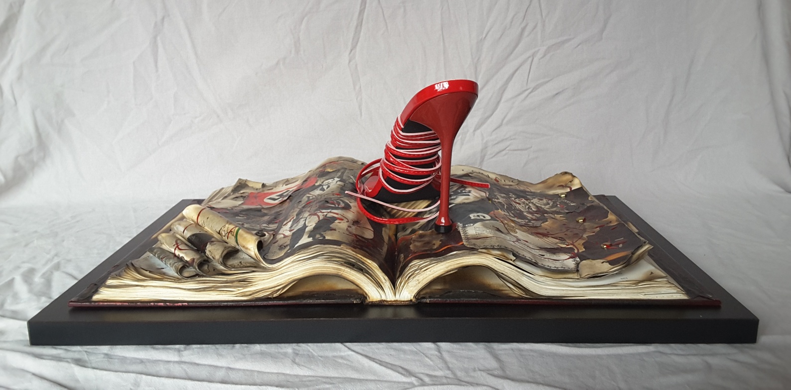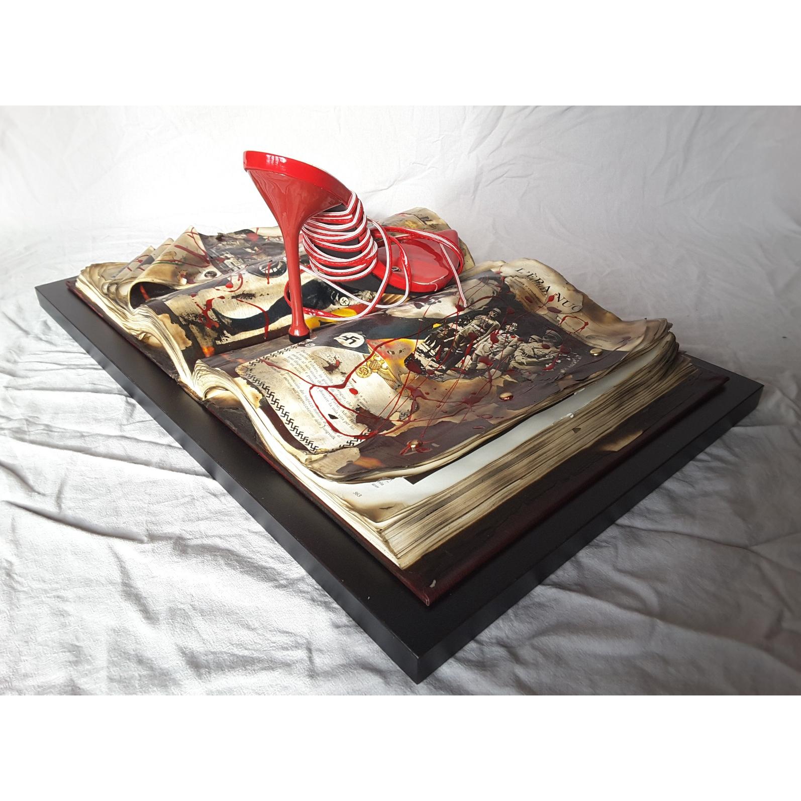 A female foot wrapped in thin red straps presses down on an open book containing fragments of Nazi iconography. The gesture is silent yet decisive: not an act of furious destruction, but one of symbolic superiority.