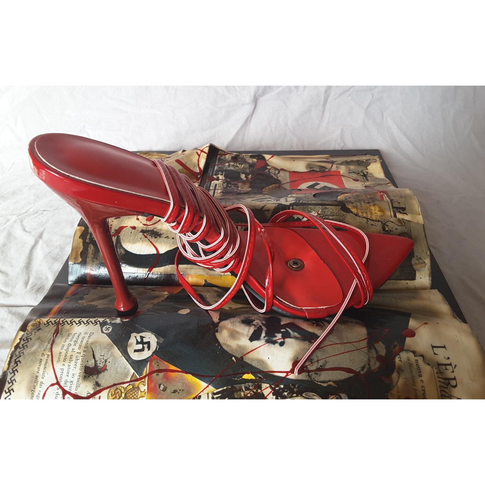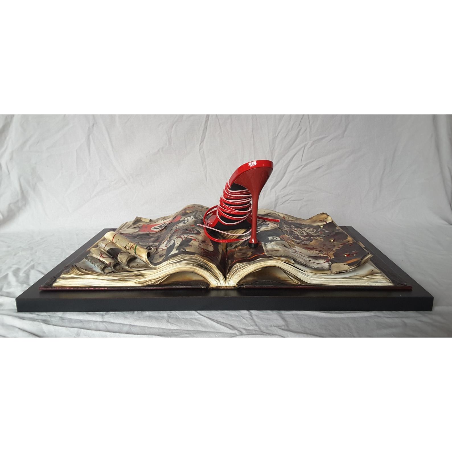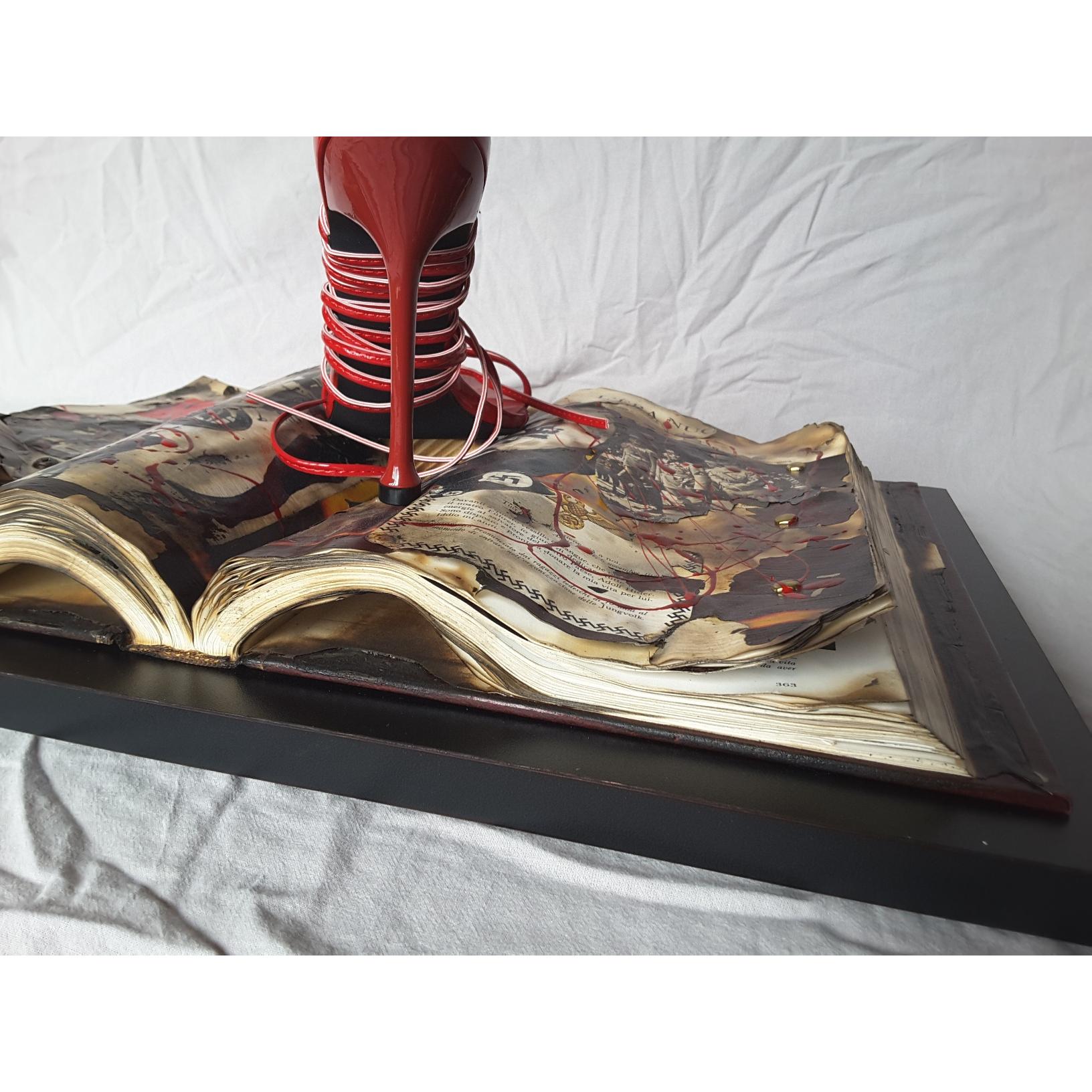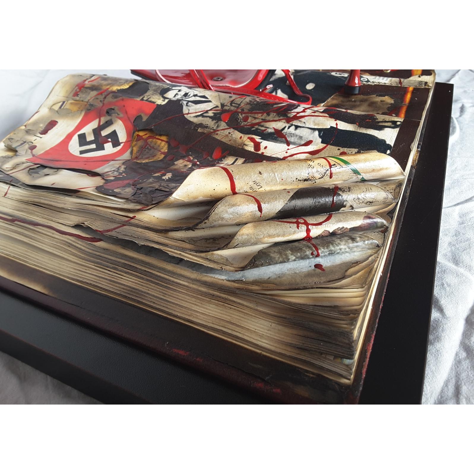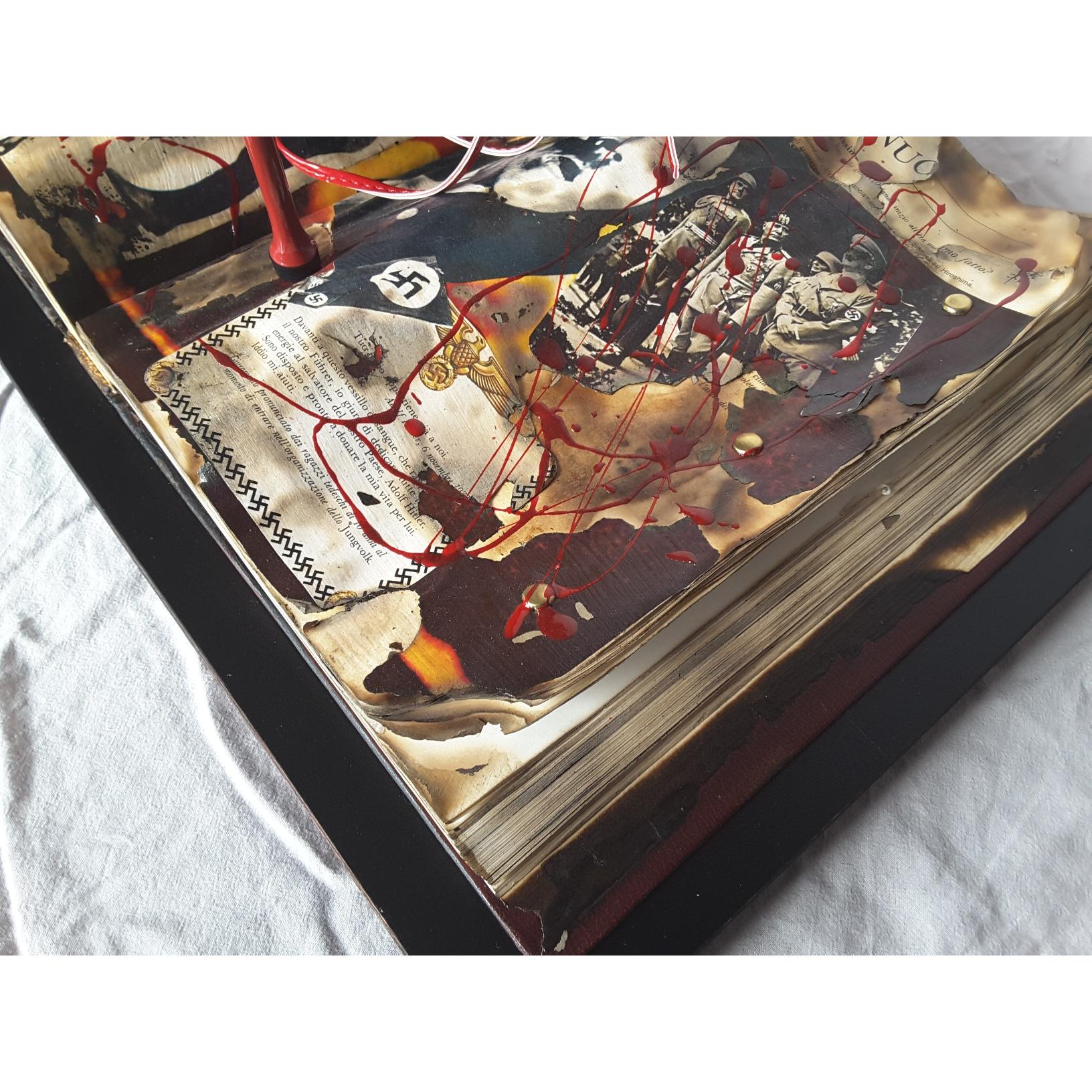 A female foot wrapped in thin red straps presses down on an open book containing fragments of Nazi iconography. The gesture is silent yet decisive: not an act of furious destruction, but one of symbolic superiority.