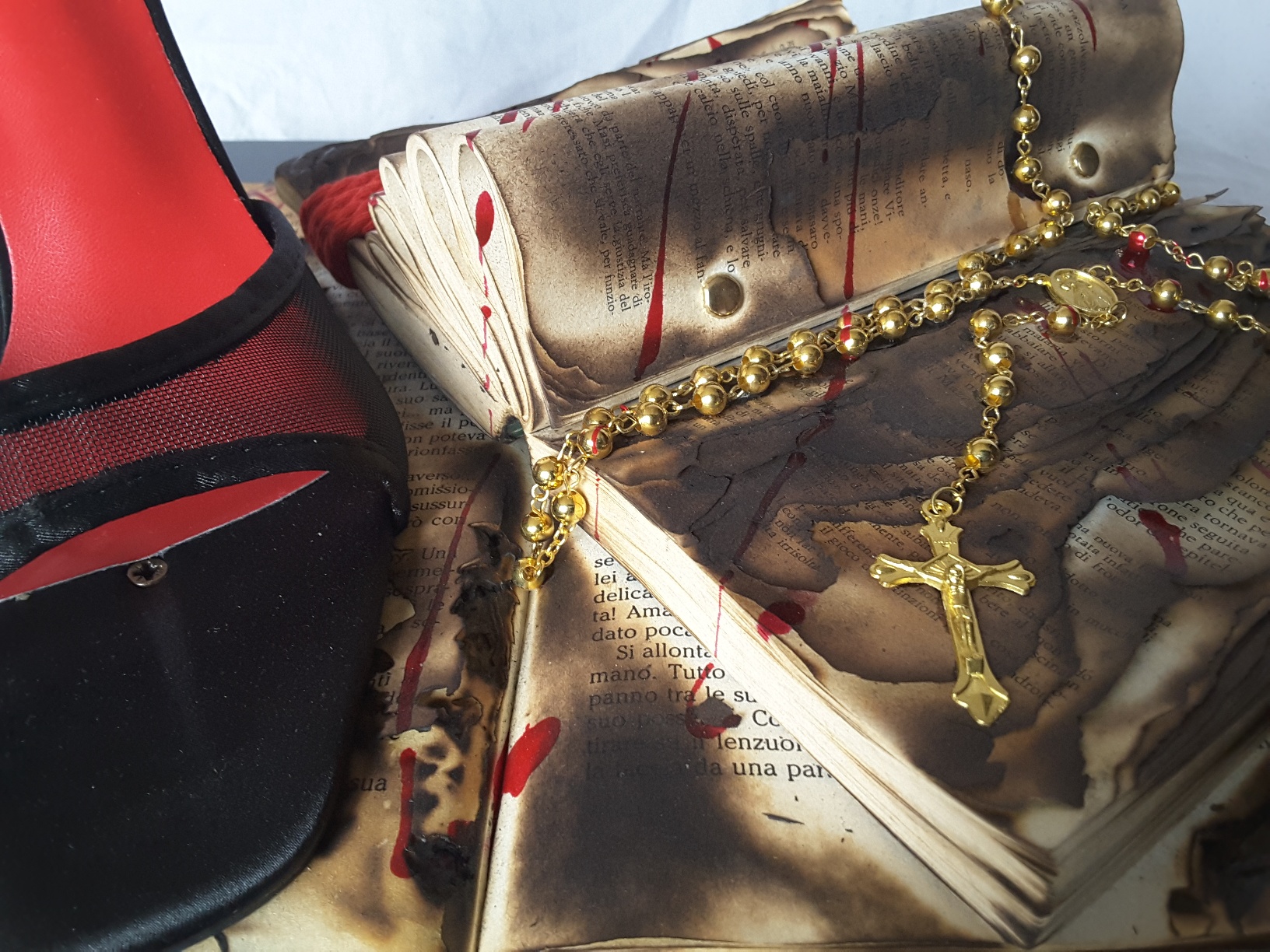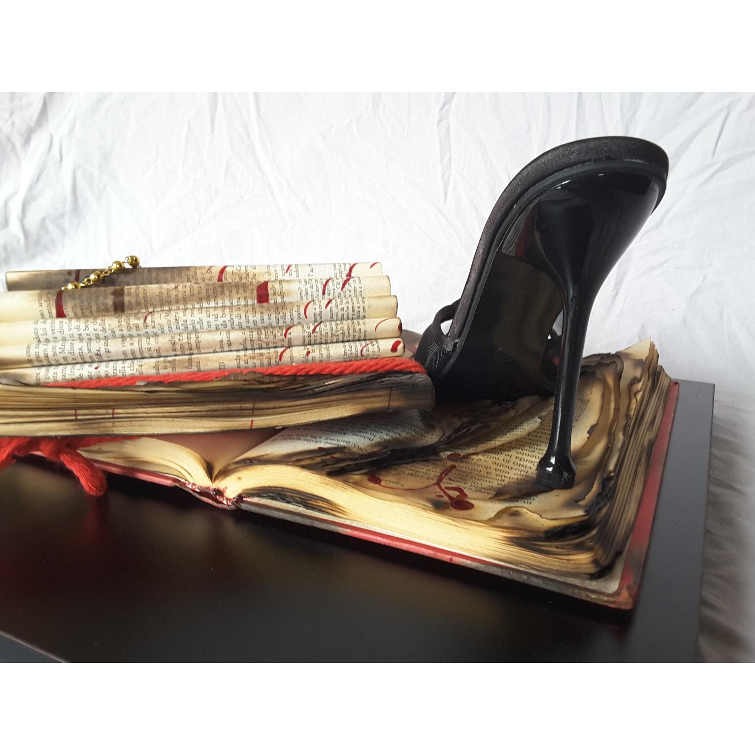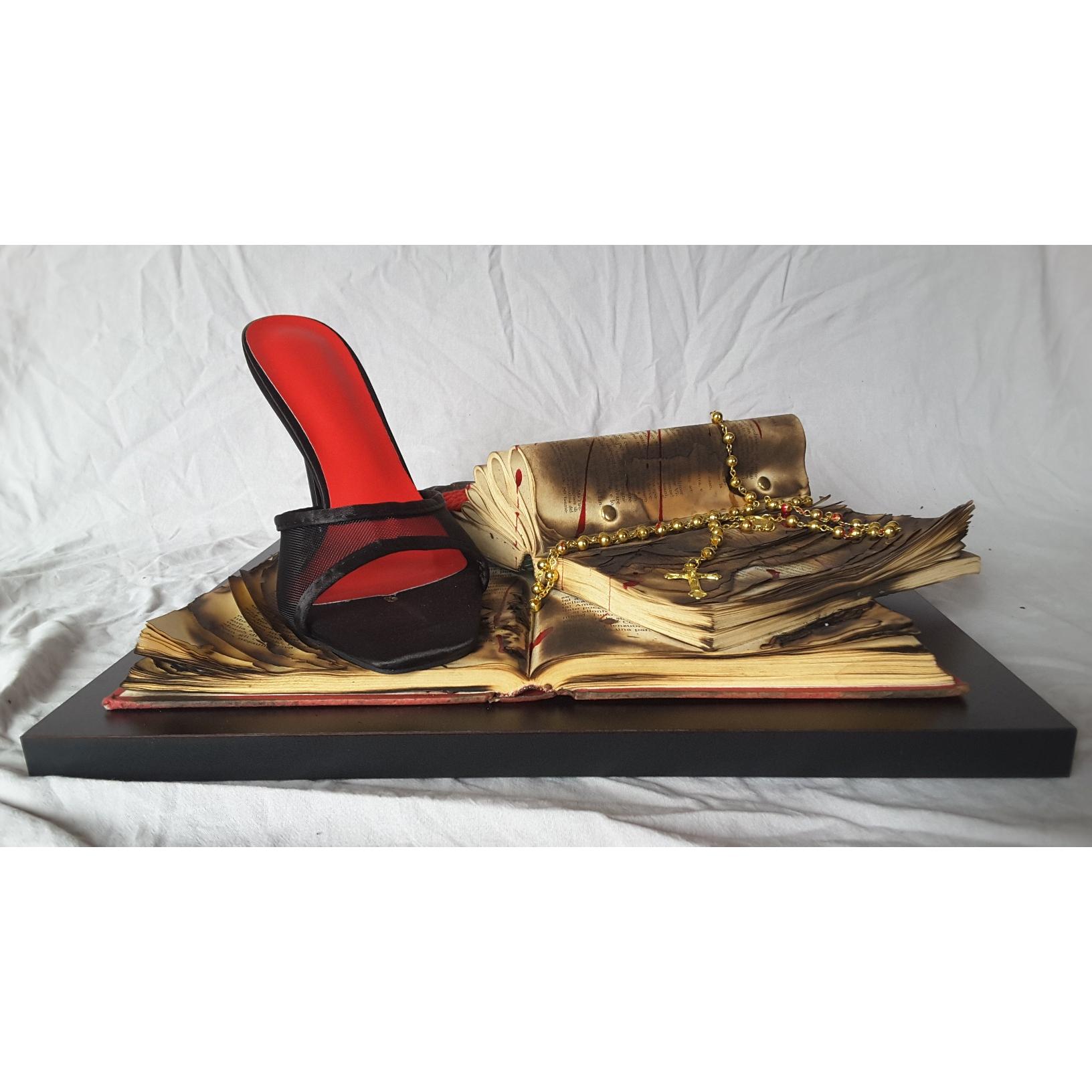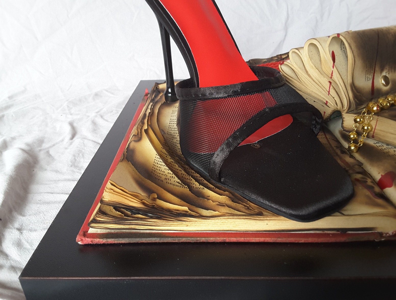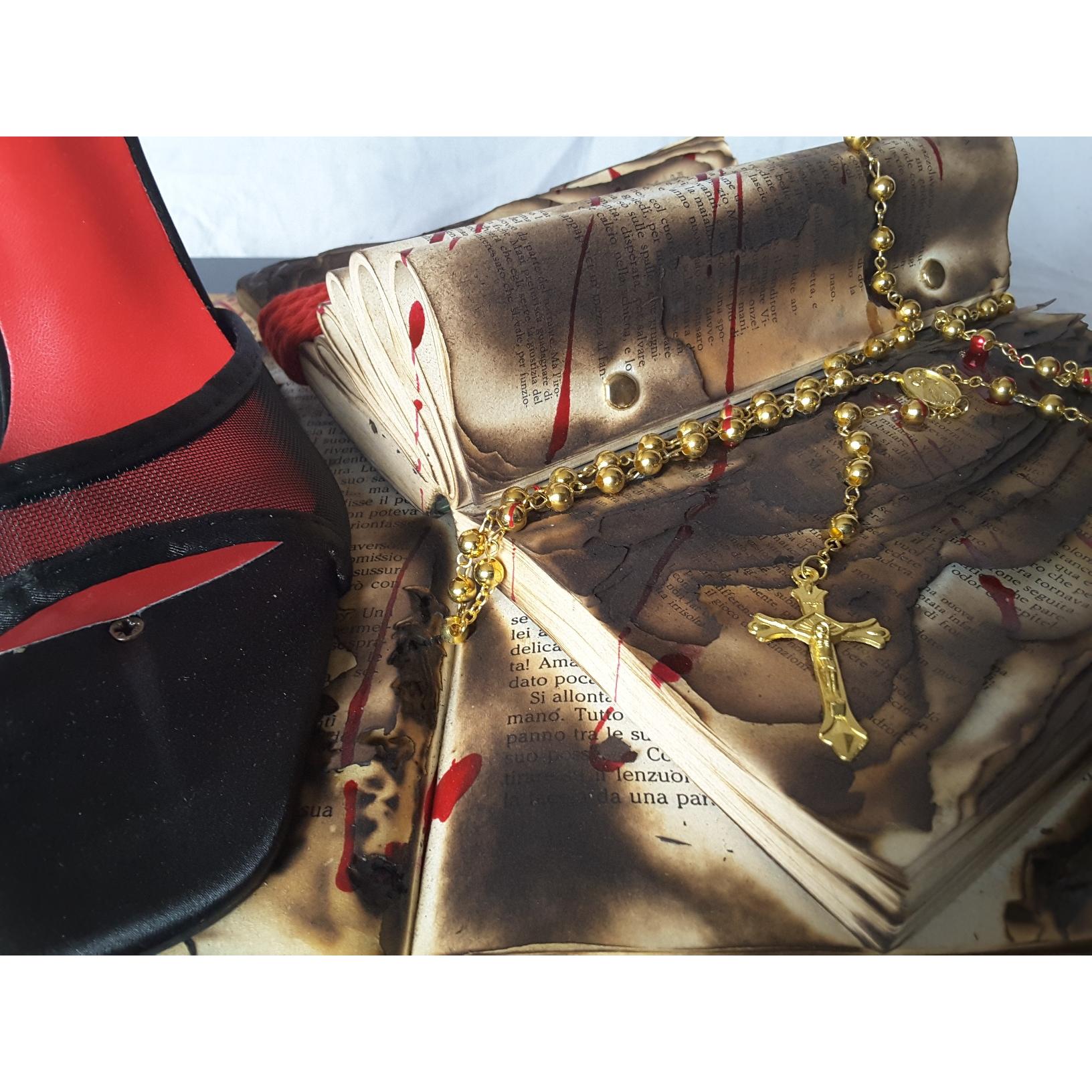 A thin heel rests on a wounded book, its pages burned, a golden rosary abandoned between the paper. Sacred belief and knowledge are brought to the same level: beneath a foot.This is not destruction — it’s a statement of power.
