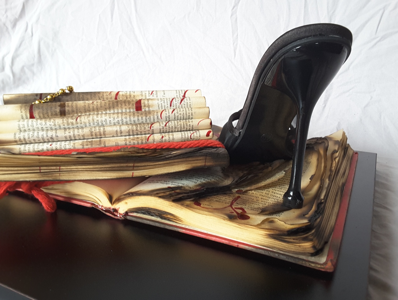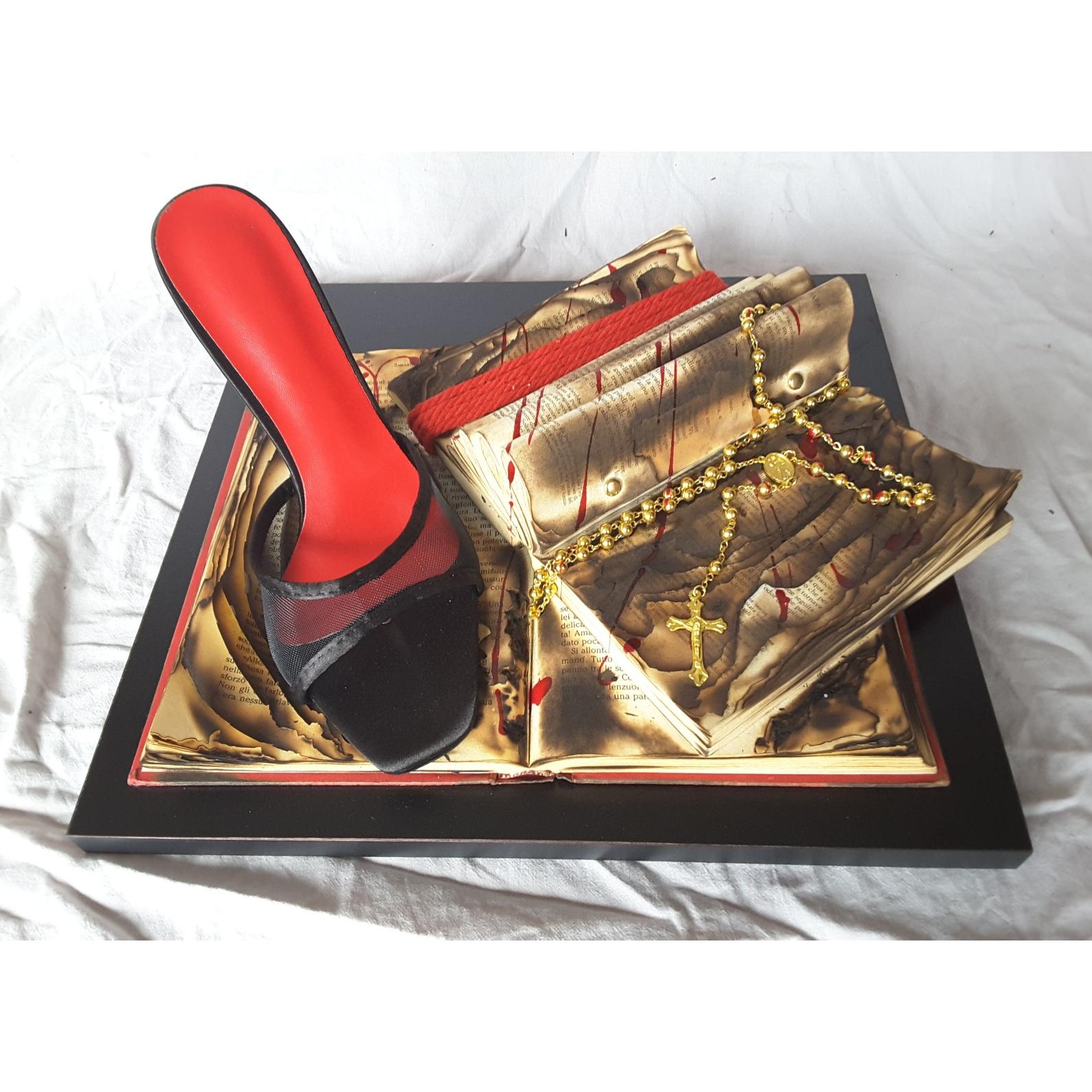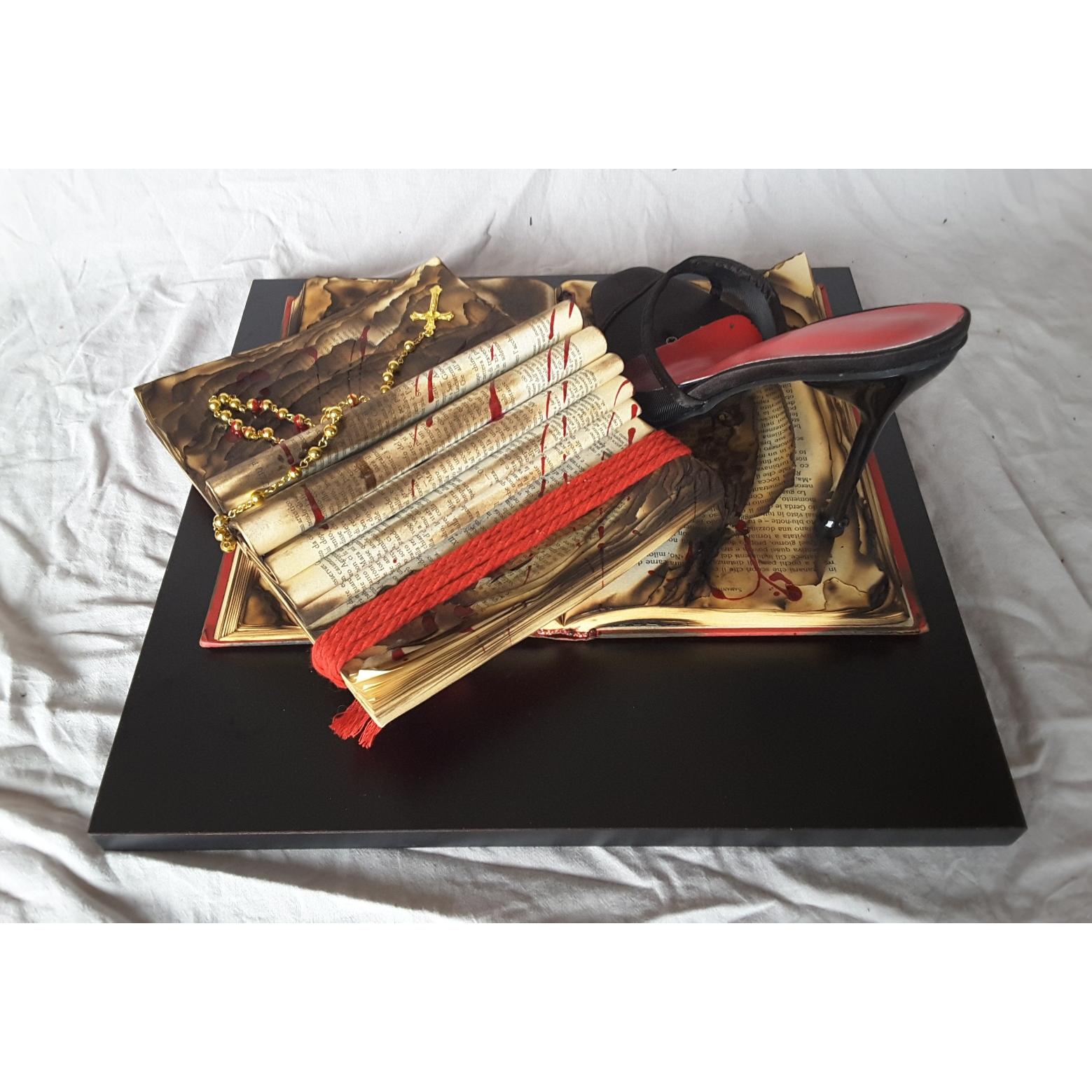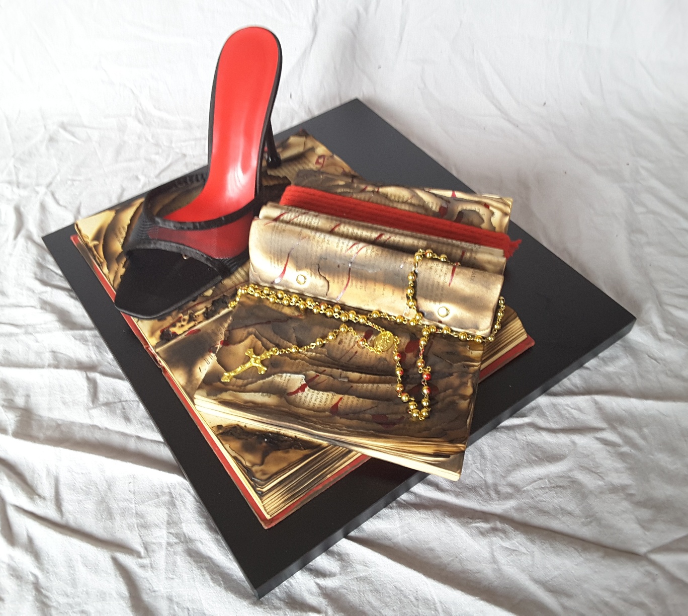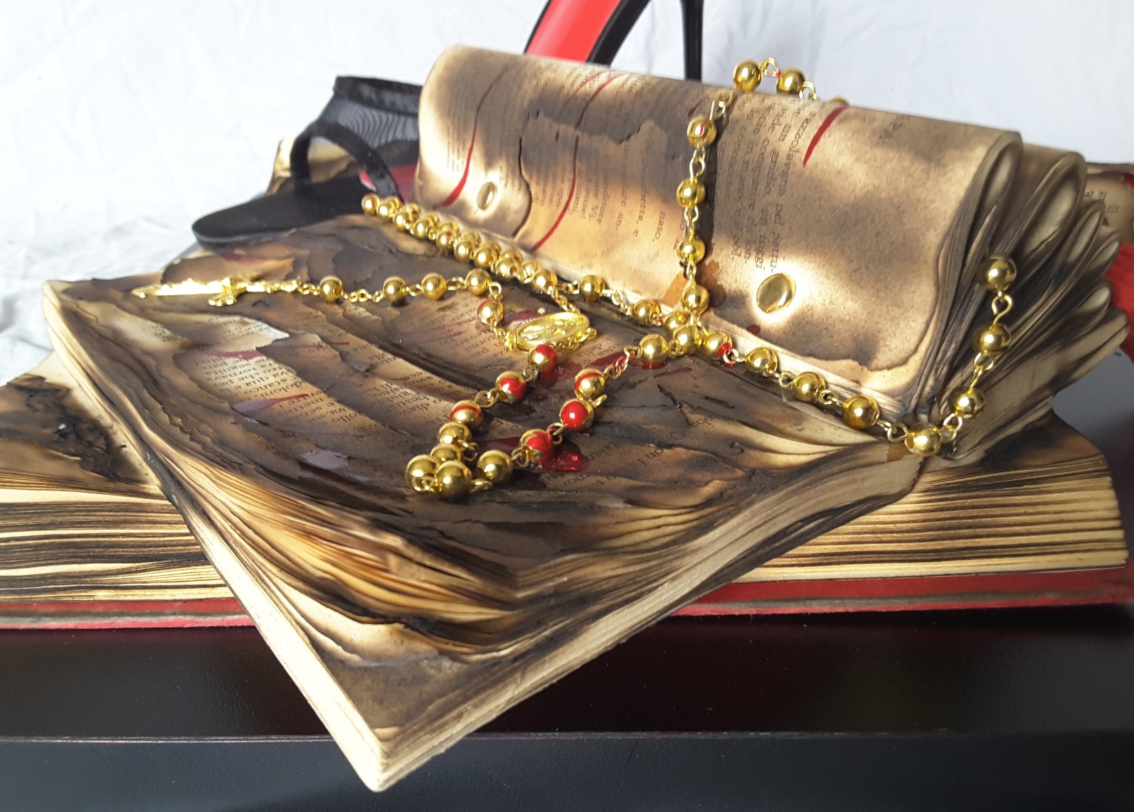 A thin heel rests on a wounded book, its pages burned, a golden rosary abandoned between the paper. Sacred belief and knowledge are brought to the same level: beneath a foot.This is not destruction — it’s a statement of power.