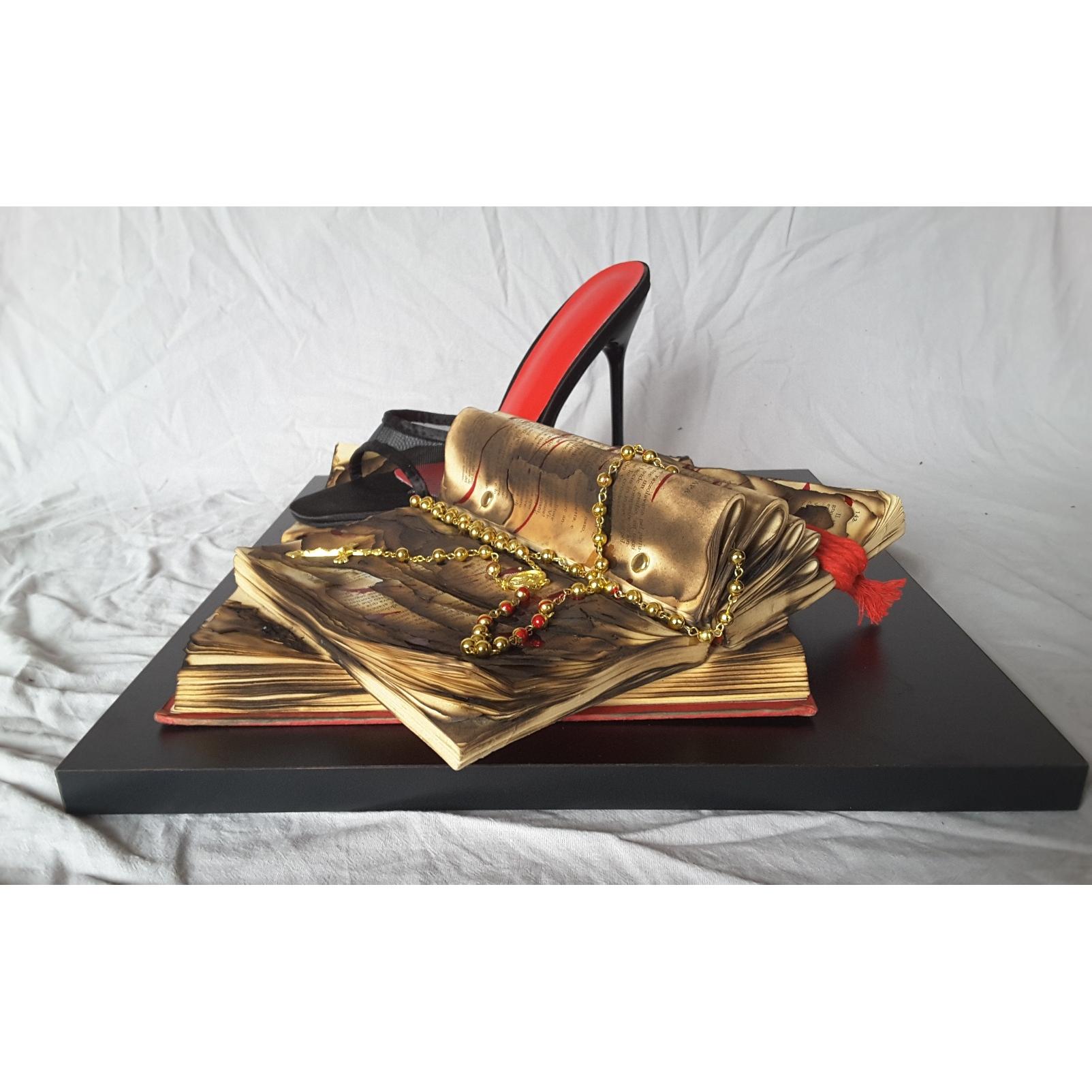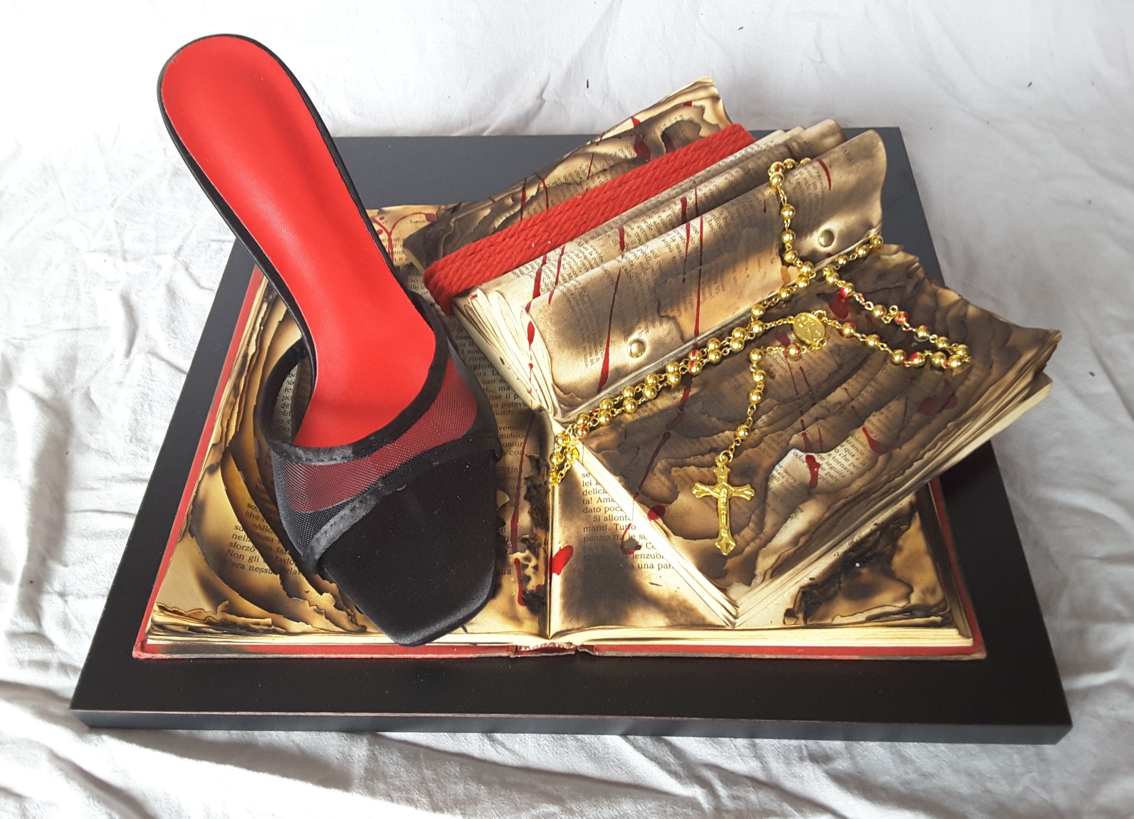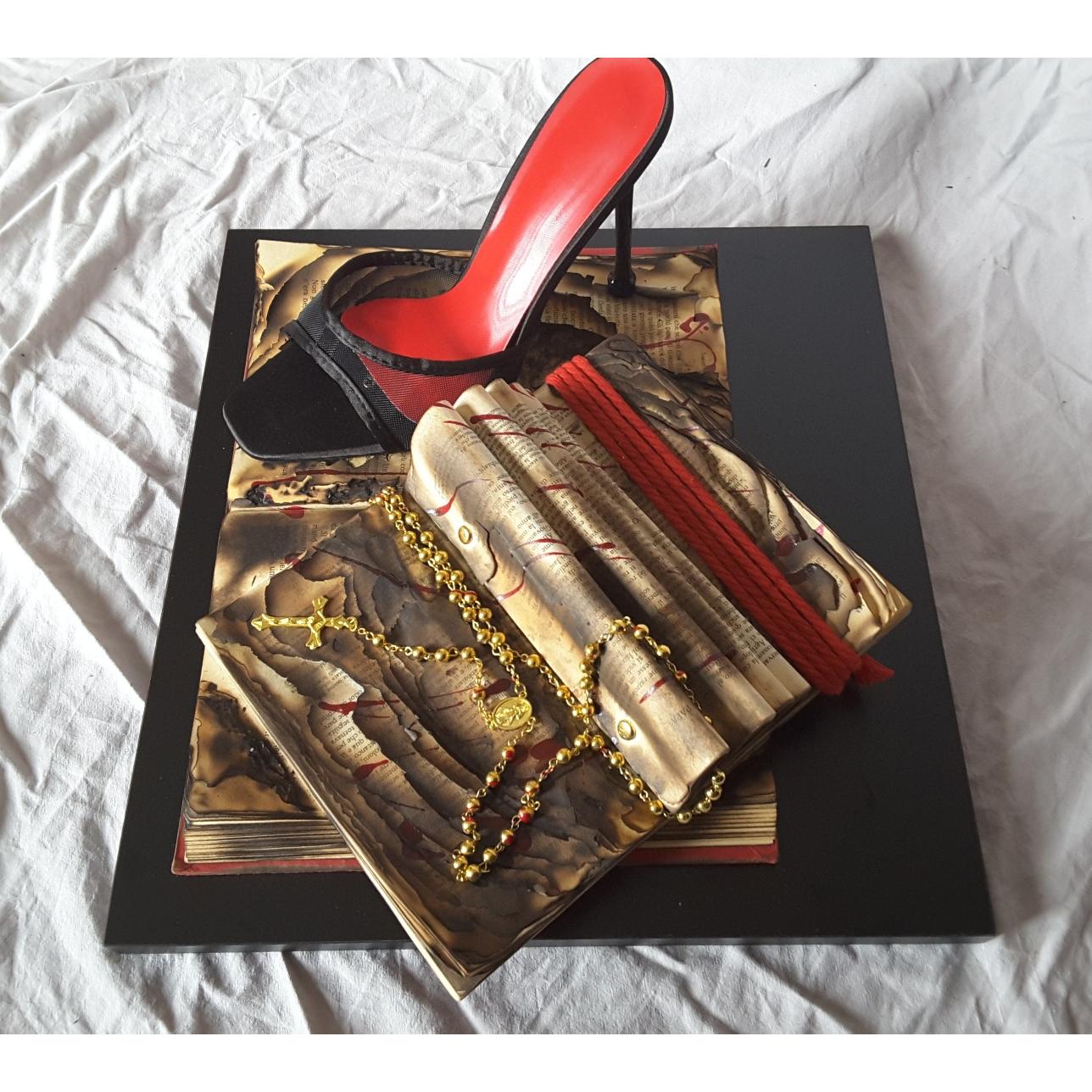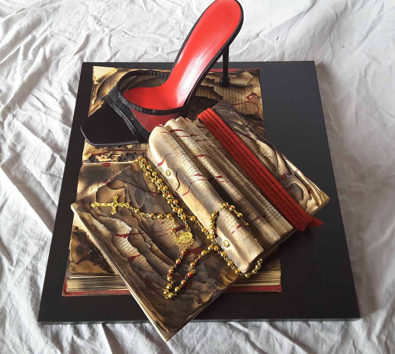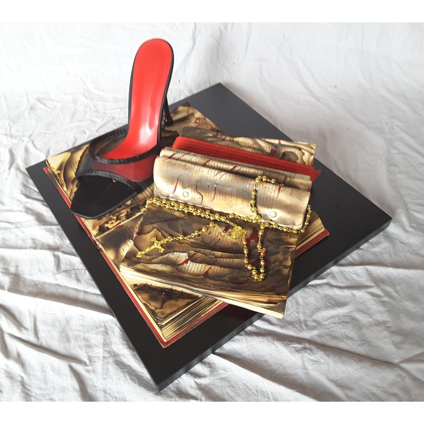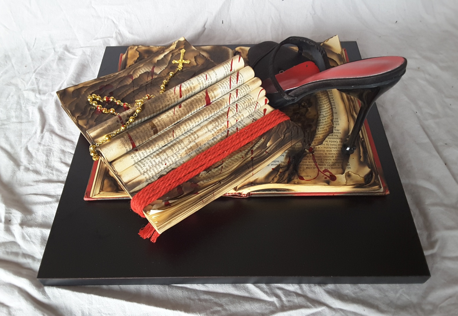 A thin heel rests on a wounded book, its pages burned, a golden rosary abandoned between the paper. Sacred belief and knowledge are brought to the same level: beneath a foot.This is not destruction — it’s a statement of power.