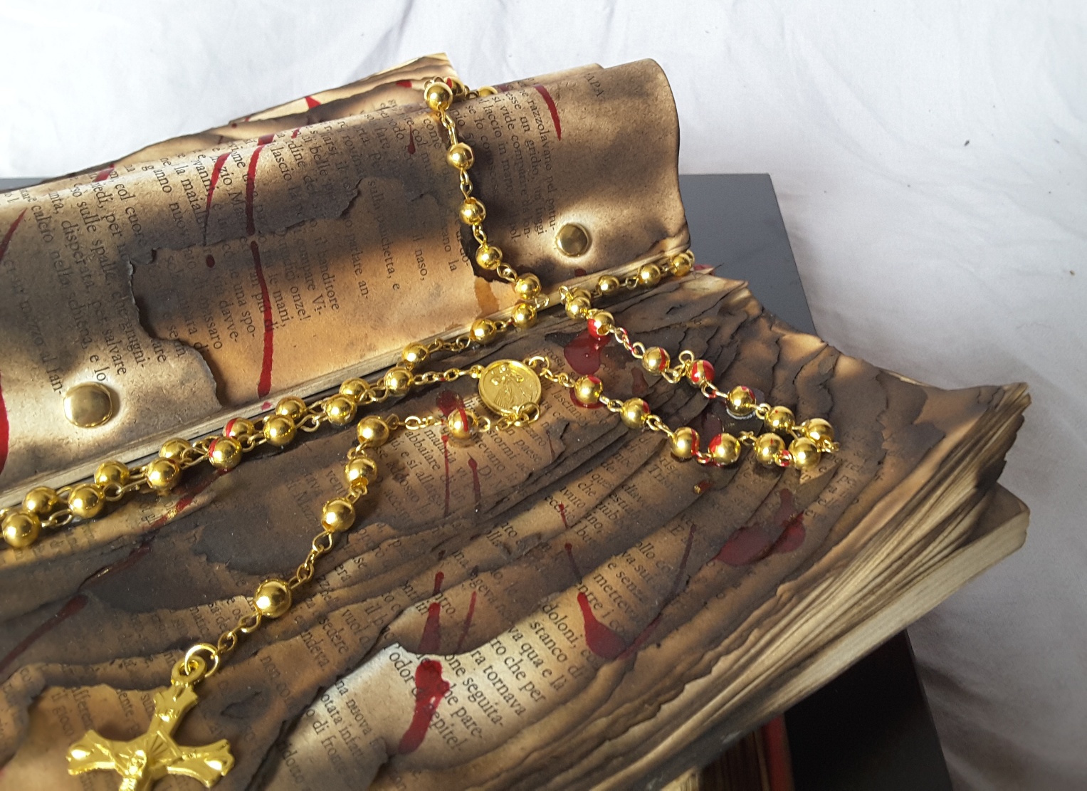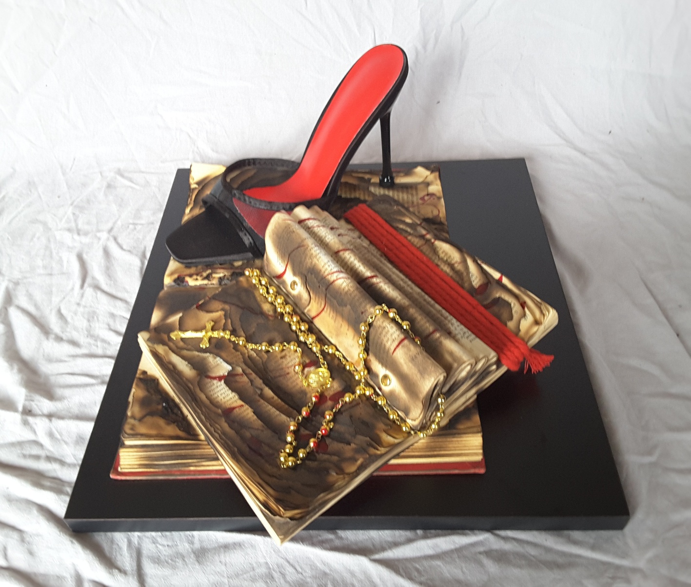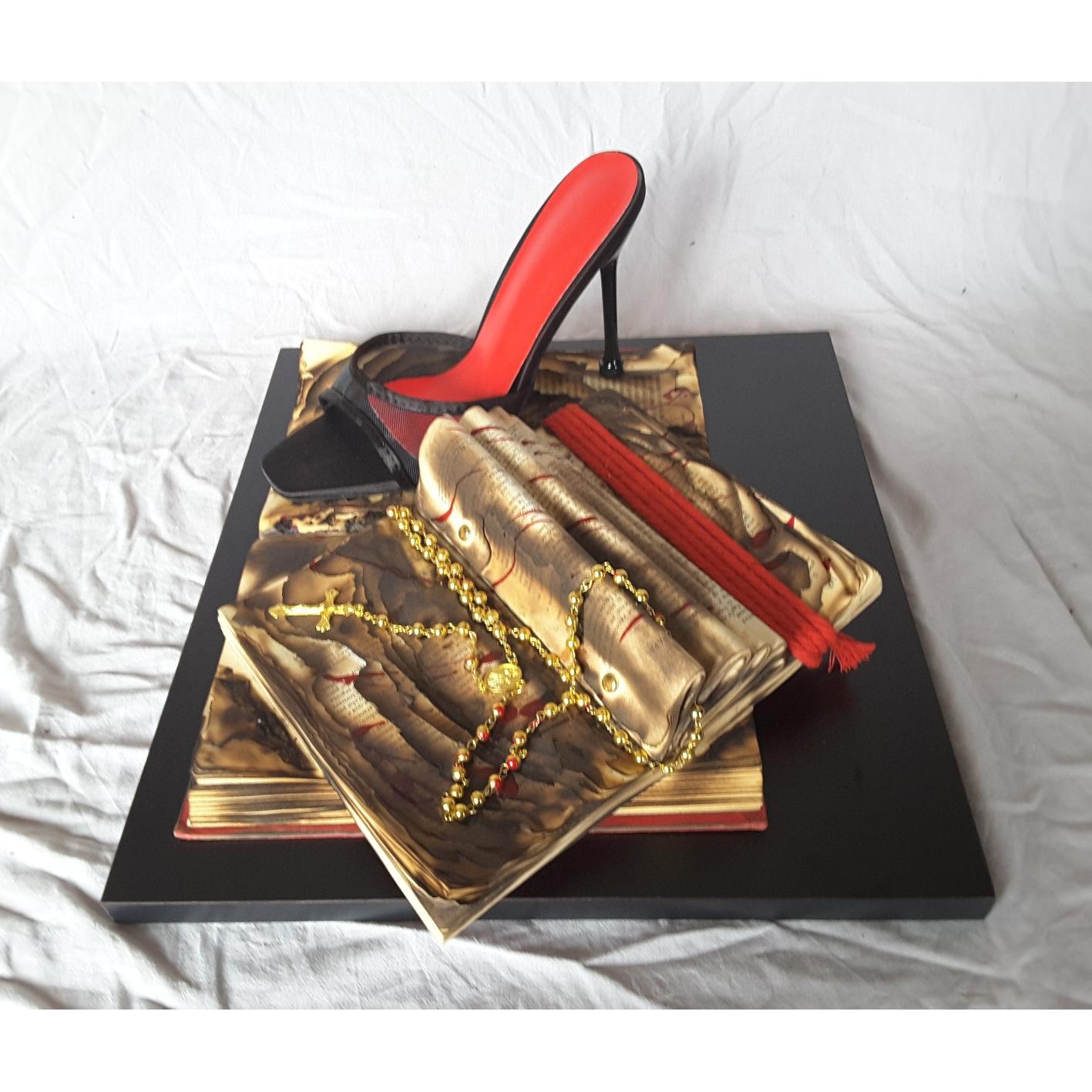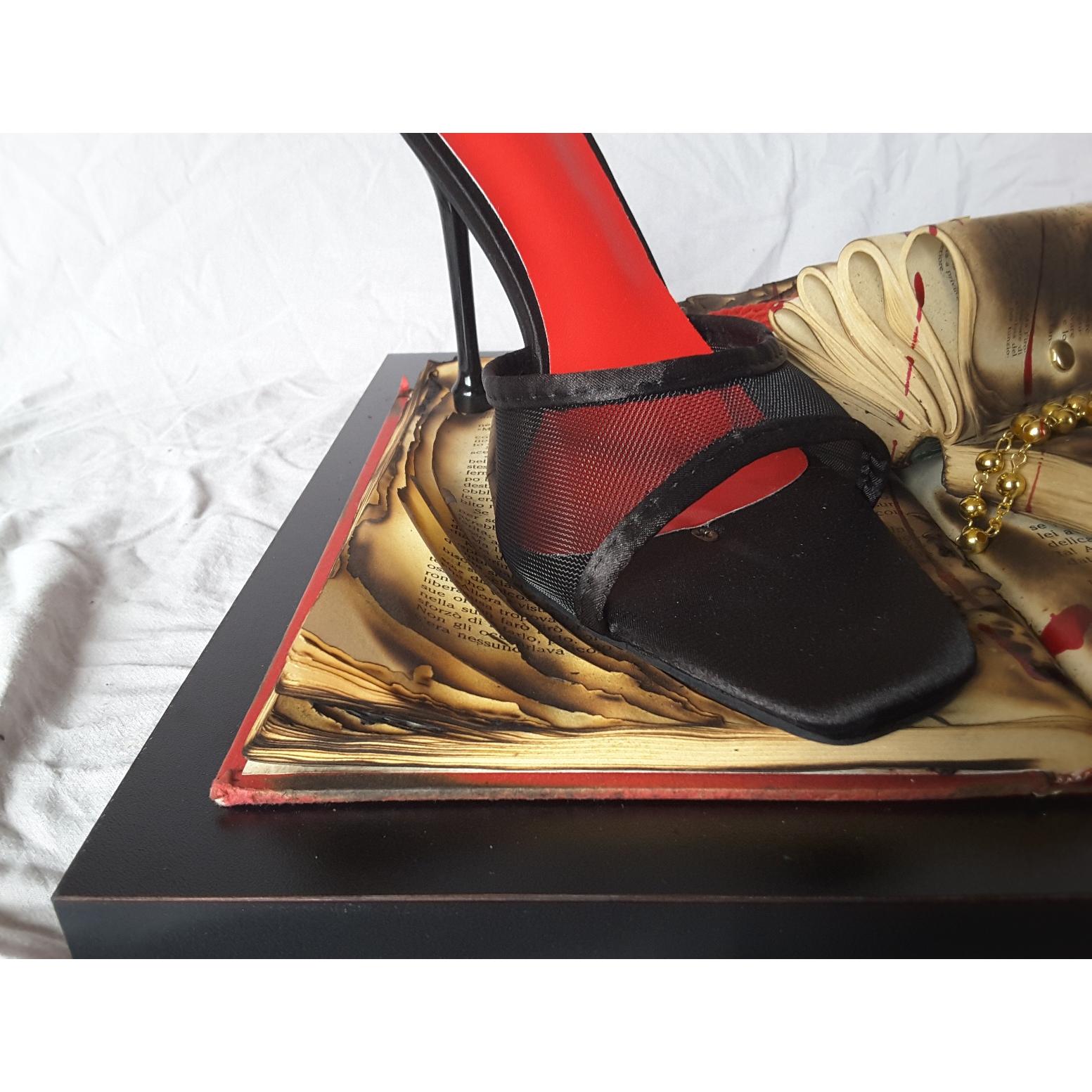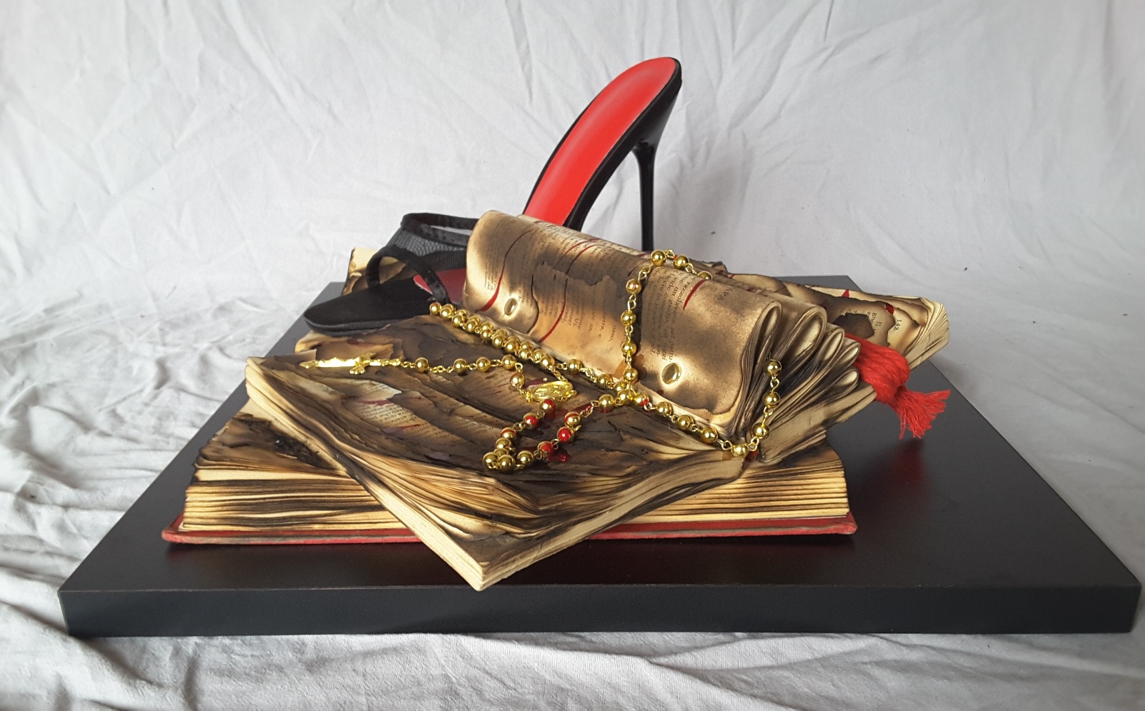 A thin heel rests on a wounded book, its pages burned, a golden rosary abandoned between the paper. Sacred belief and knowledge are brought to the same level: beneath a foot.This is not destruction — it’s a statement of power.