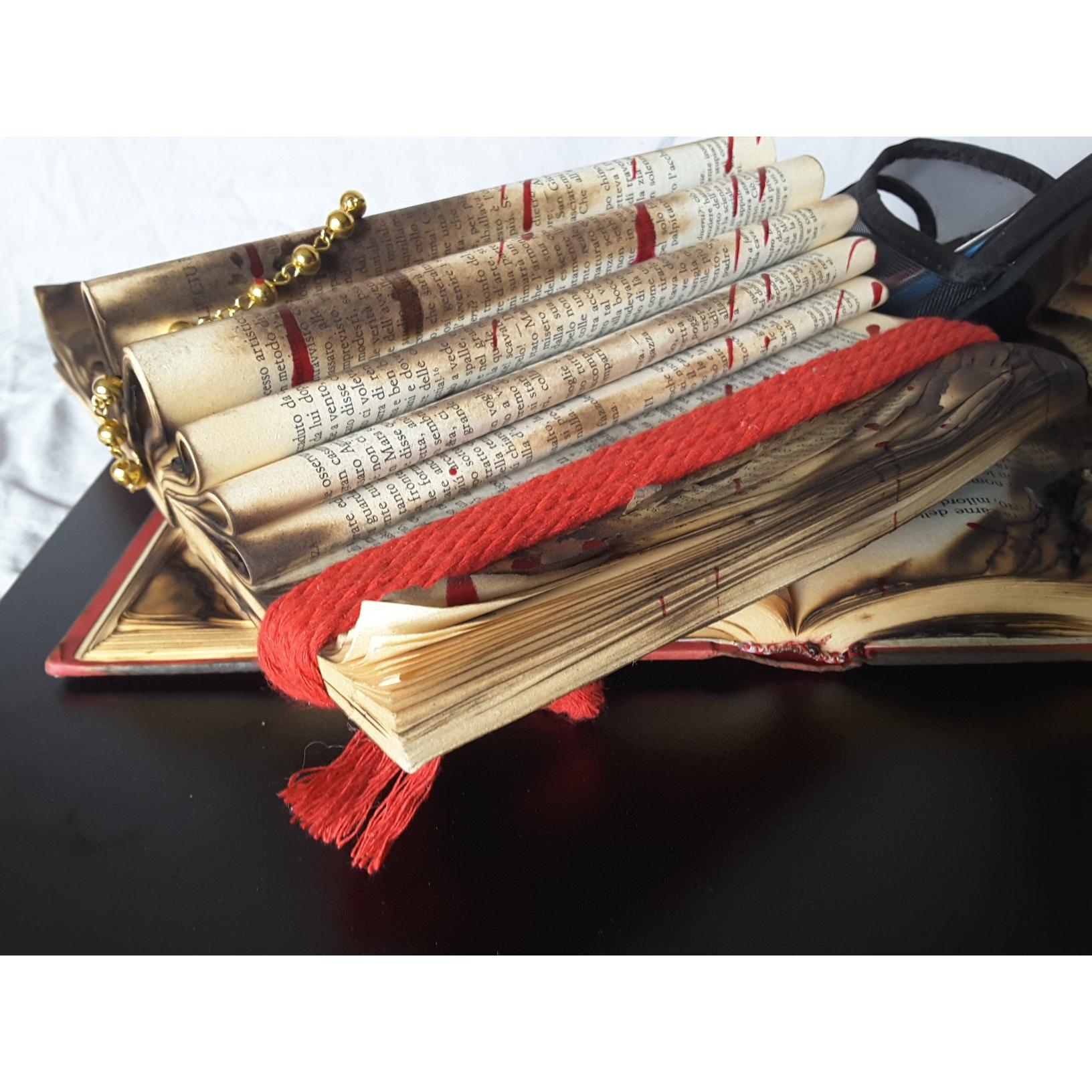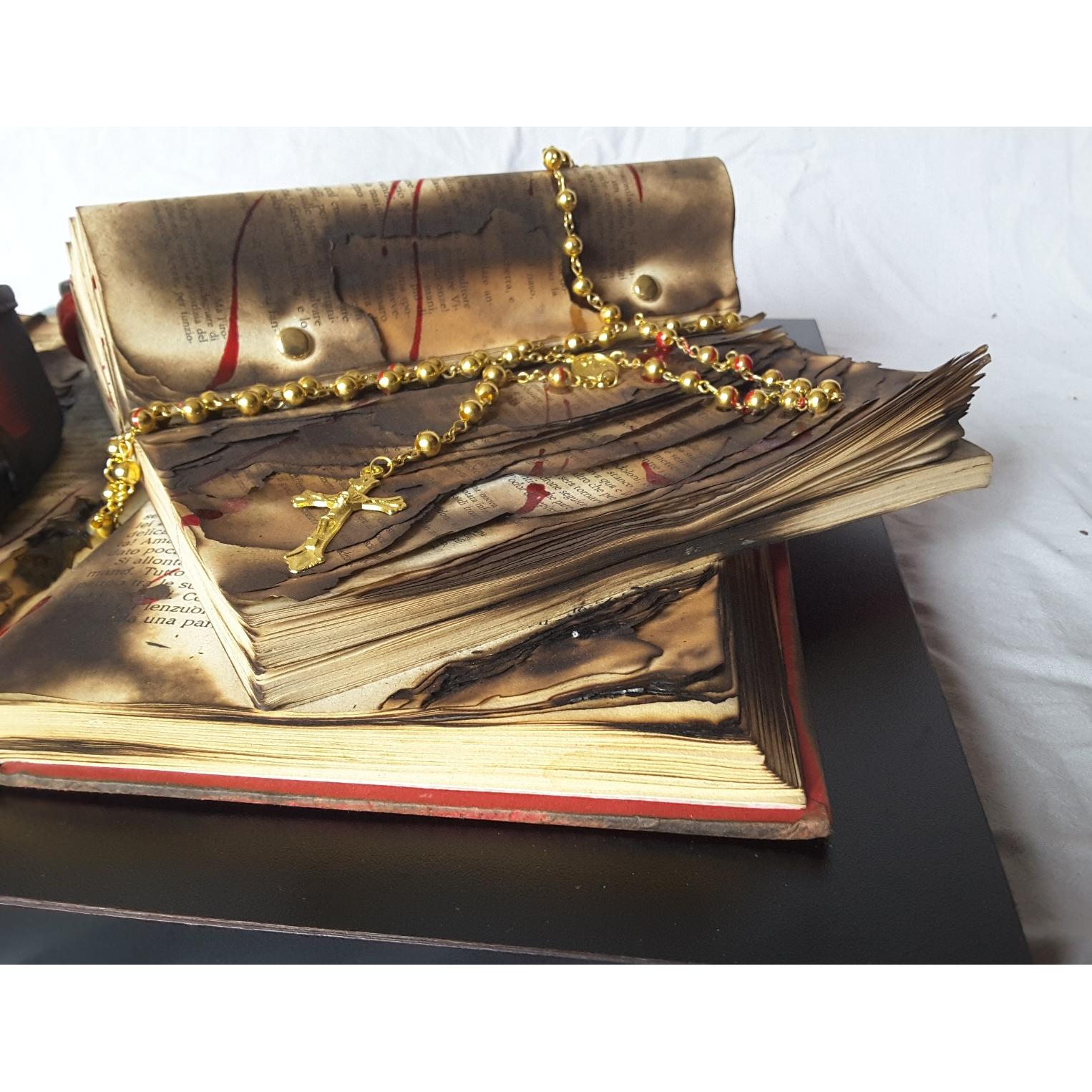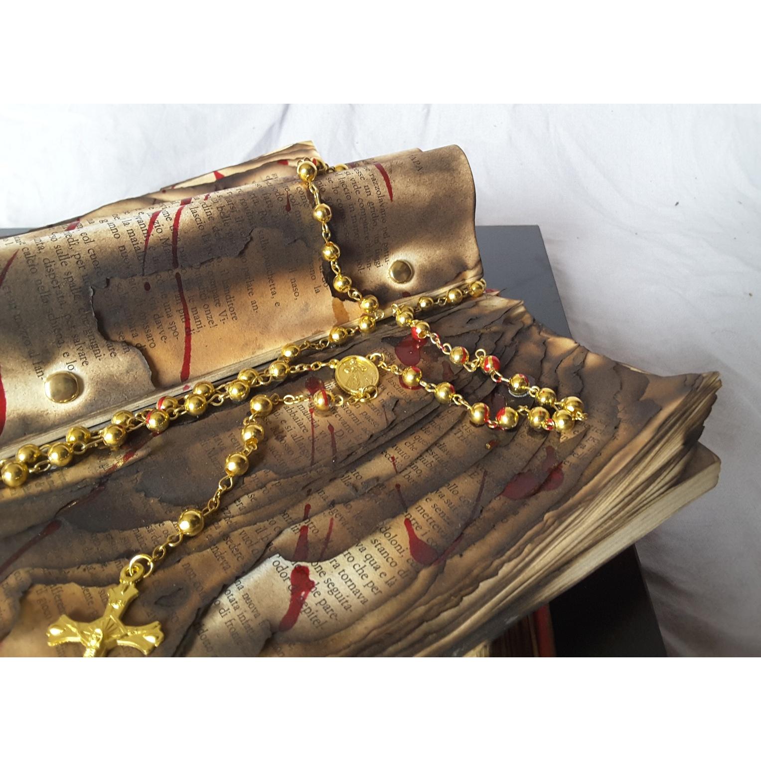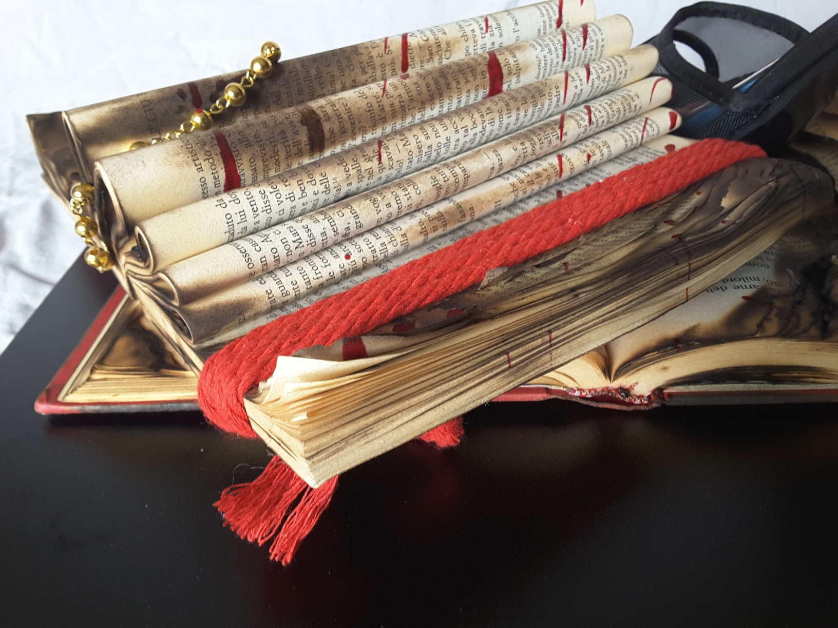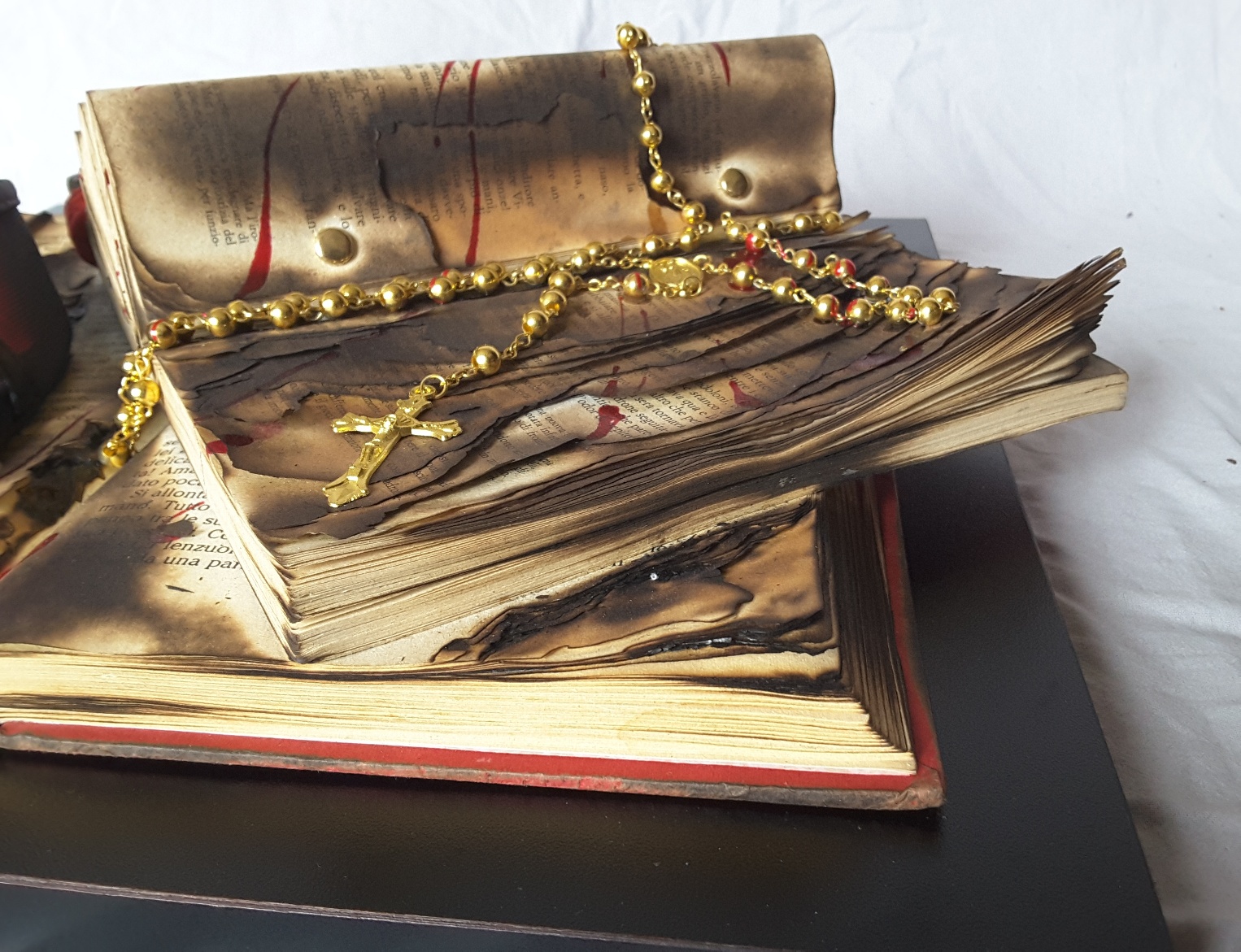 A thin heel rests on a wounded book, its pages burned, a golden rosary abandoned between the paper. Sacred belief and knowledge are brought to the same level: beneath a foot.This is not destruction — it’s a statement of power.
