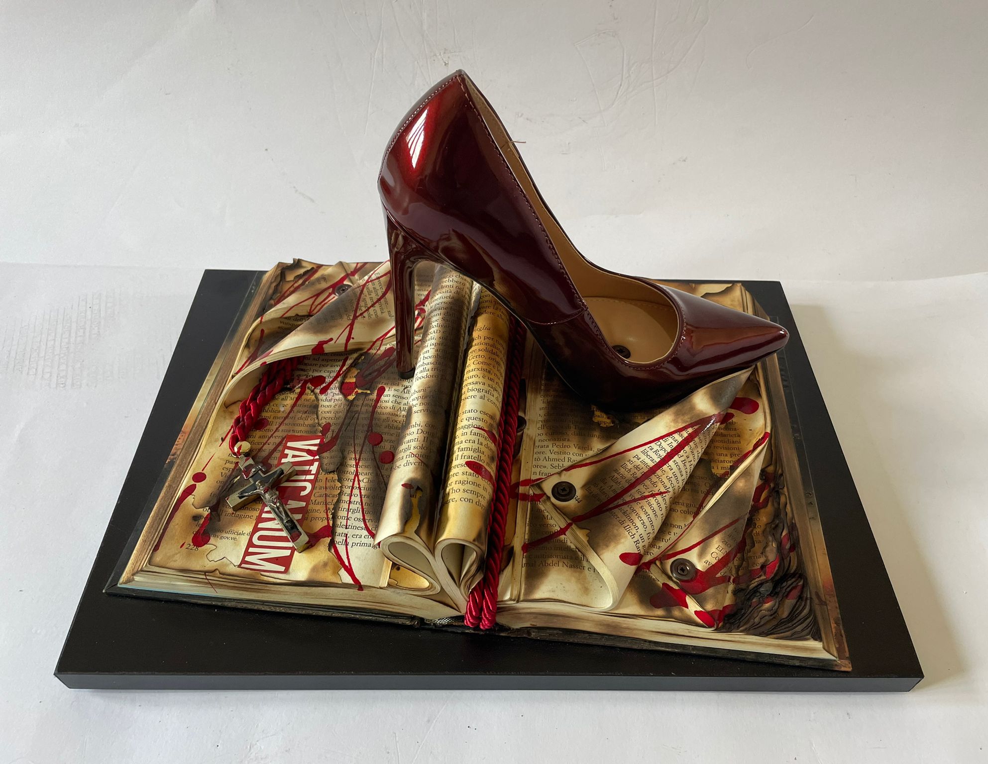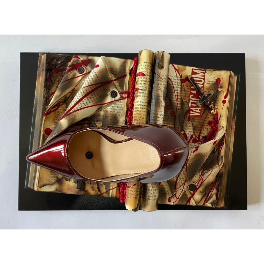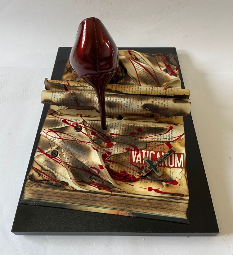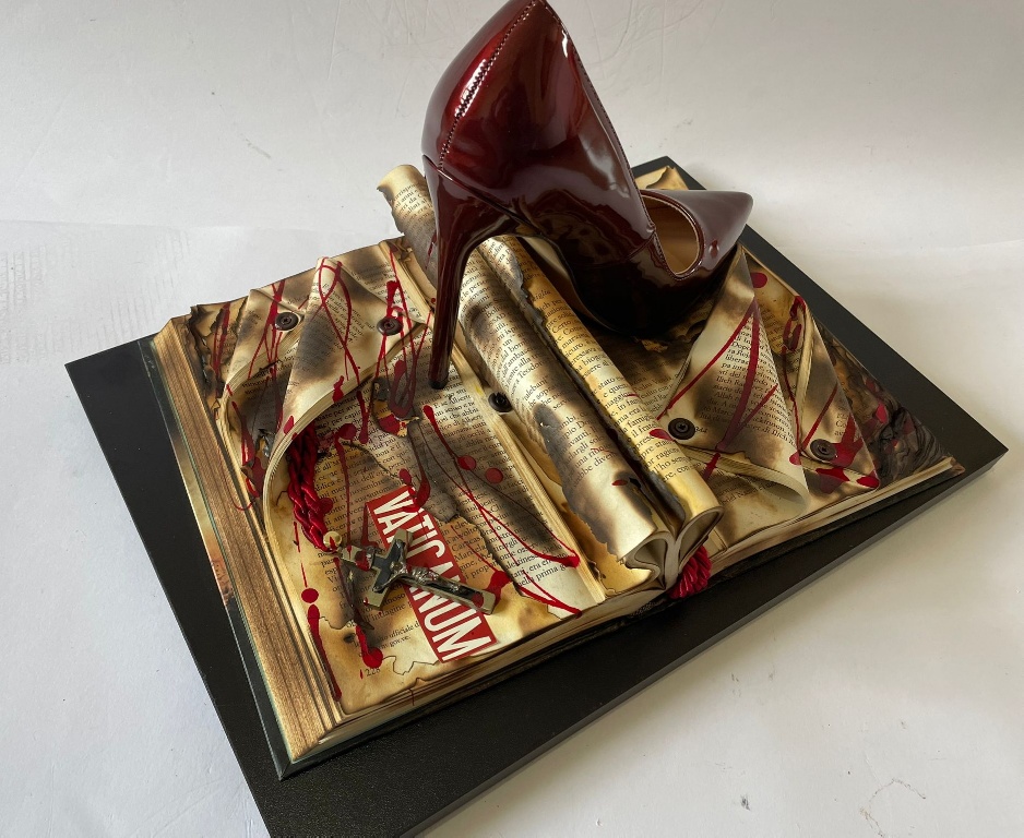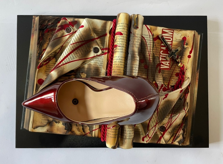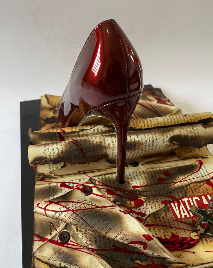 A gesture suspended between the sacred and the profane, between power and fragility. At the center of the work, a high heel rises as a symbol of presence and absence: elegant, vertical, yet at the same time unstable, like a final act before the fall. Beside it, a crucifix marks the space, severe and definitive, evoking the weight of tradition and faith, the history that bears down on individual actions.