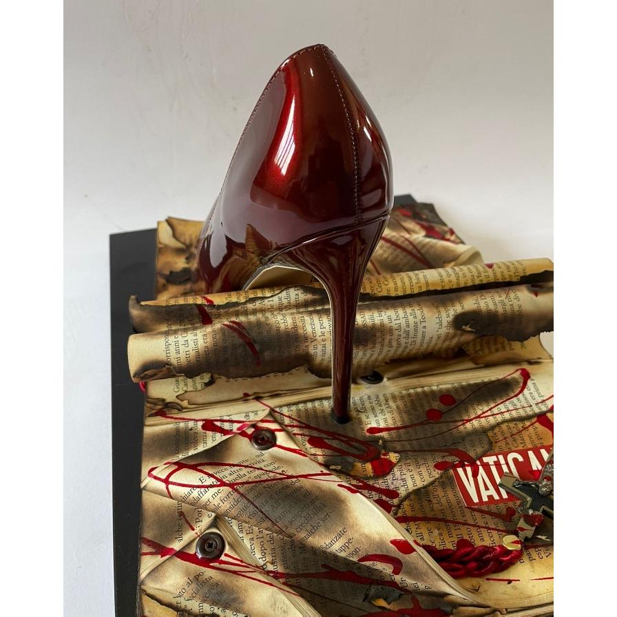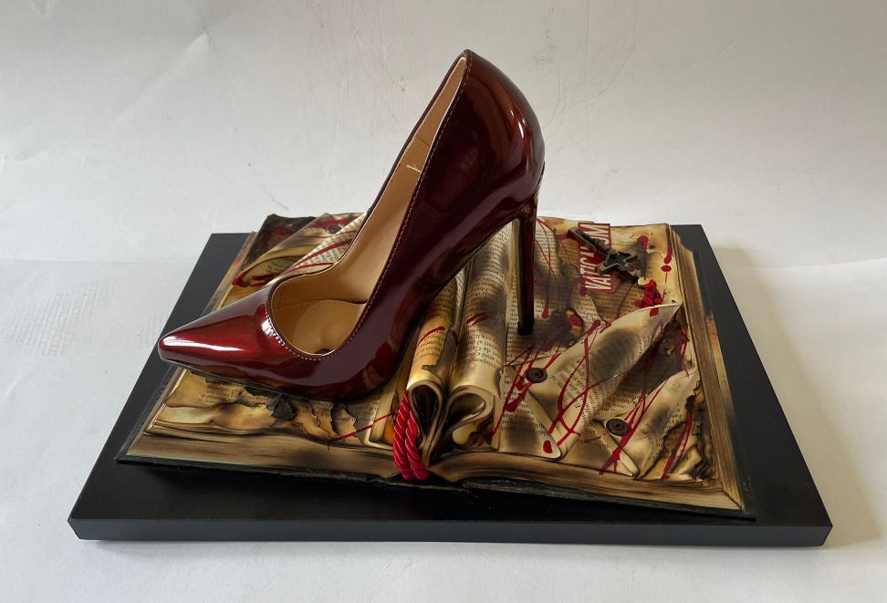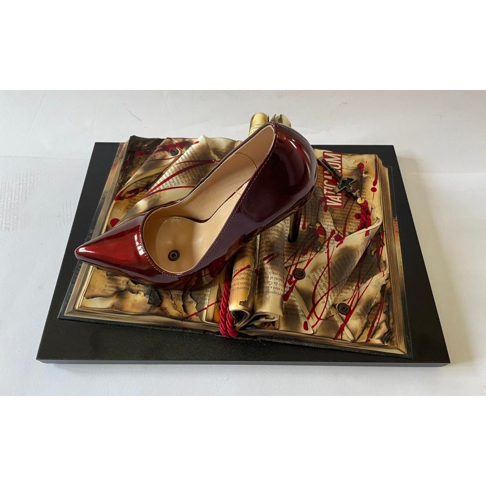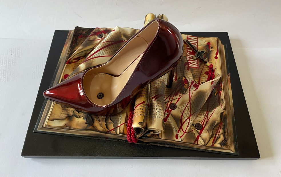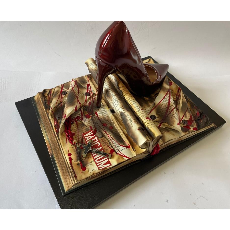 A gesture suspended between the sacred and the profane, between power and fragility. At the center of the work, a high heel rises as a symbol of presence and absence: elegant, vertical, yet at the same time unstable, like a final act before the fall. Beside it, a crucifix marks the space, severe and definitive, evoking the weight of tradition and faith, the history that bears down on individual actions.