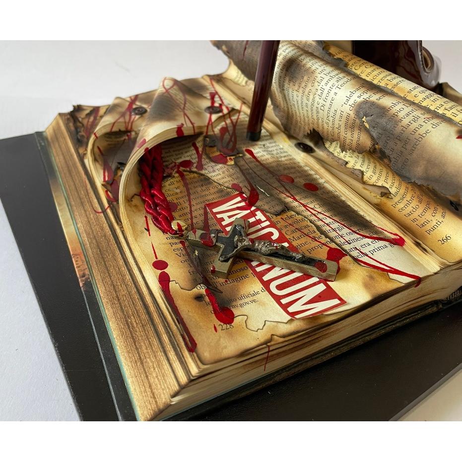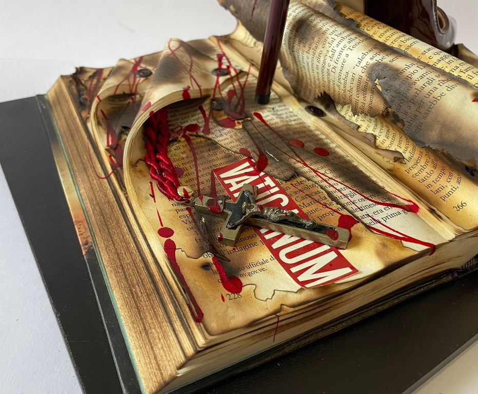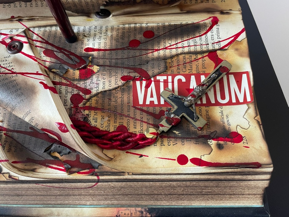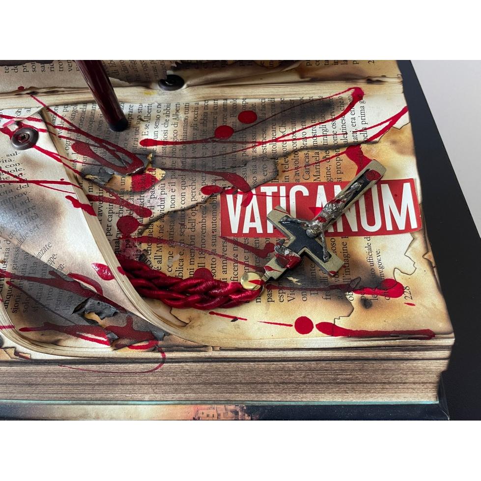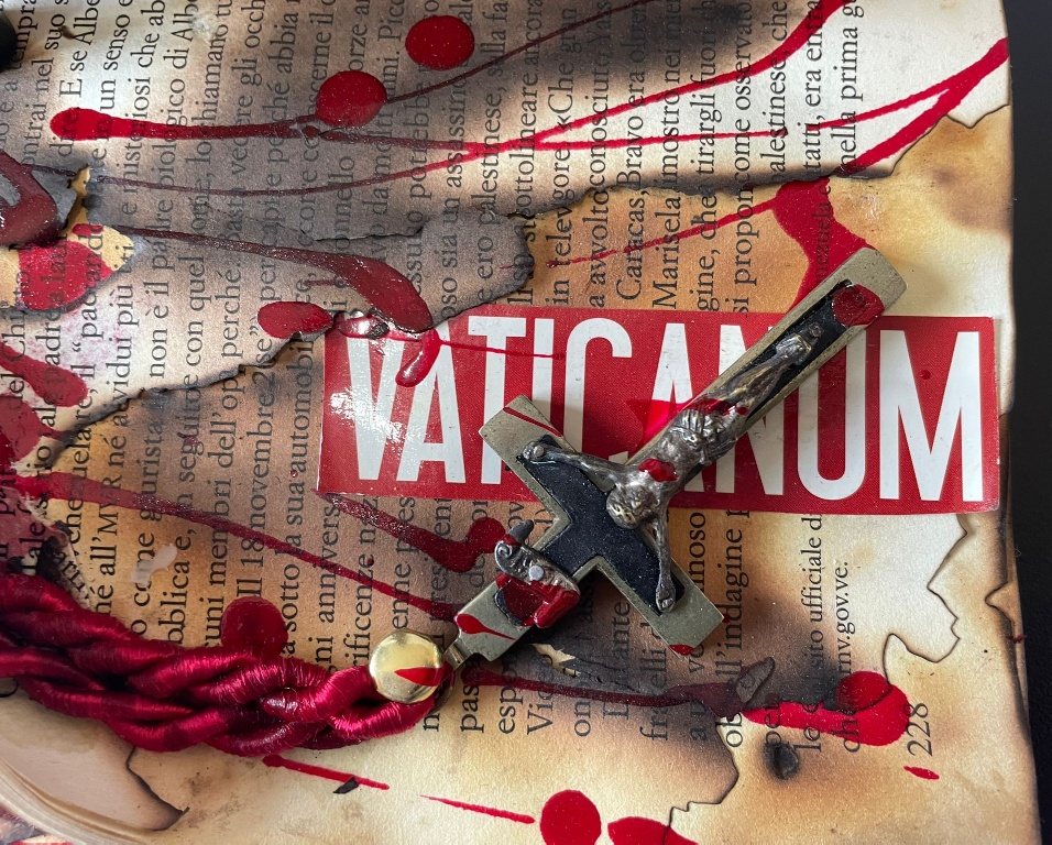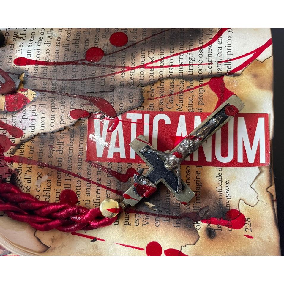 On the surface, the word Vaticanum appears like a seal, an echo of authority and memory, suspended between reverence and provocation. The combination of elements creates a visual and symbolic tension, suspended in time.