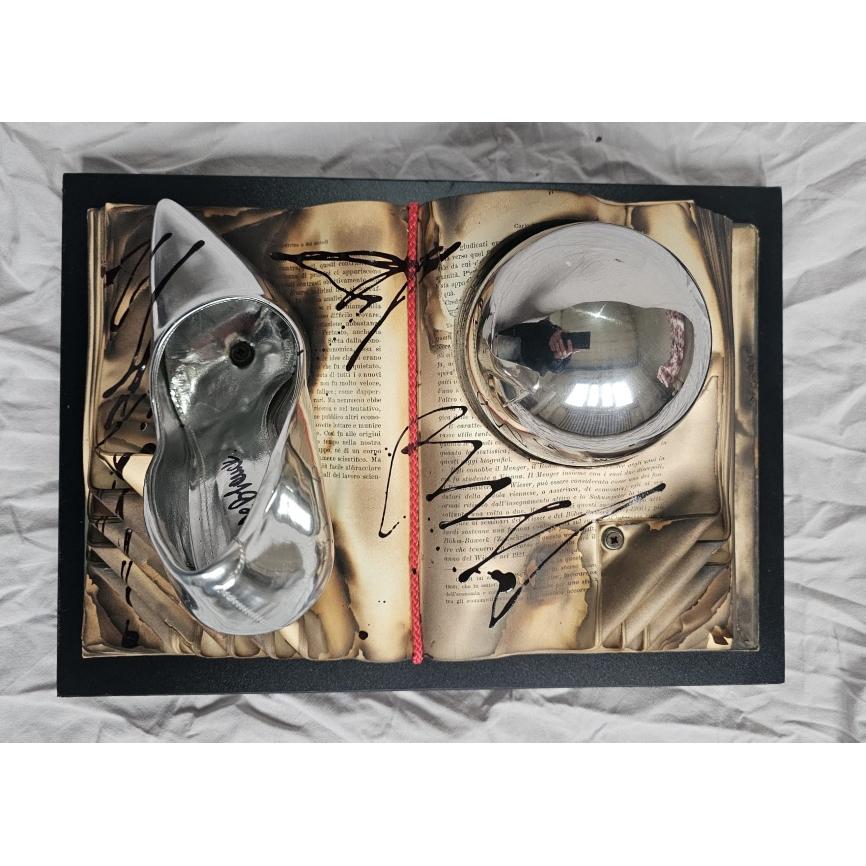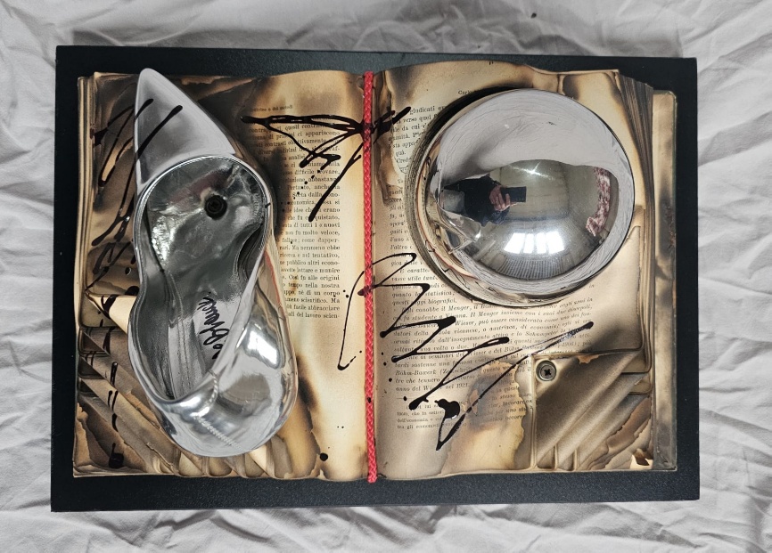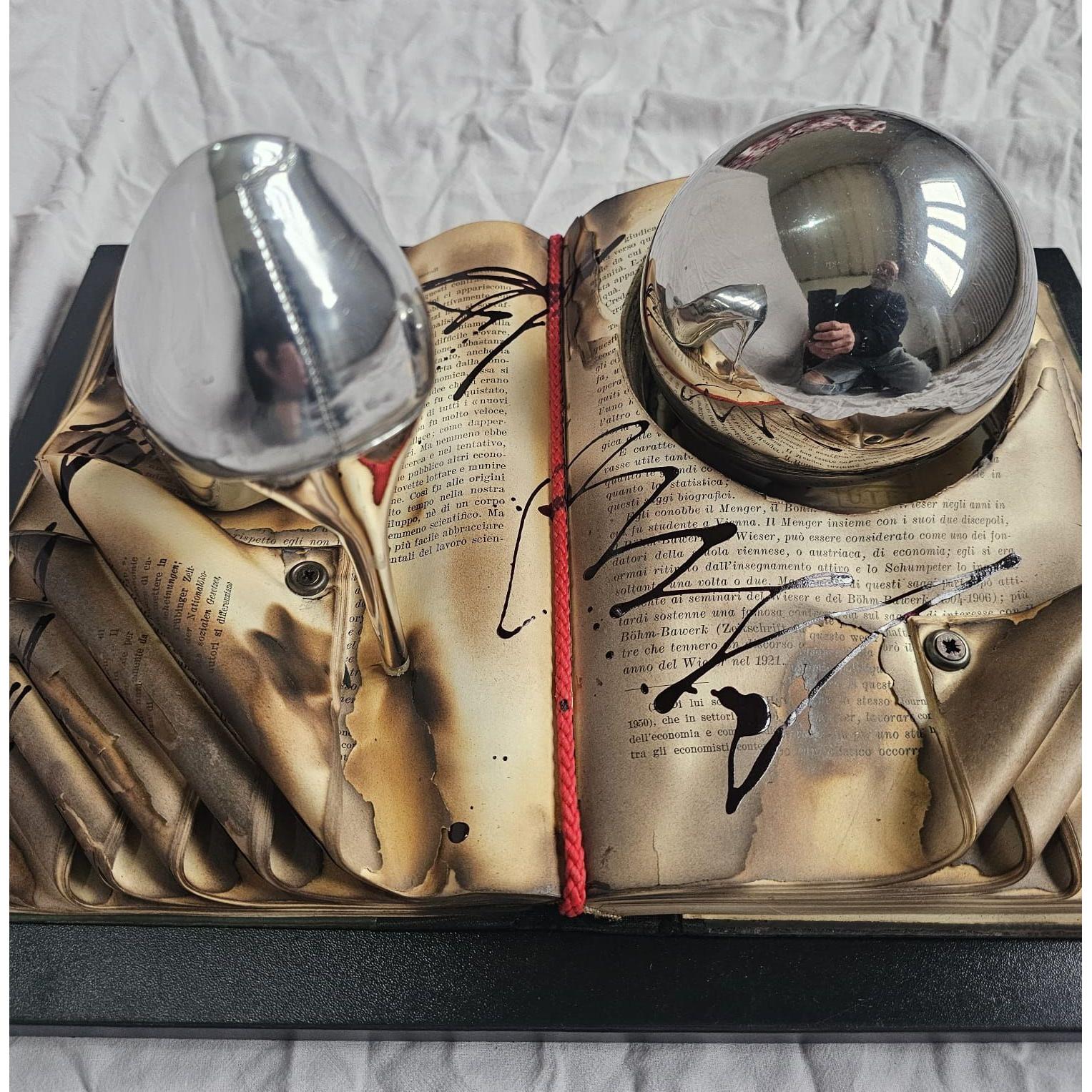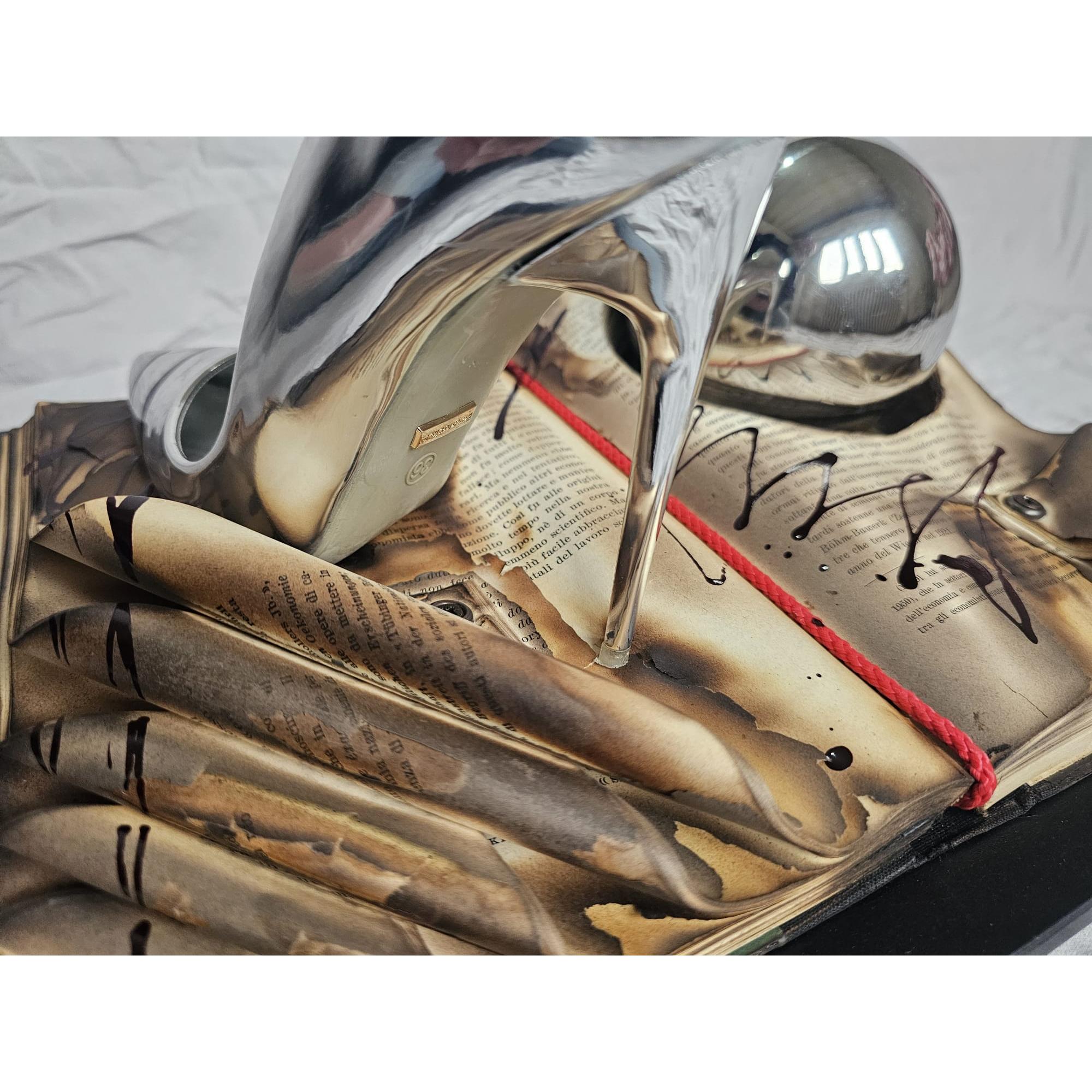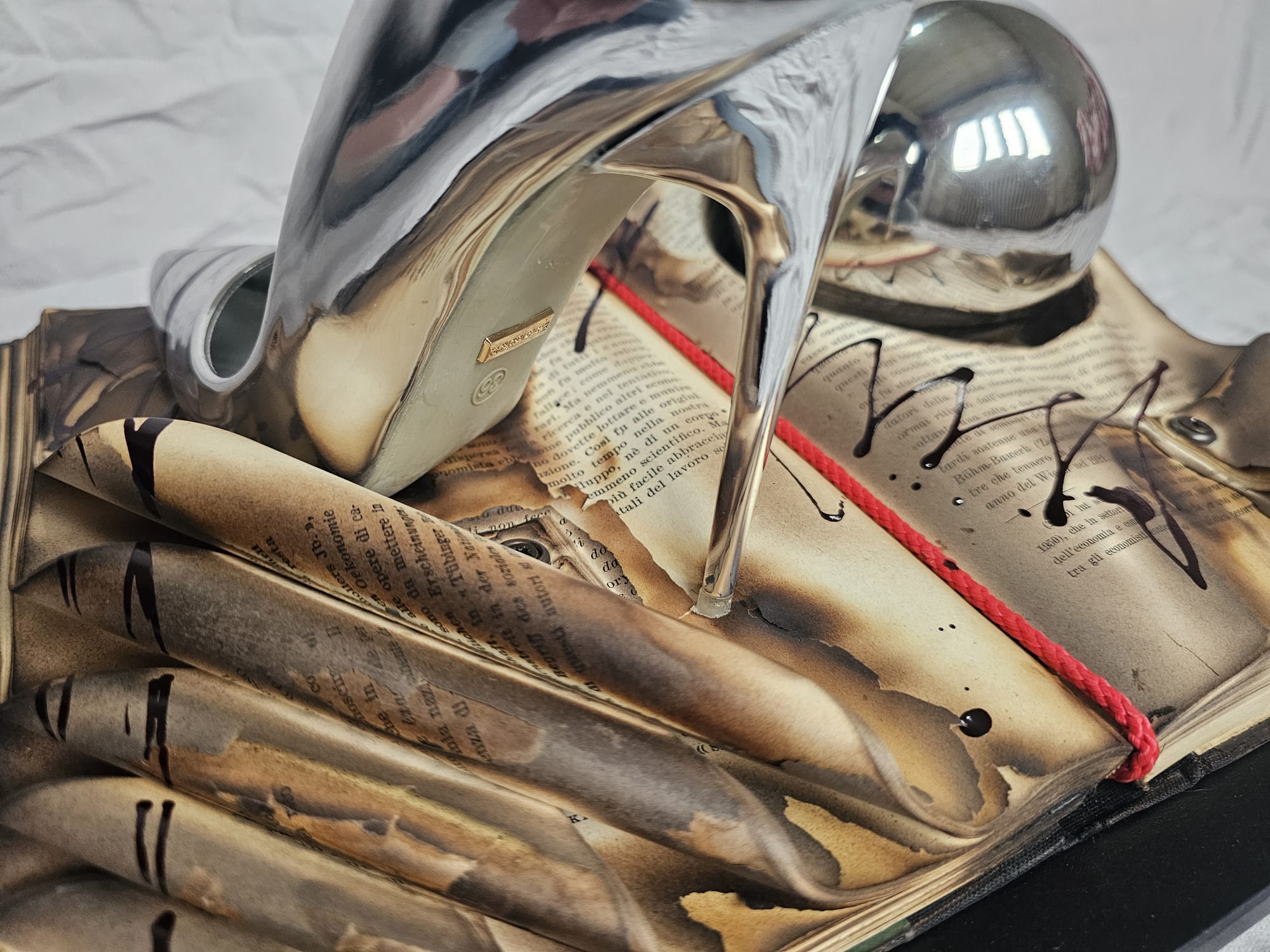 Burnt knowledge turns into invisible ash beneath the metallic shine, while desire takes the shape of something that cannot be touched without distorting it.