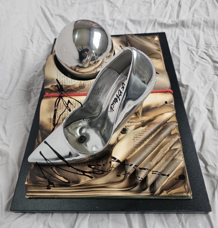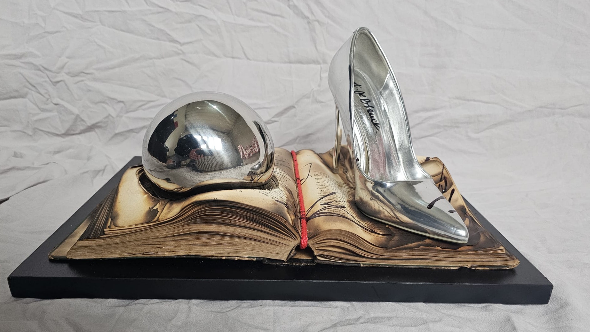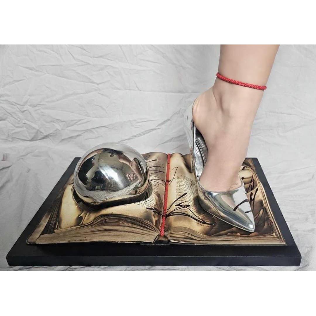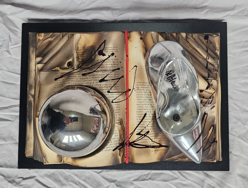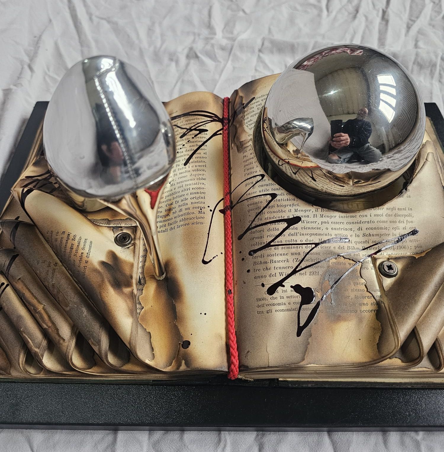 Burnt knowledge turns into invisible ash beneath the metallic shine, while desire takes the shape of something that cannot be touched without distorting it.