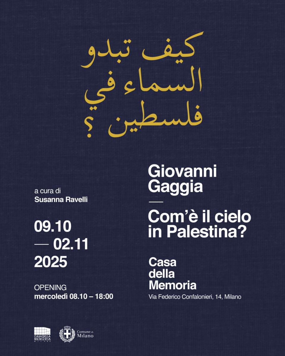 La Casa della Memoria di Milano accoglie, dal 9 ottobre al 2 novembre 2025, la personale di Giovanni Gaggia Com’è il cielo in Palestina? a cura di Susanna Ravelli e la direzione generale di Maria Fratelli. L’allestimento della mostra si intreccia con la struttura degli archivi verticali presenti in sede, proponendo una riflessione civile e poetica sull’urgenza etica di prendere posizione attraverso l’arte contemporanea.