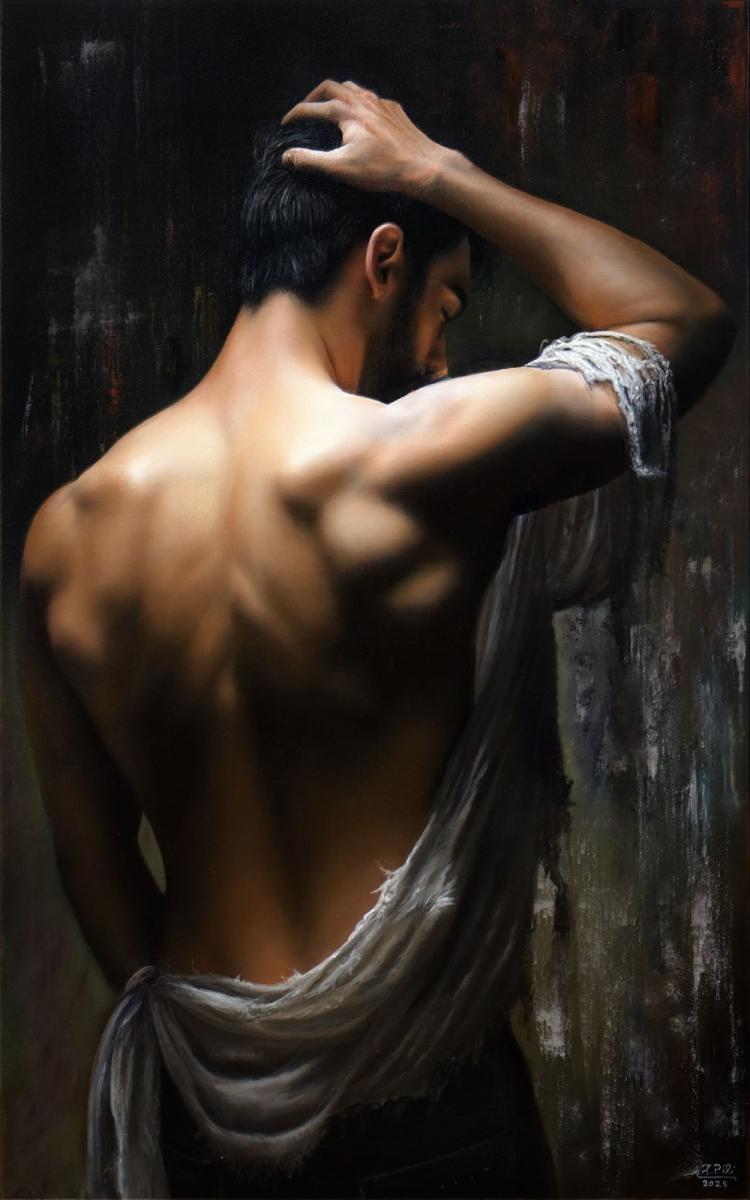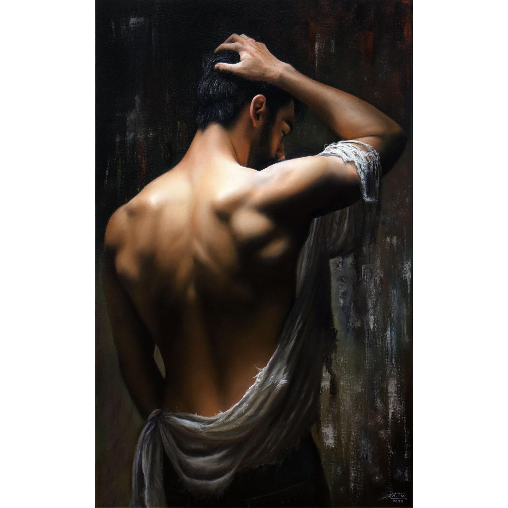 The figure is deliberately turned away, denying the viewer any direct access to identity.